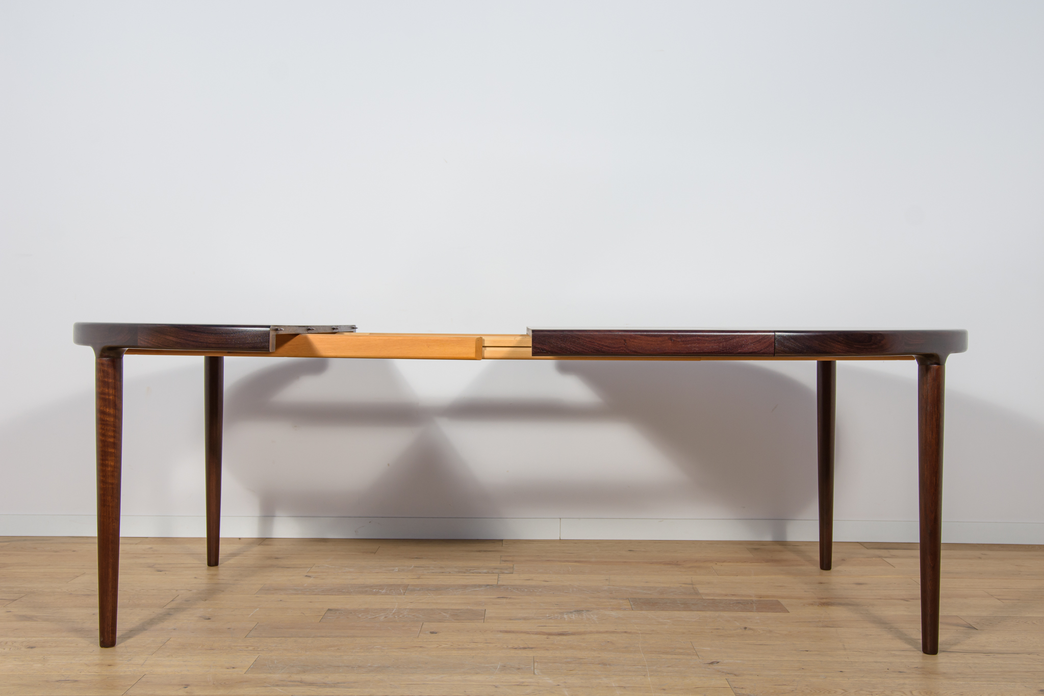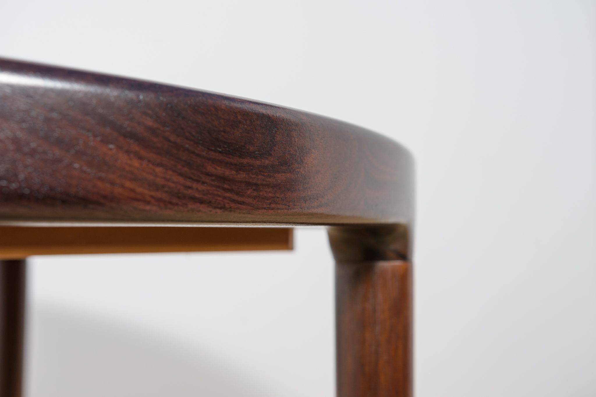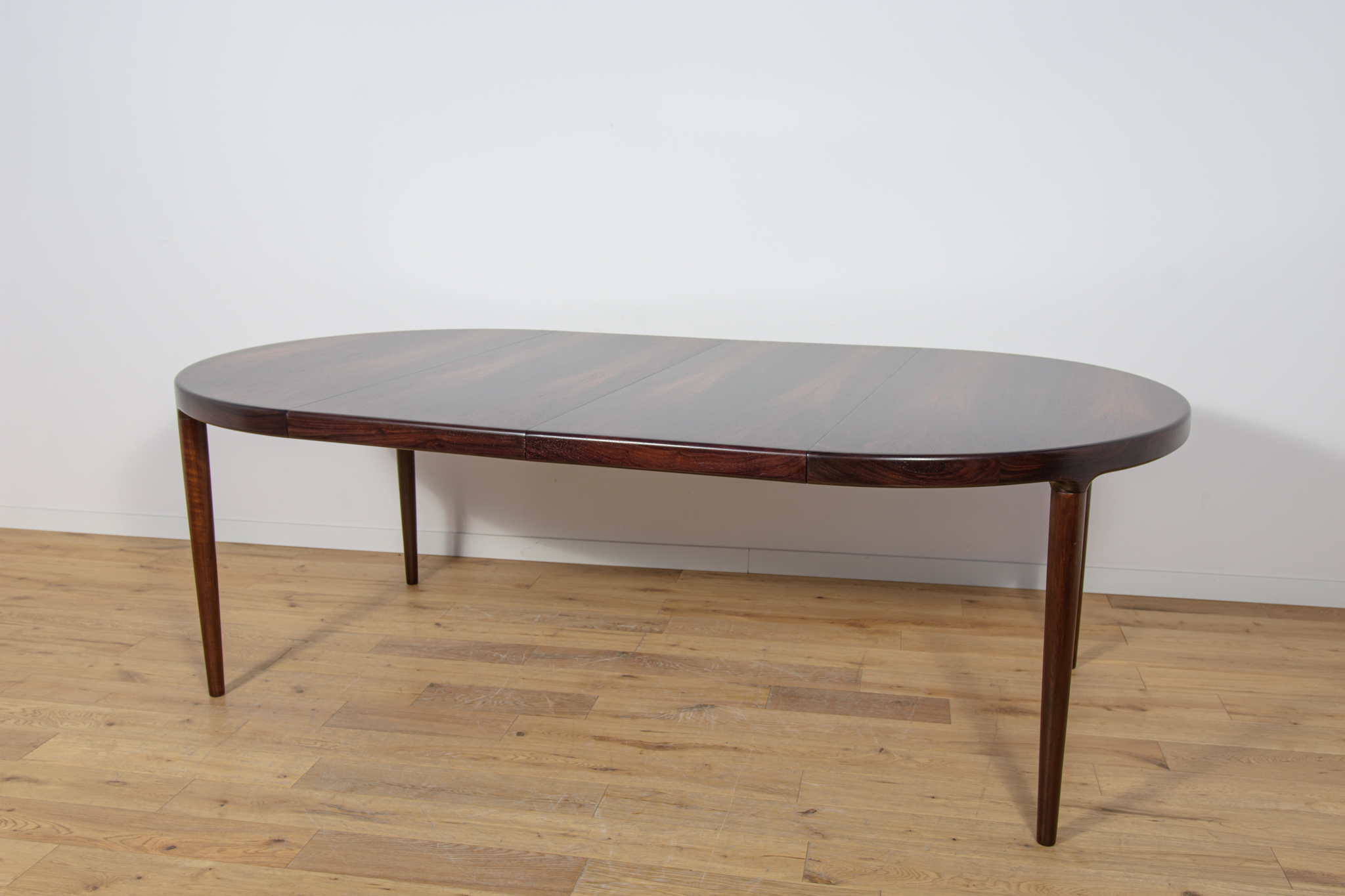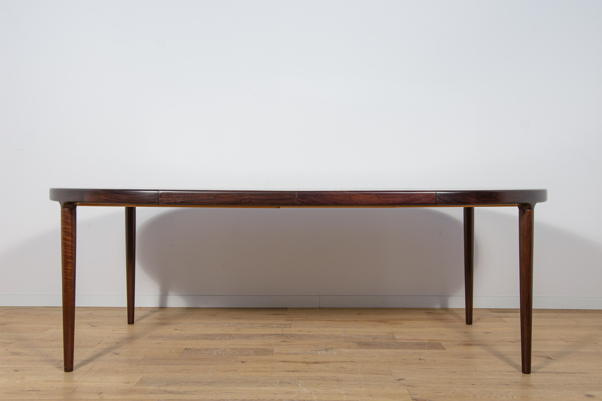 Okrągły rozkładany stół z drewna palisandrowego został wyprodukowany w Danii w latach 60. Stół o wysokim kunsztownie projektu i wykonania, świadczą o tym wyprofilowane solidne obrzeża i nogi. Mebel po kompleksowej renowacji stolarskiej, oczyszczony ze starej powłoki, barwiony bejcą w kolorze palisandrowym, wykończony mocnym półmatowym lakierem. Stół rozkłada z 120 cm- do 170 cm do 220 cm.