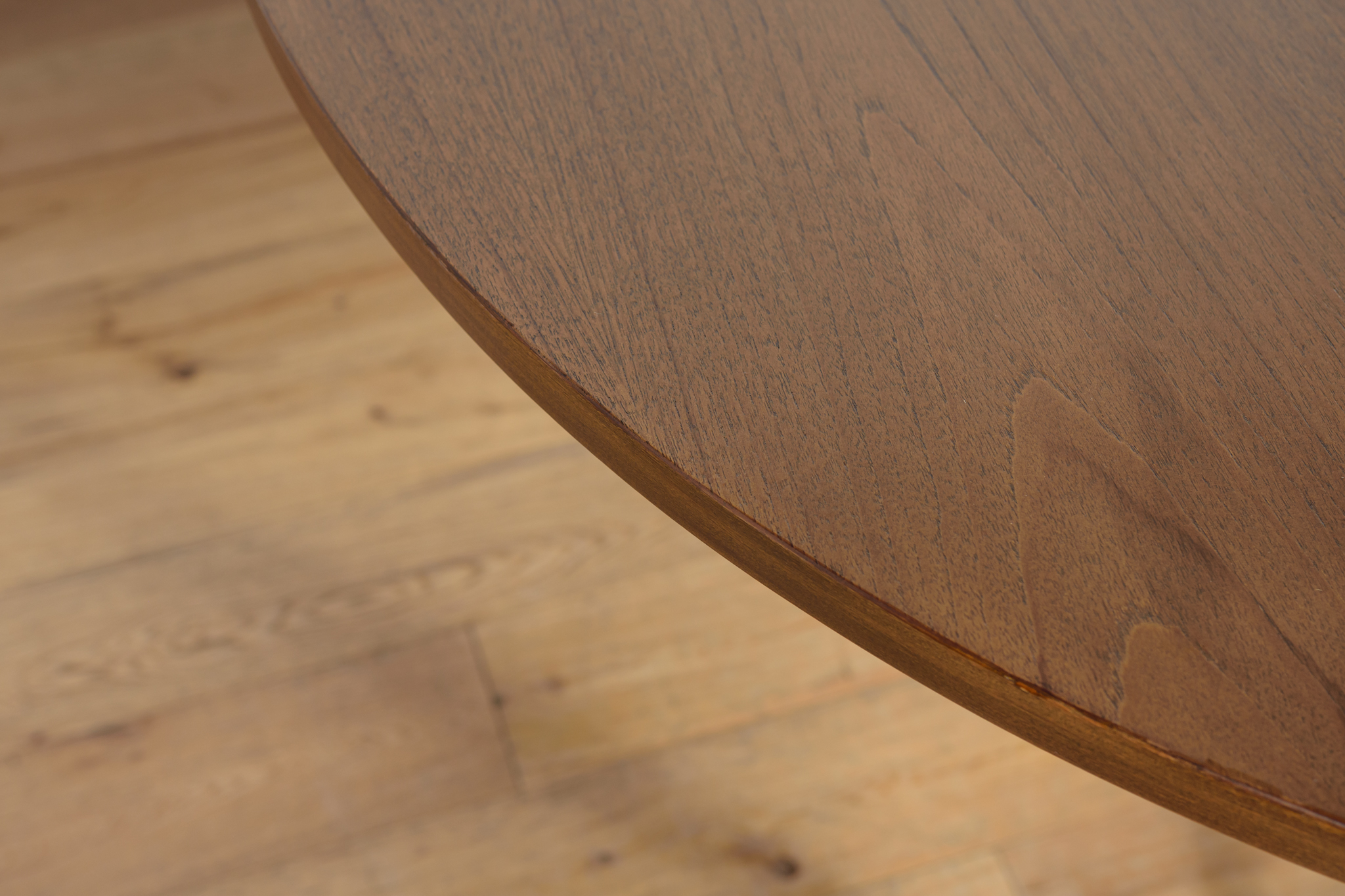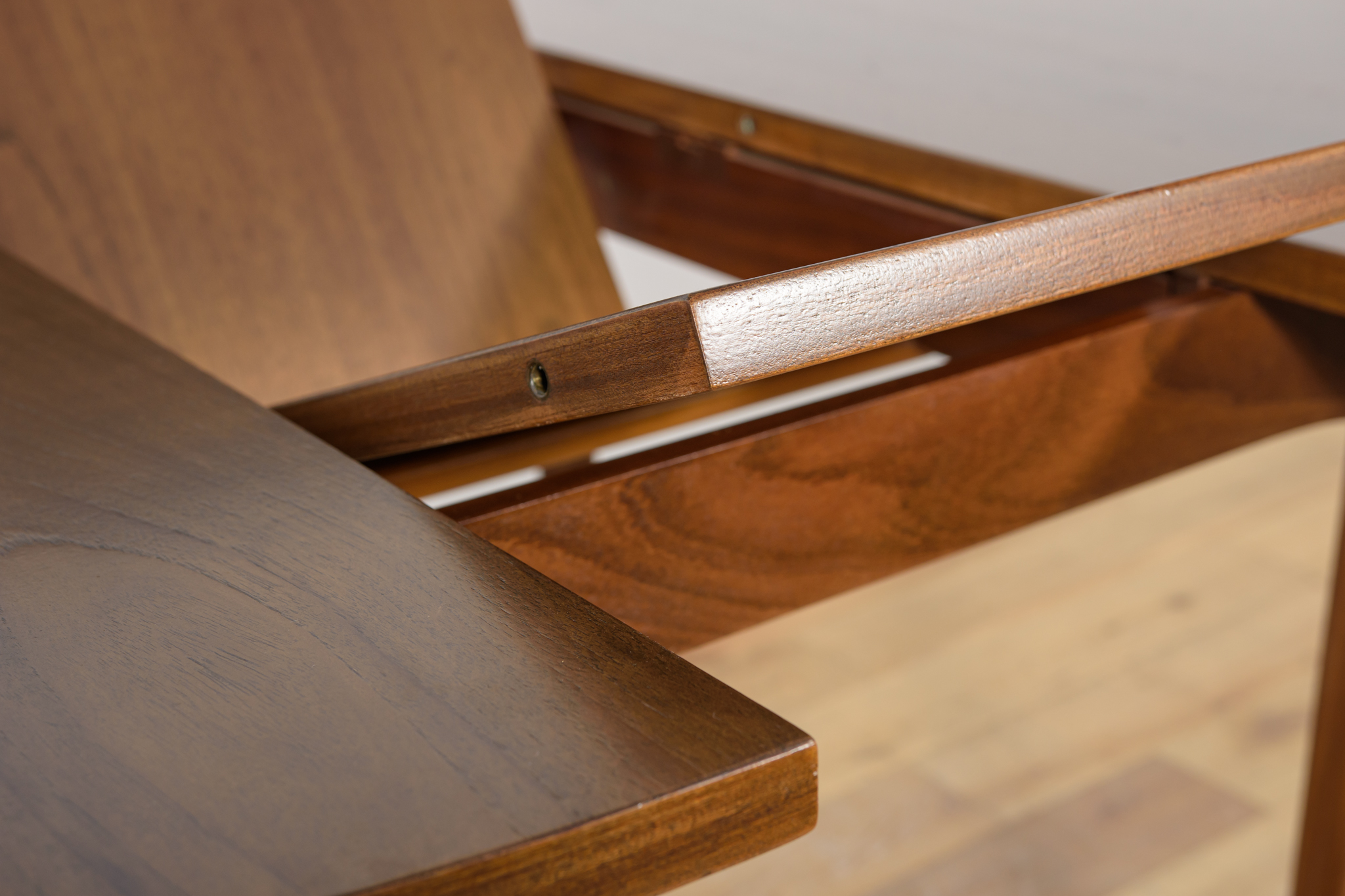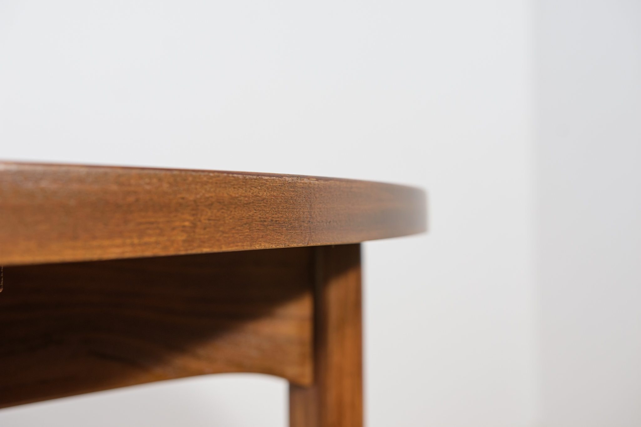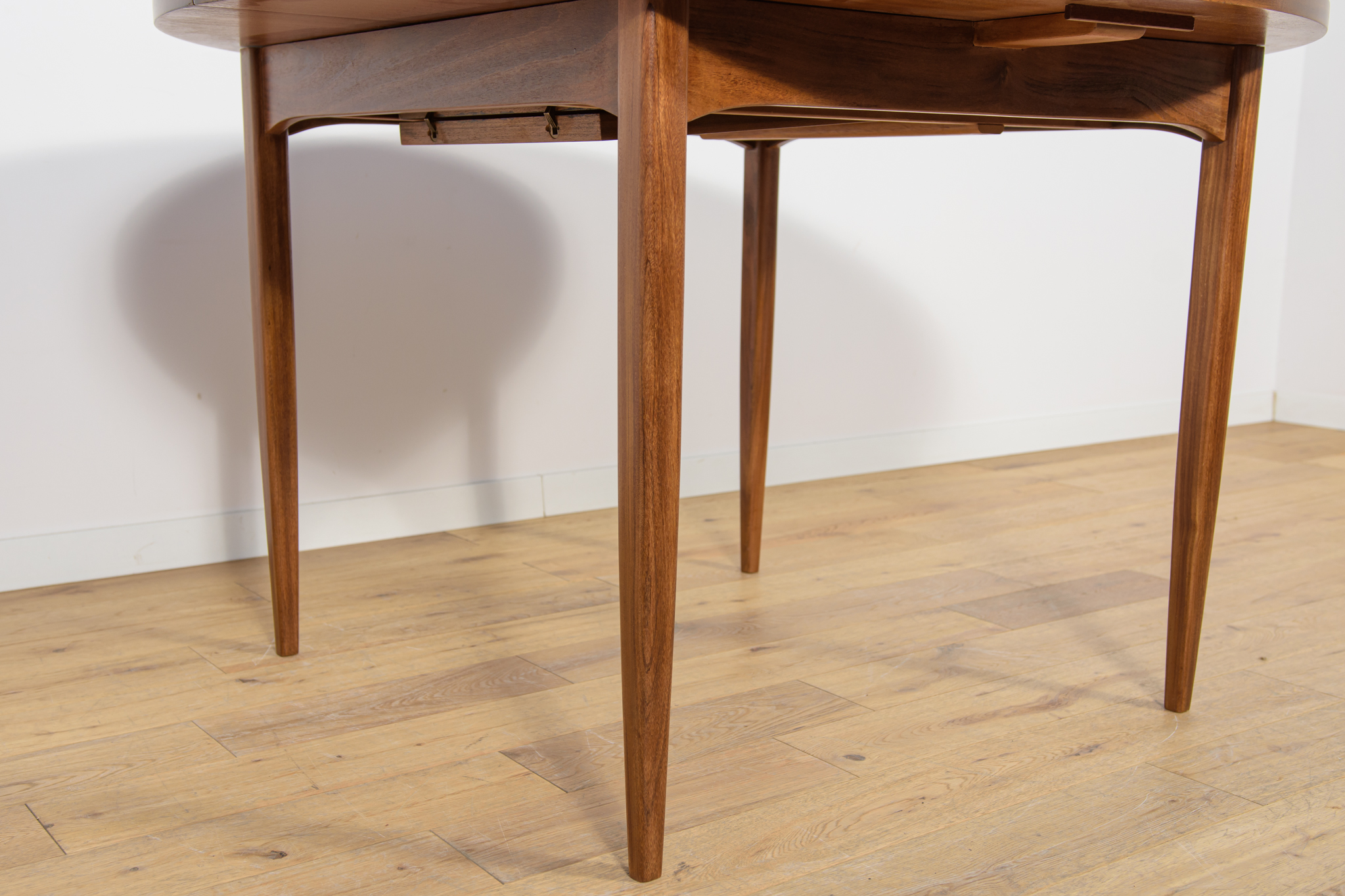 Rozkładany stół został wyprodukowany w latach 60., w brytyjskiej manufakturze G- Plan. Mebel tekowy o okrągłym kształcie jest po profesjonalnej renowacji stolarskiej. Został oczyszczony ze starej powierzchni, barwiony bejcą orzechową, wykończony mocnym półmatowym mocnym lakierem. Stół posiada mechanizm ułatwiający rozłożenie.