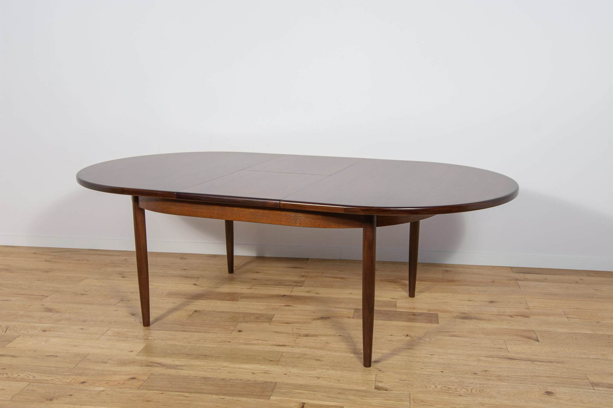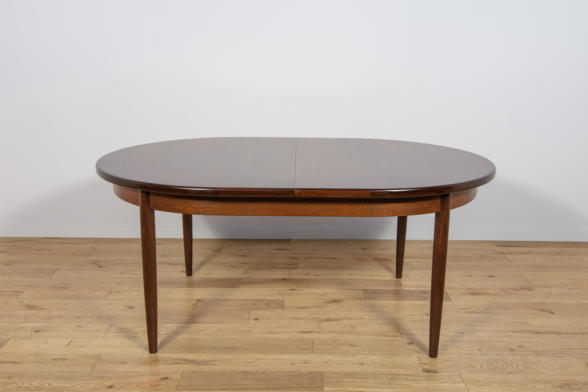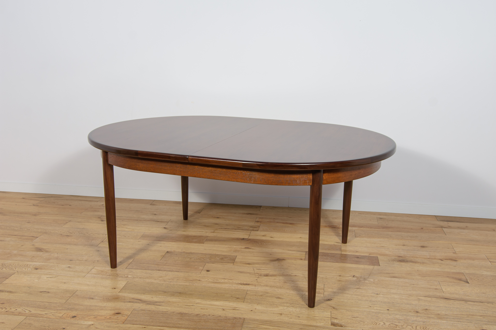 Rozkładany stół został wyprodukowany w latach 60., w brytyjskiej manufakturze G- Plan. Stół posiada wyprofilowane, wzmacniane krawędzie. Mebel tekowy o owalnym kształcie jest po profesjonalnej renowacji stolarskiej. Został oczyszczony ze starej powierzchni, barwiony bejcą palisandrową, wykończony mocnym półmatowym lakierem. Stół posiada mechanizm ułatwiający rozkładanie do 209 cm.