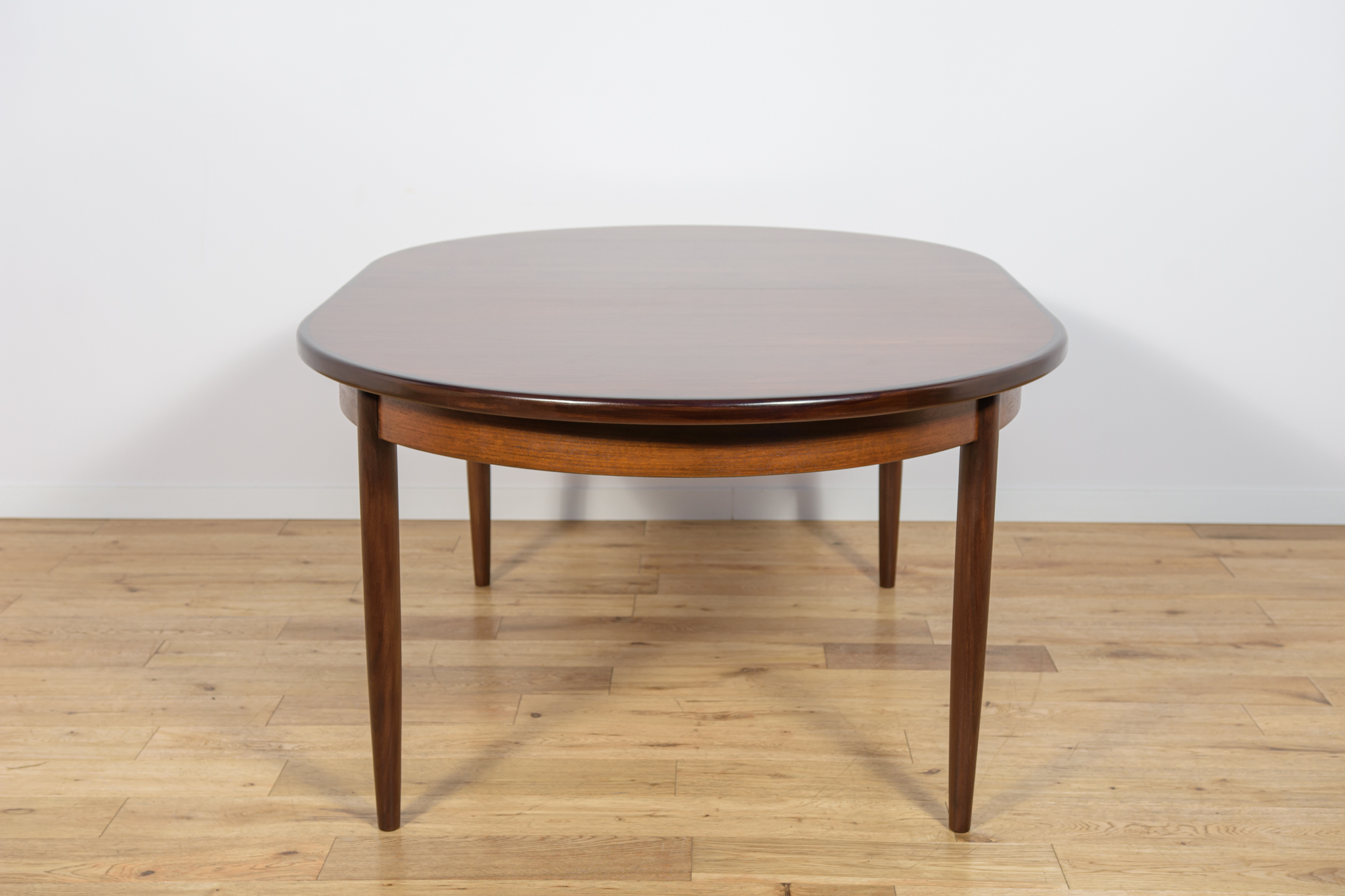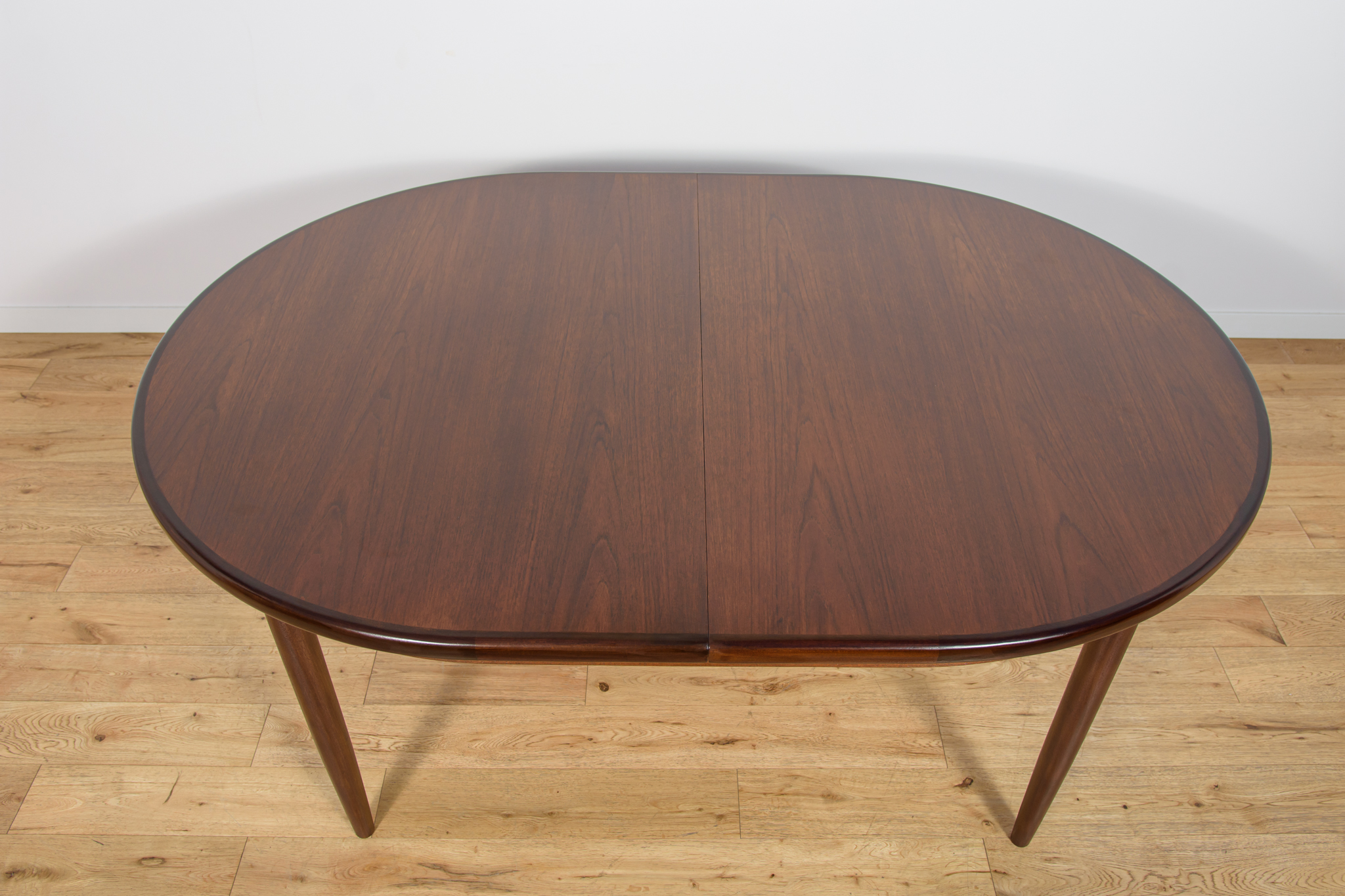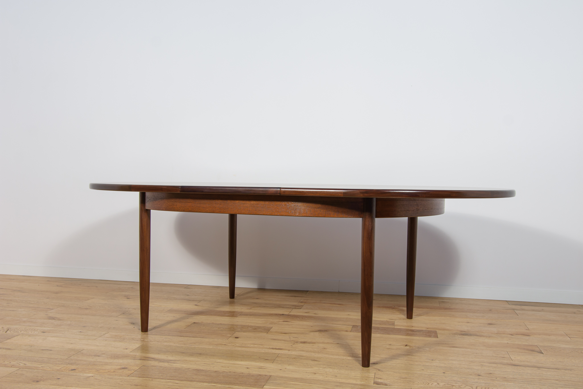Rozkładany stół został wyprodukowany w latach 60., w brytyjskiej manufakturze G- Plan. Stół posiada wyprofilowane, wzmacniane krawędzie. Mebel tekowy o owalnym kształcie jest po profesjonalnej renowacji stolarskiej. Został oczyszczony ze starej powierzchni, barwiony bejcą palisandrową, wykończony mocnym półmatowym lakierem. Stół posiada mechanizm ułatwiający rozkładanie do 209 cm.