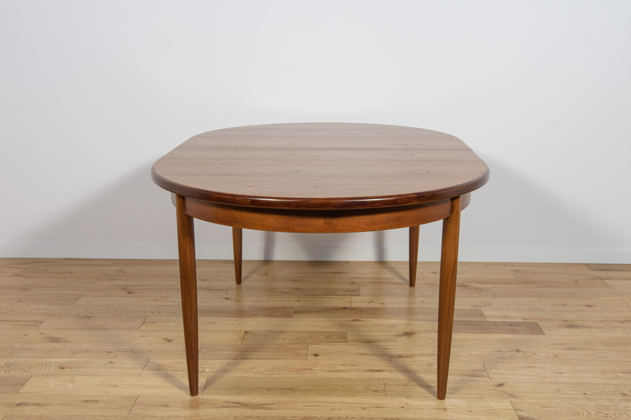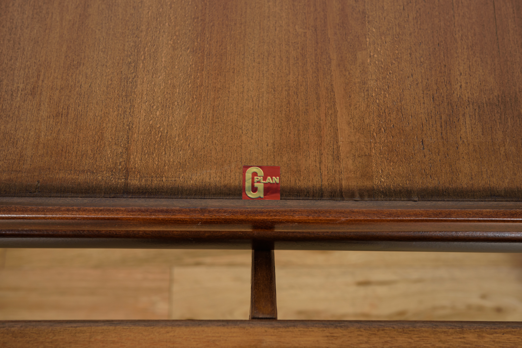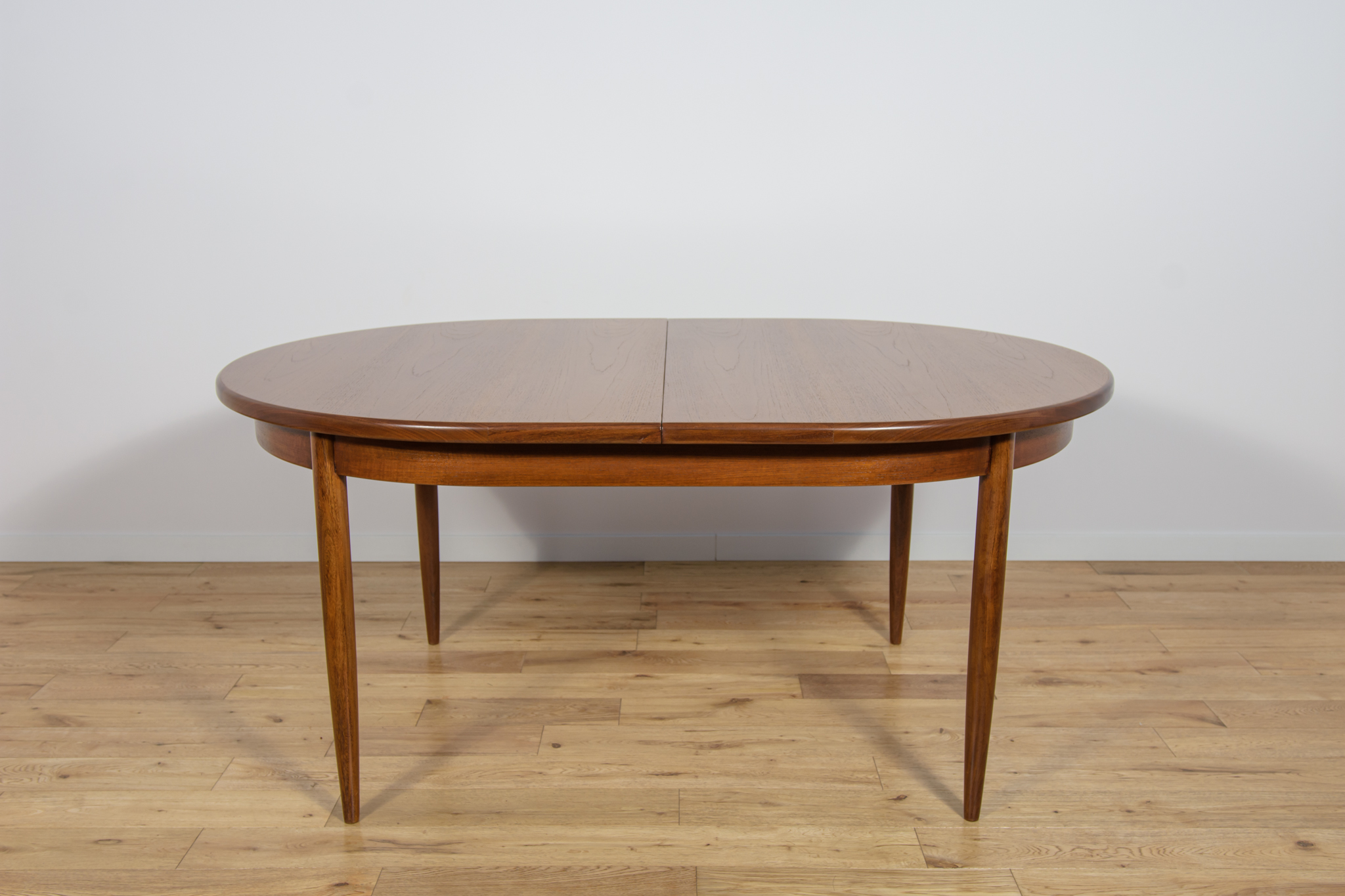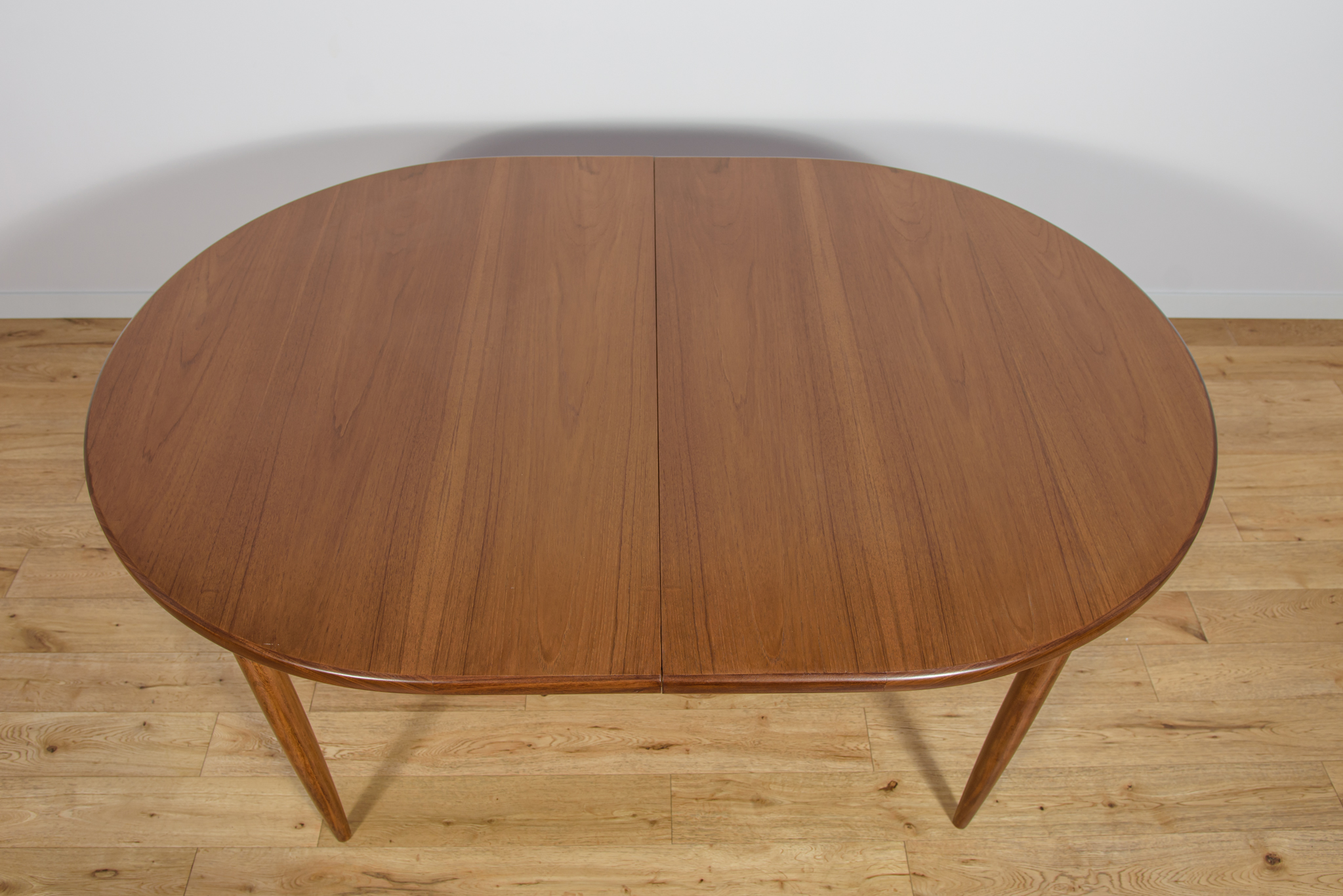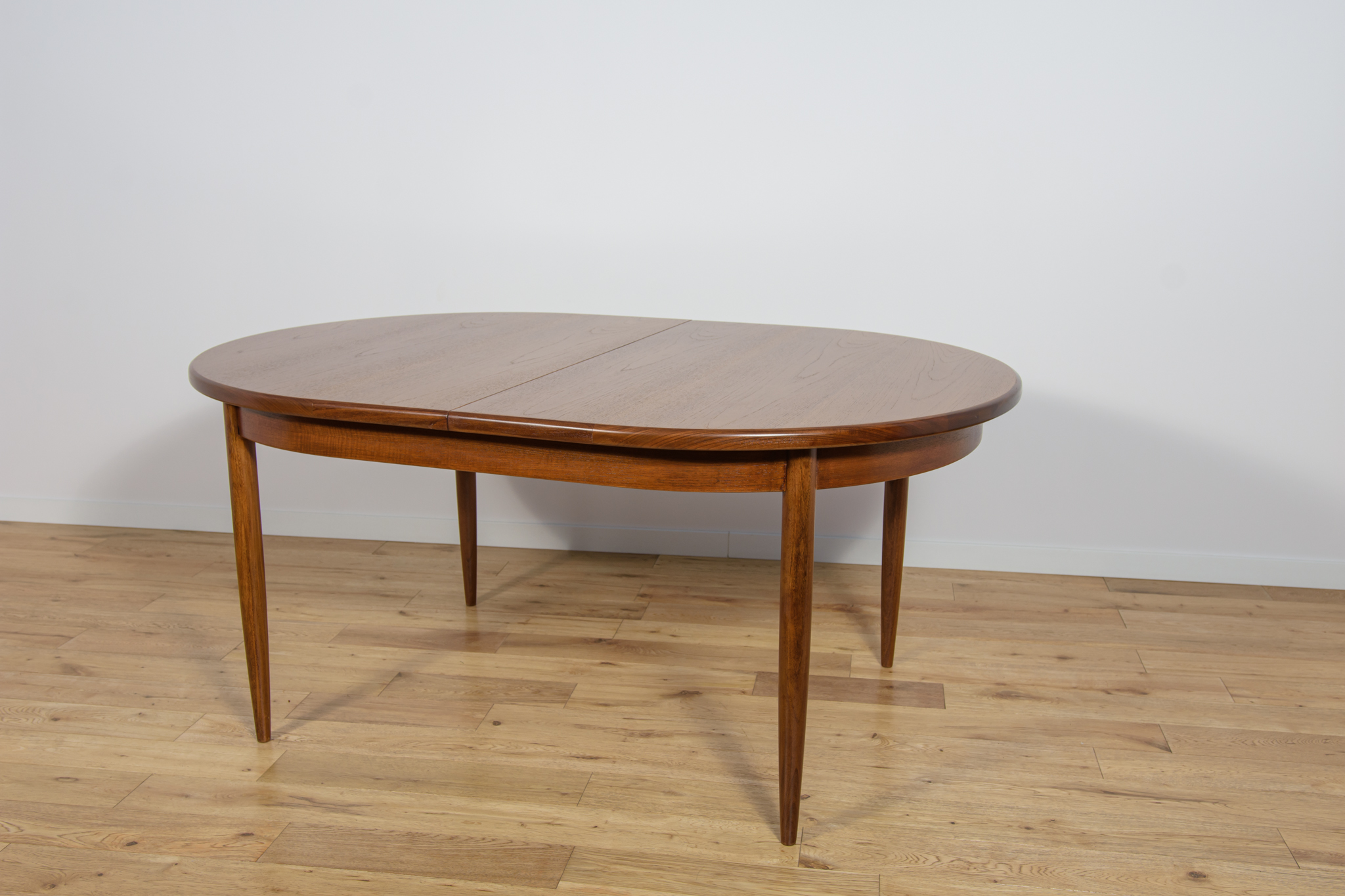 Rozkładany stół został wyprodukowany w latach 60., w brytyjskiej manufakturze G- Plan. Stół posiada wyprofilowane, wzmacniane krawędzie. Mebel tekowy o owalnym kształcie jest po profesjonalnej renowacji stolarskiej. Został oczyszczony ze starej powierzchni, barwiony bejcą dębową, wykończony mocnym półmatowym lakierem. Stół posiada mechanizm ułatwiający rozkładanie.