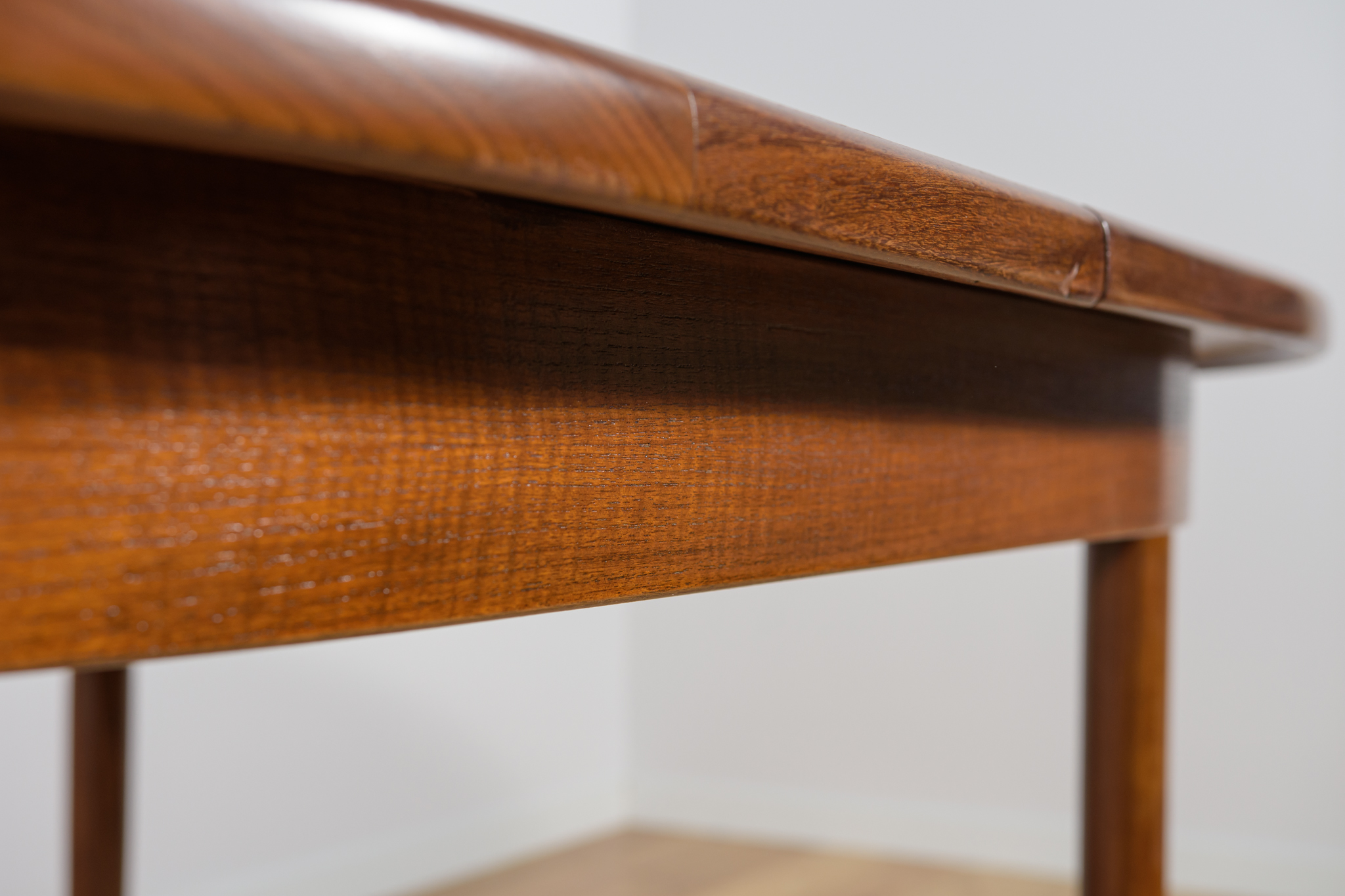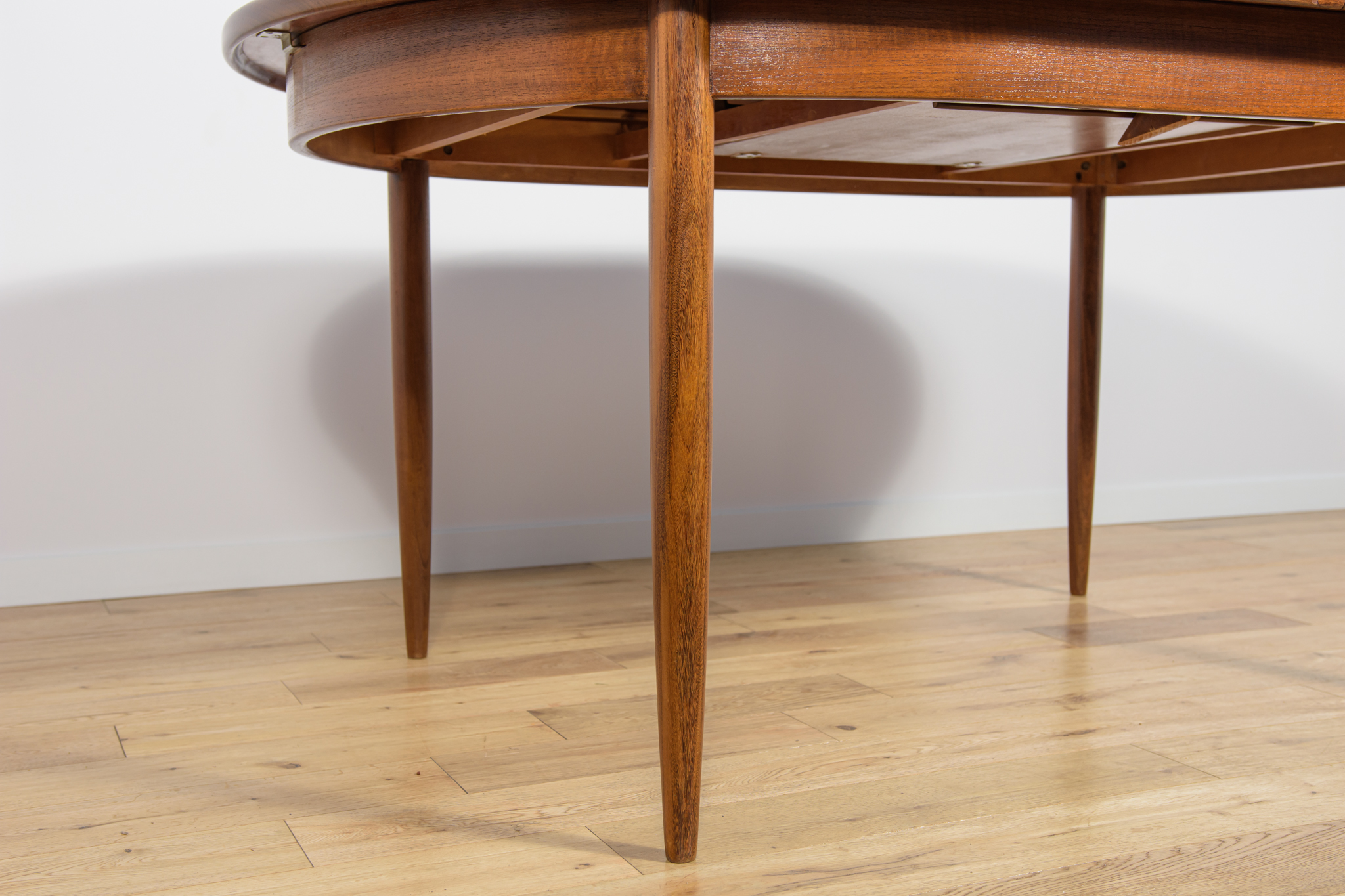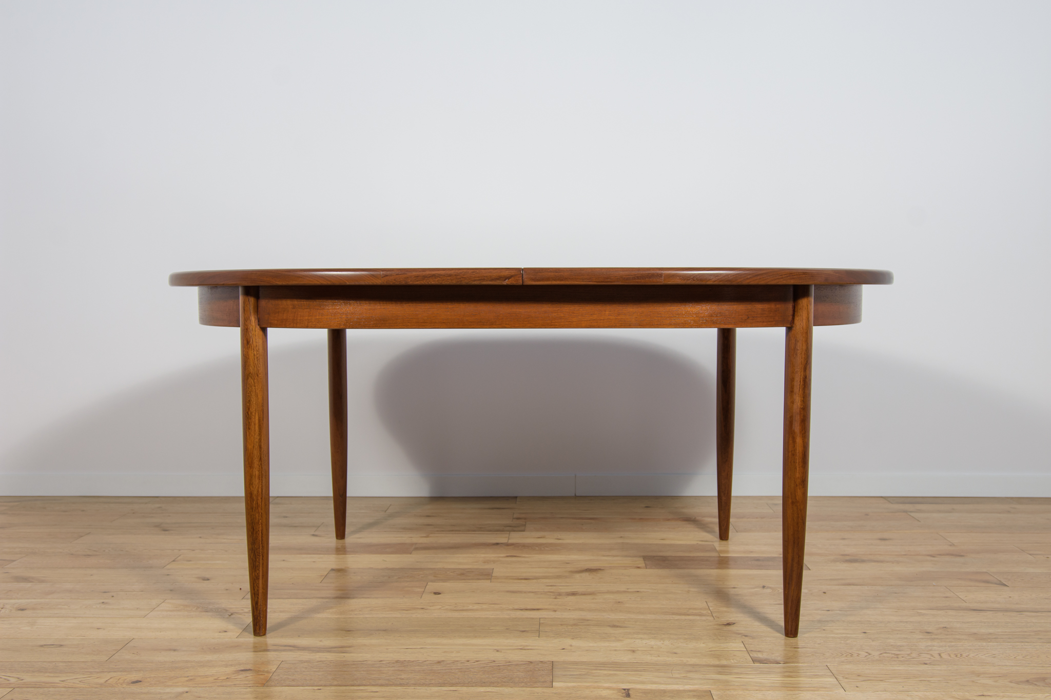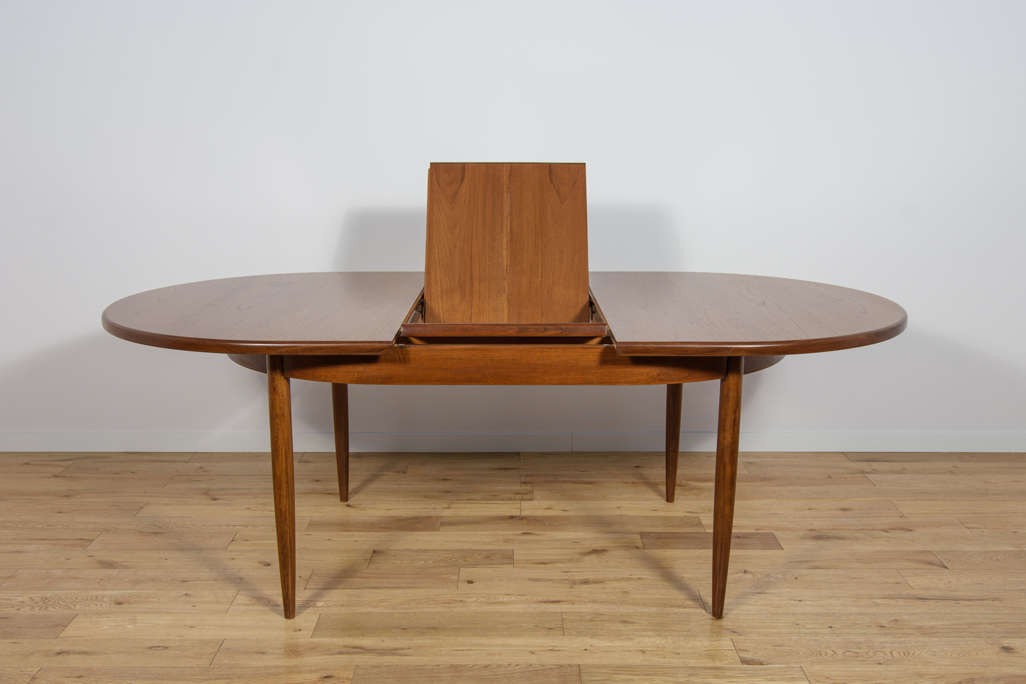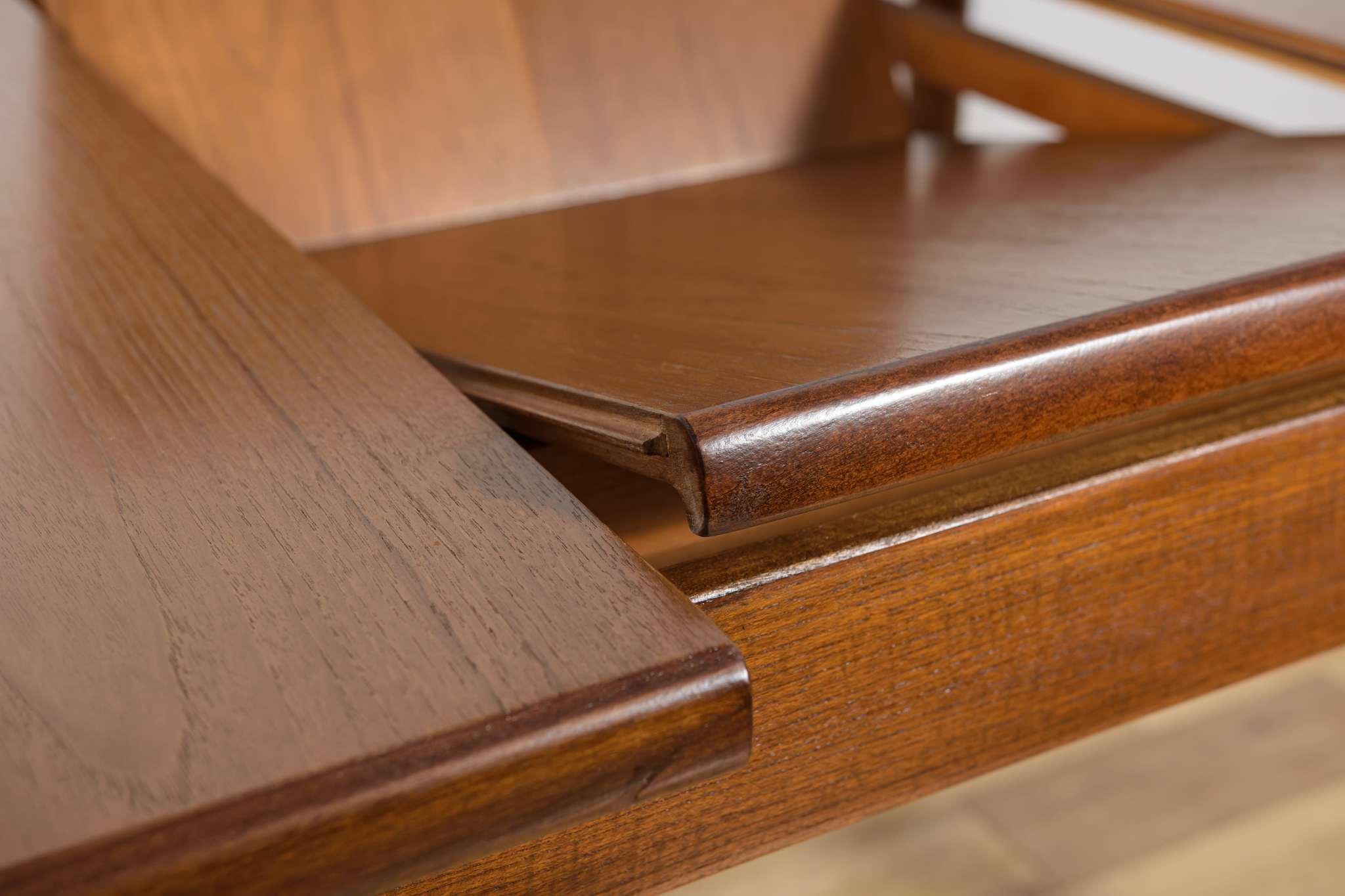 Rozkładany stół został wyprodukowany w latach 60., w brytyjskiej manufakturze G- Plan. Stół posiada wyprofilowane, wzmacniane krawędzie. Mebel tekowy o owalnym kształcie jest po profesjonalnej renowacji stolarskiej. Został oczyszczony ze starej powierzchni, barwiony bejcą dębową, wykończony mocnym półmatowym lakierem. Stół posiada mechanizm ułatwiający rozkładanie.