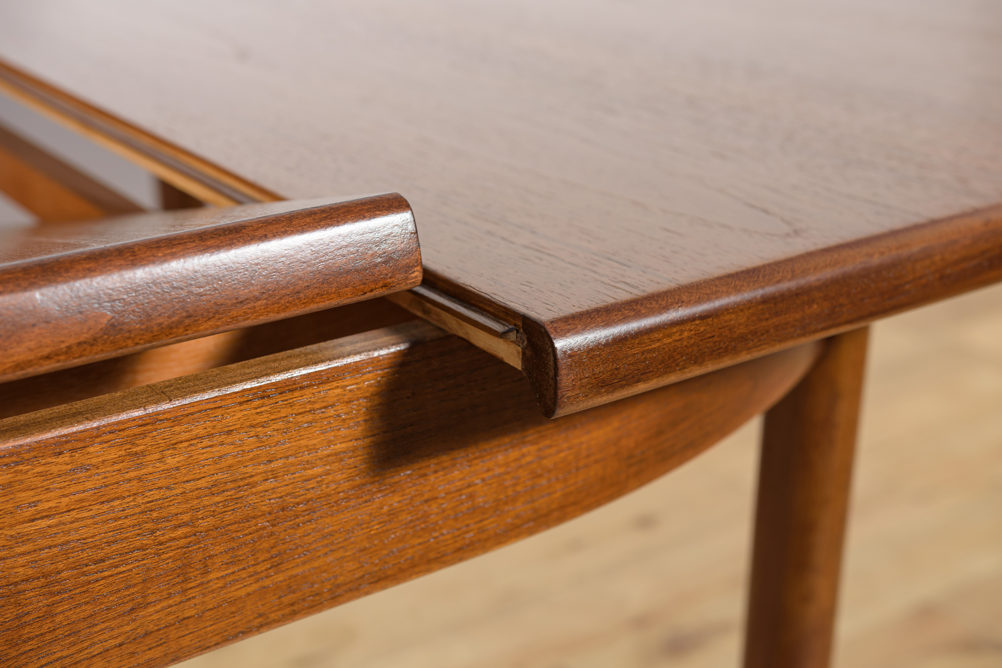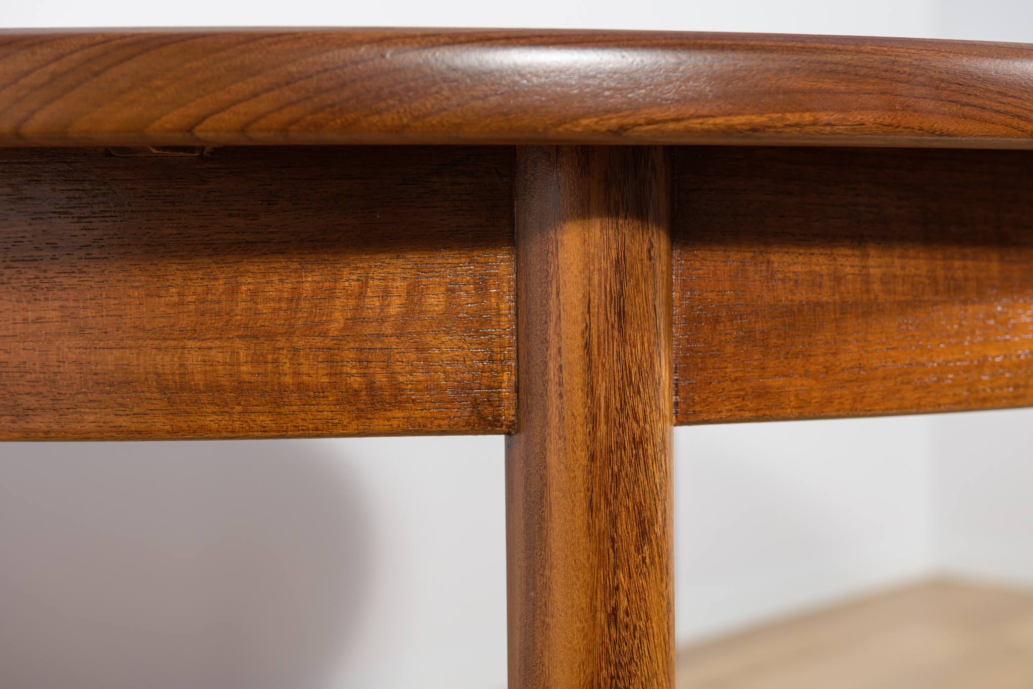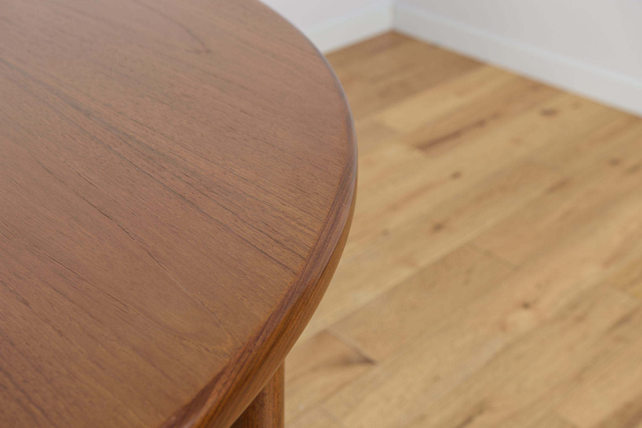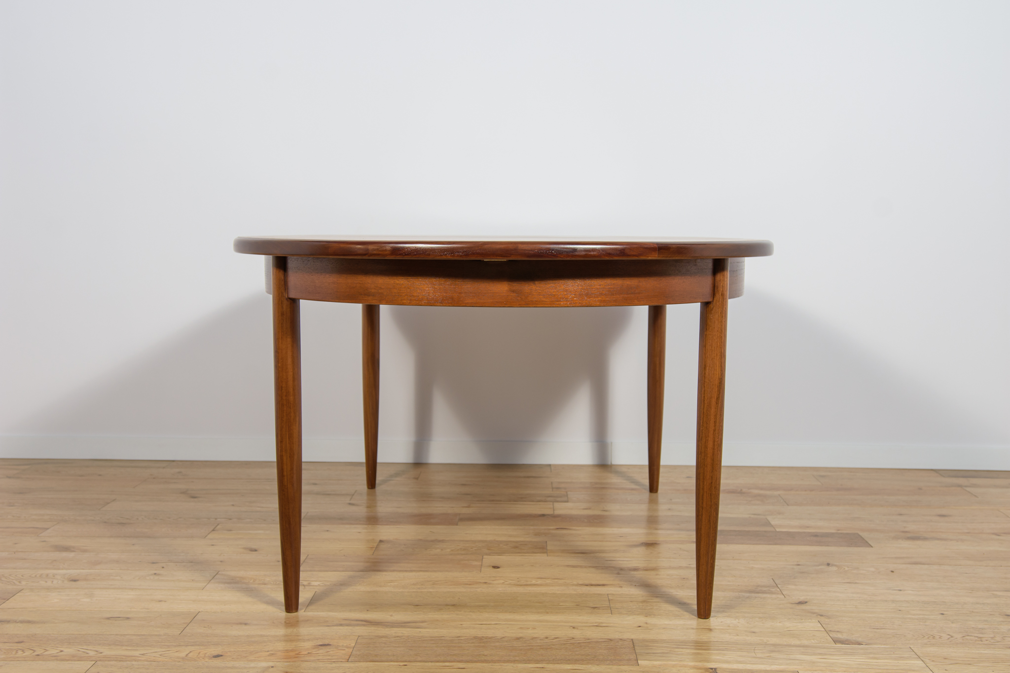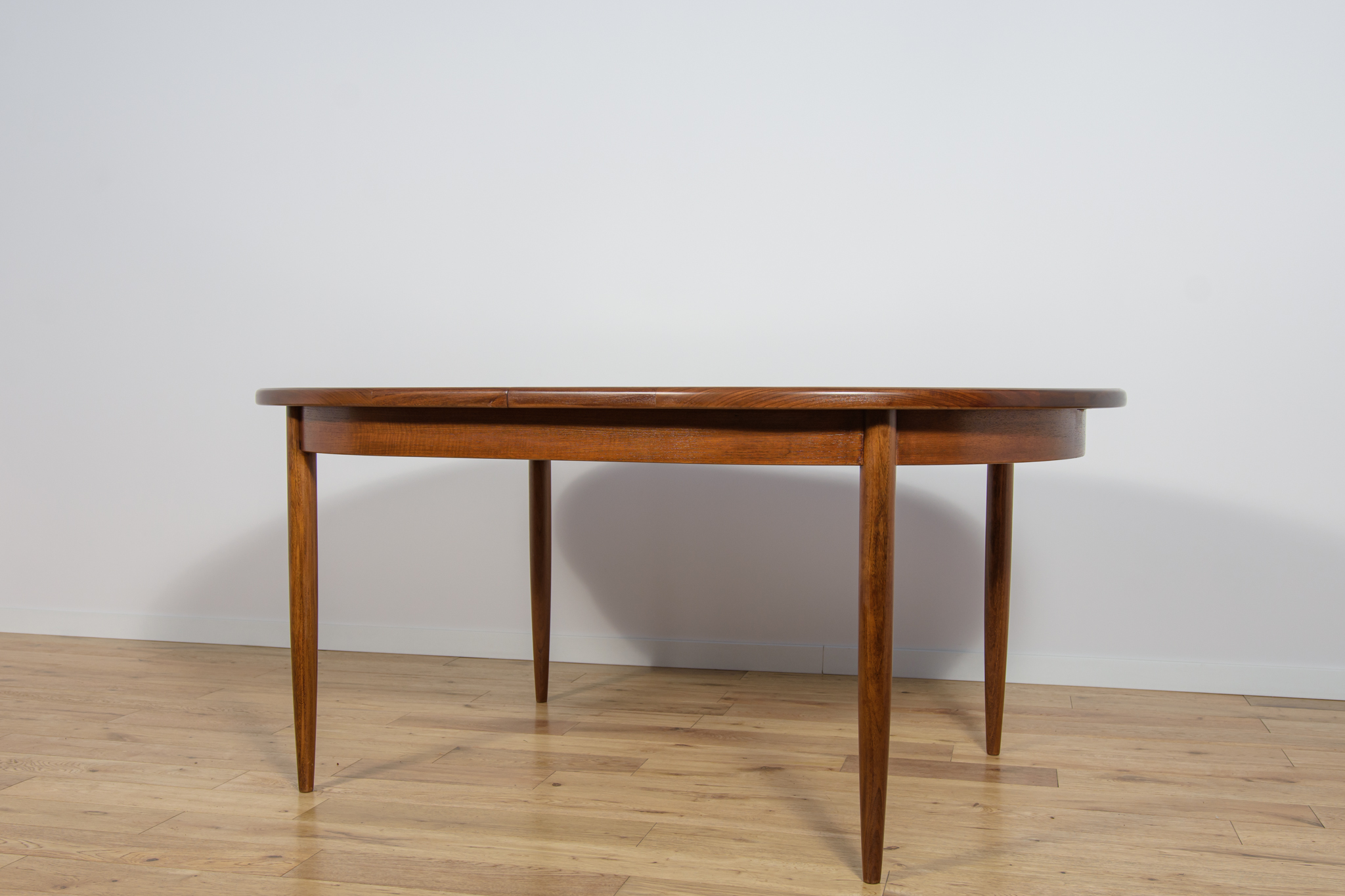 Rozkładany stół został wyprodukowany w latach 60., w brytyjskiej manufakturze G- Plan. Stół posiada wyprofilowane, wzmacniane krawędzie. Mebel tekowy o owalnym kształcie jest po profesjonalnej renowacji stolarskiej. Został oczyszczony ze starej powierzchni, barwiony bejcą dębową, wykończony mocnym półmatowym lakierem. Stół posiada mechanizm ułatwiający rozkładanie.