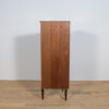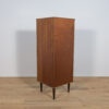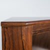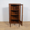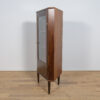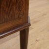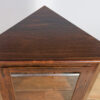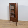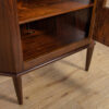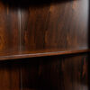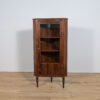 Komoda narożnikowa z drewna palisandrowego wyprodukowana w Danii w latach 60-tych. W środku znajdują się cztery półki. Mebel charakteryzuje się pięknym usłojeniem oraz dopracowanymi detalami. Komoda po kompleksowej renowacji, oczyszczona ze starej powierzchni, barwiona bejcą palisandrową, wykończona mocnym wysokogatunkowym lakierem. Szyba została wymieniona na nową.