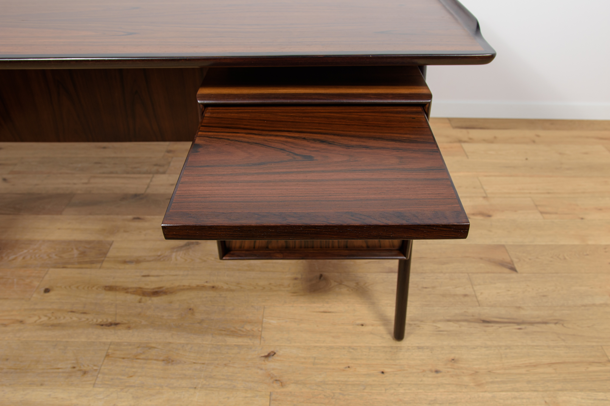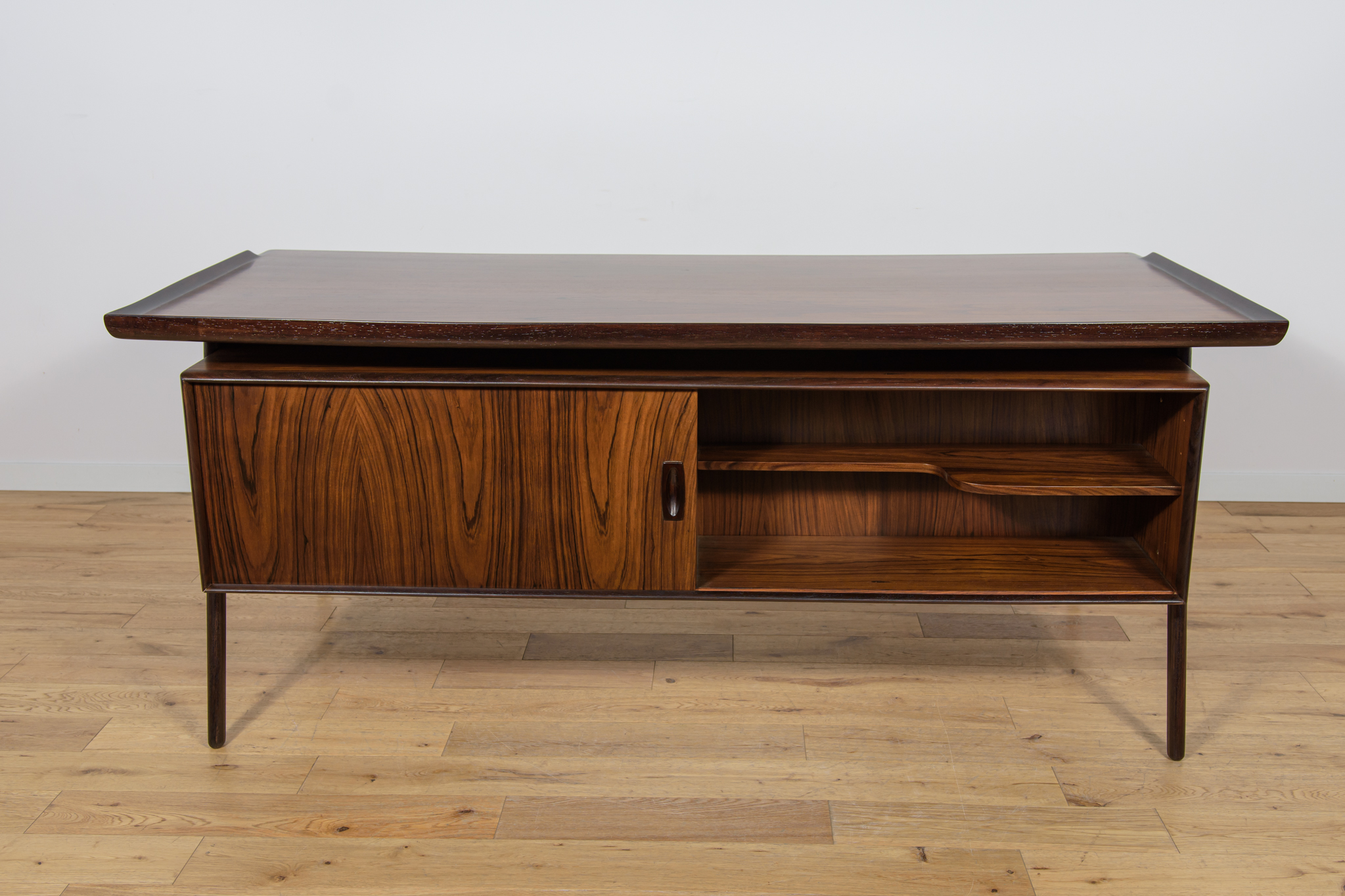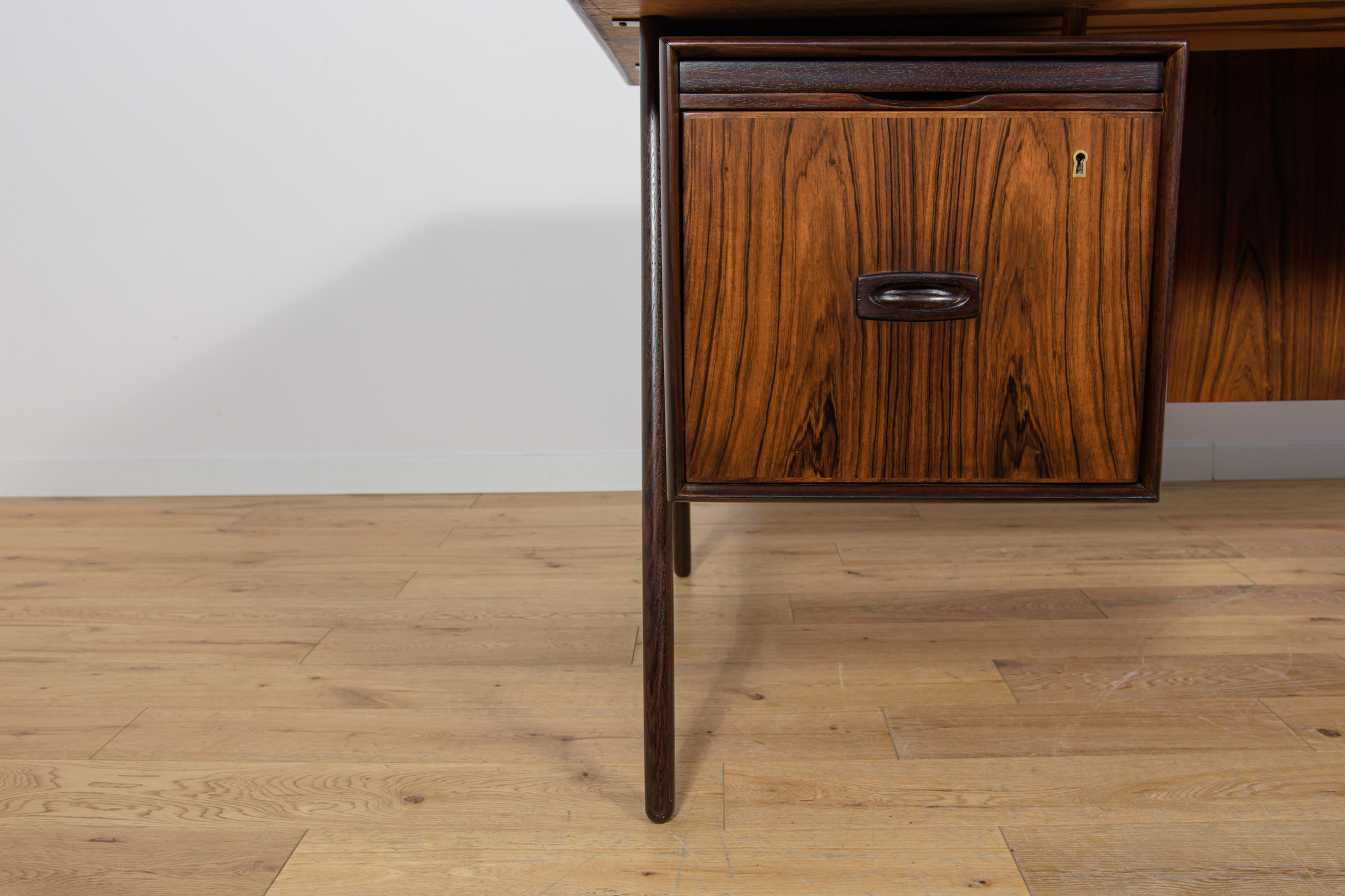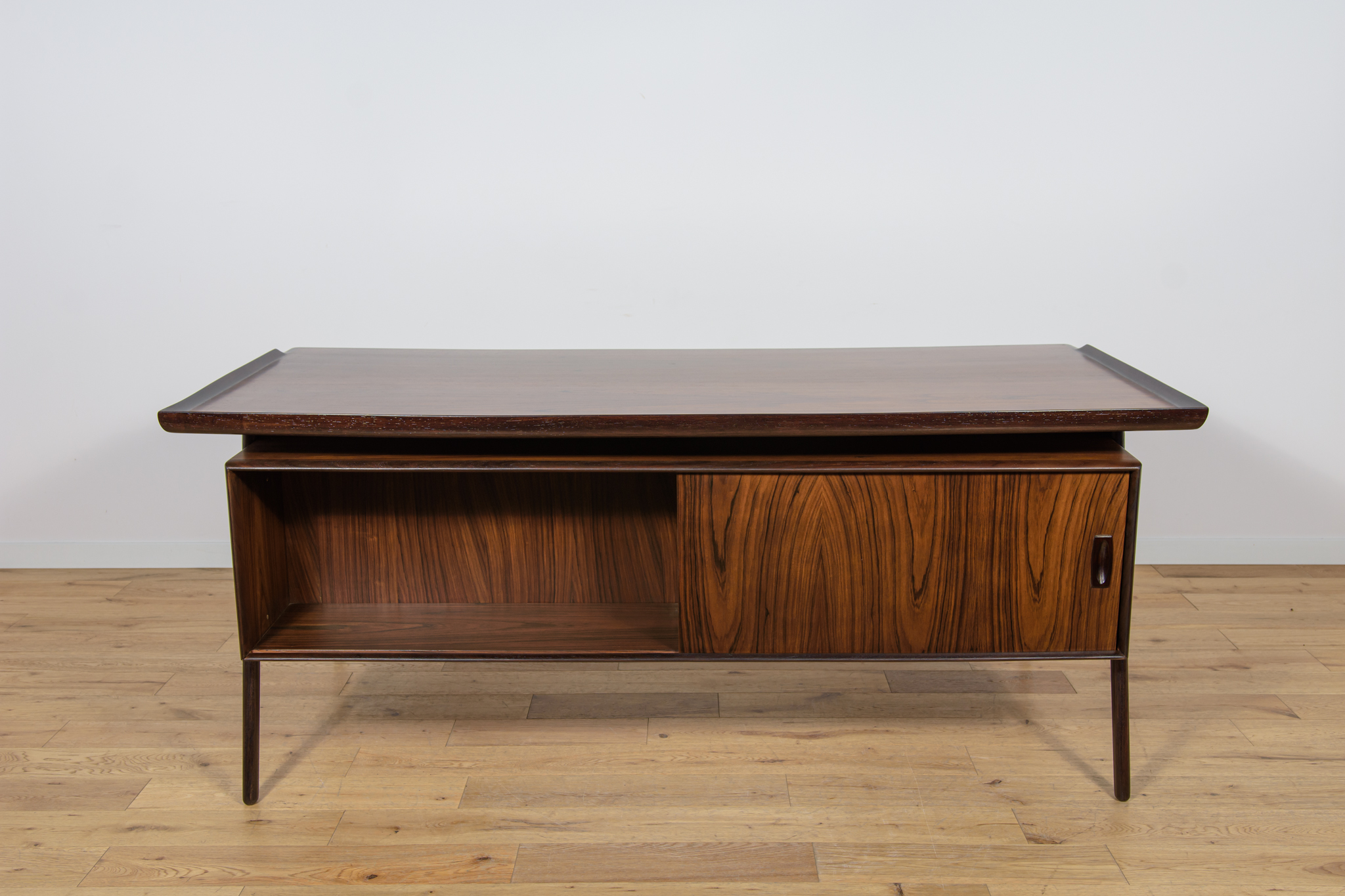 Wolnostojące duże biurko wyprodukowane w Danii w latach 60. Mebel został wykonany z drewna palisandrowego, posiada wyprofilowane uchwyty i ranty blatu. Biurko wolnostojące składa się z dwóch modułów, po lewej stronie, znajduje się głęboka szuflada na akta i wysuwany blat, z prawej trzy szuflady i wysuwany blat. Od strony frontalnej znajduje się półka na książki, zamykana przesuwnymi drzwiami. Biurko jest po kompleksowej renowacji, zostało oczyszczone ze starej powłoki, barwione bejcą w kolorze palisandru, wykończone mocnym półmatowym lakierem. Mebel posiada klucz do szuflad.