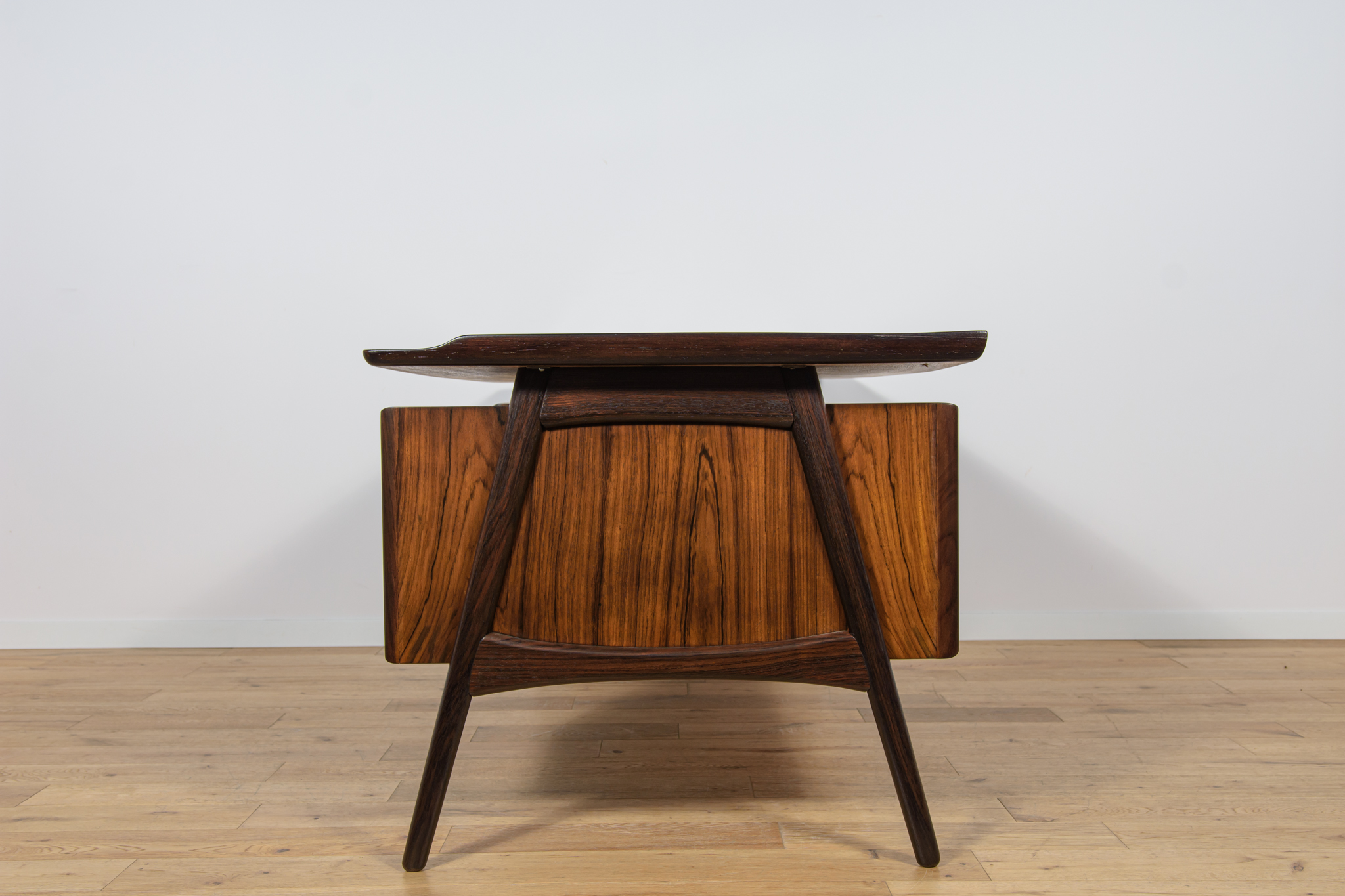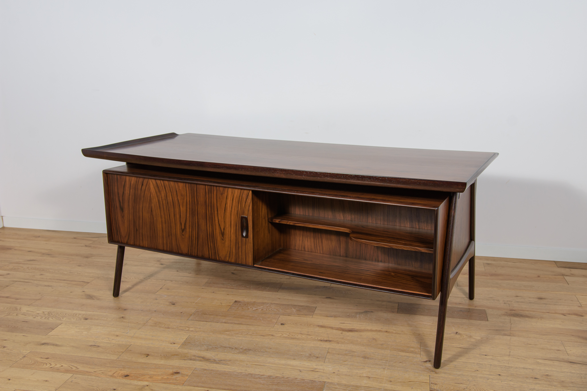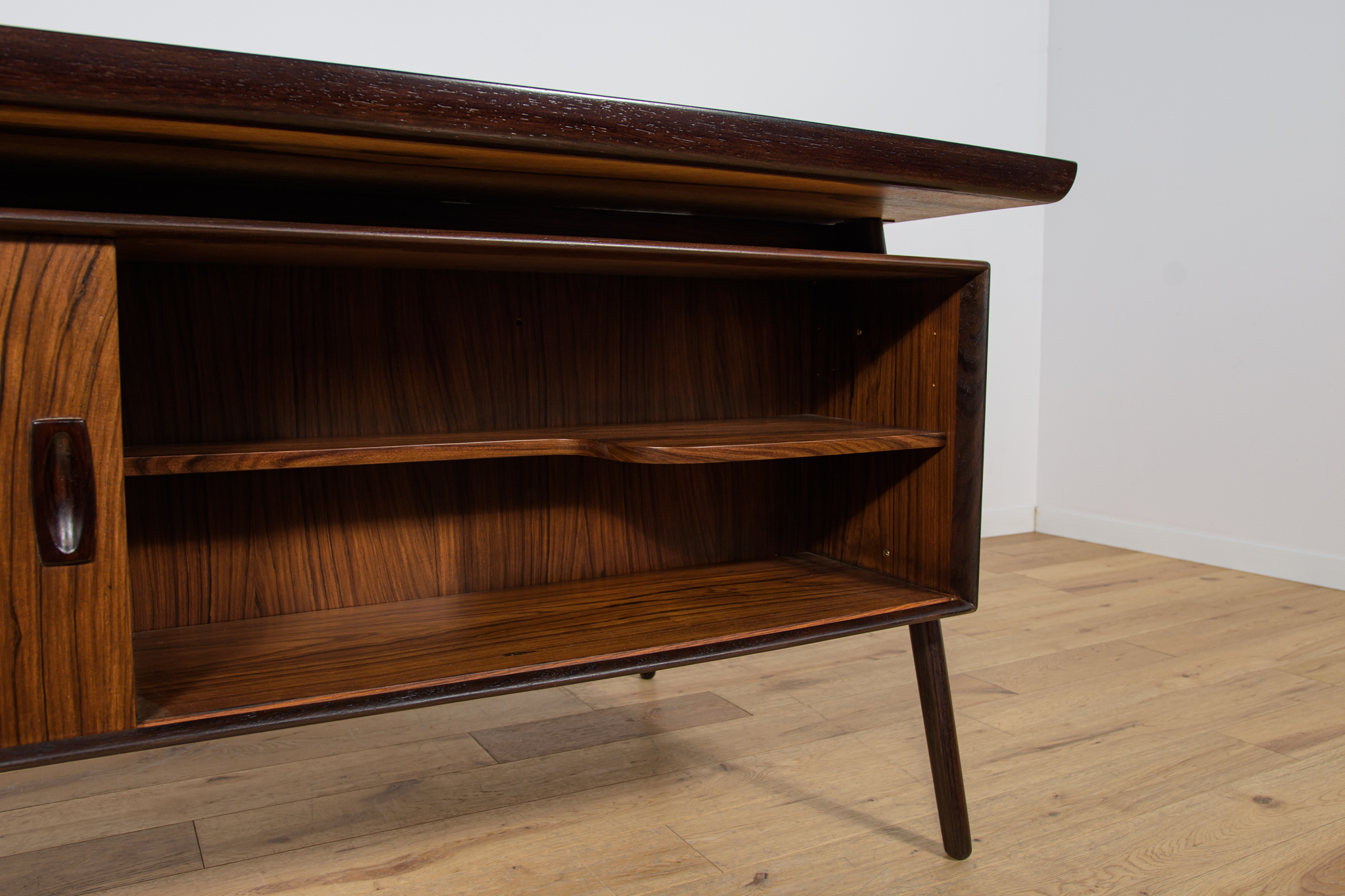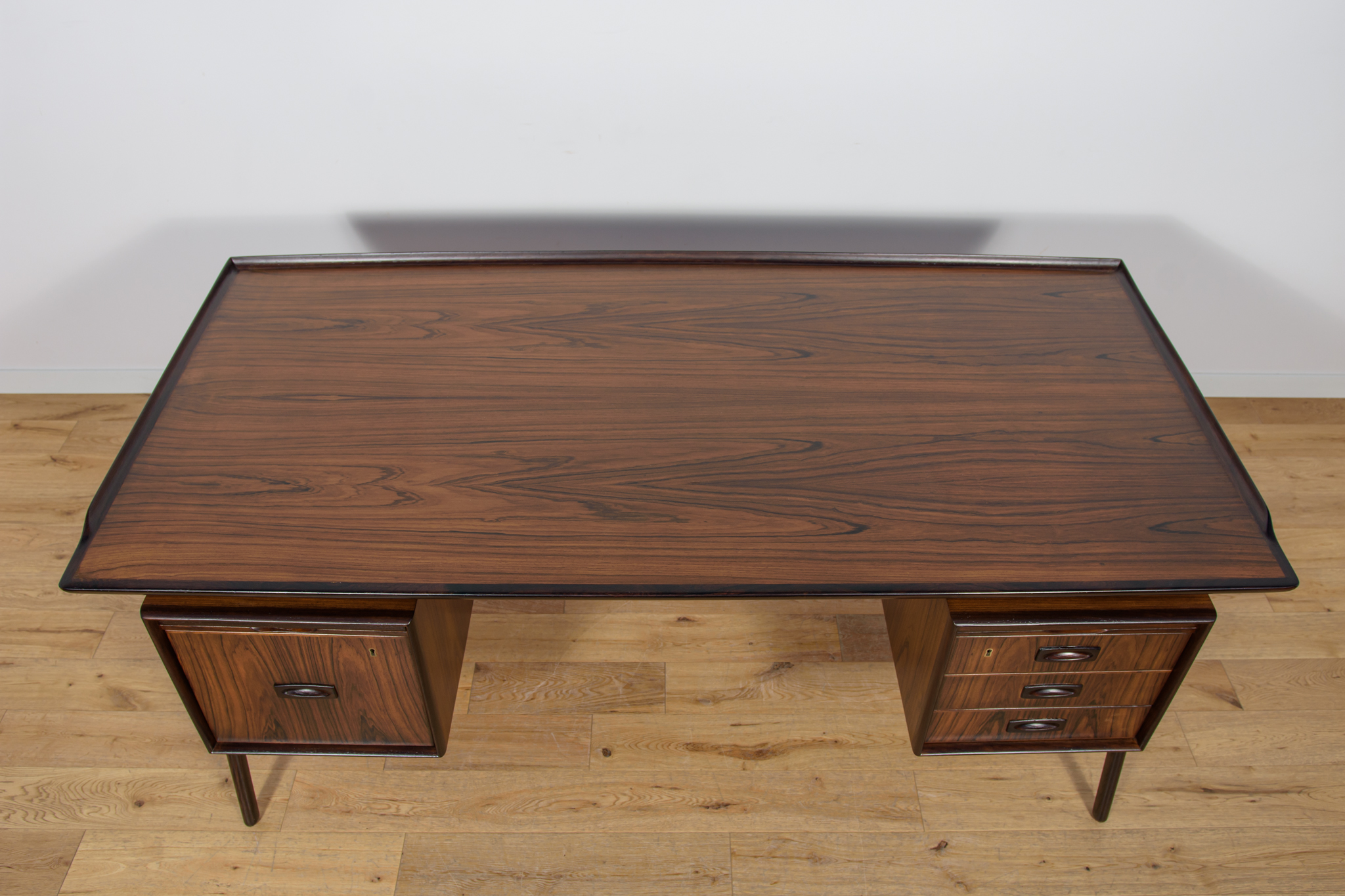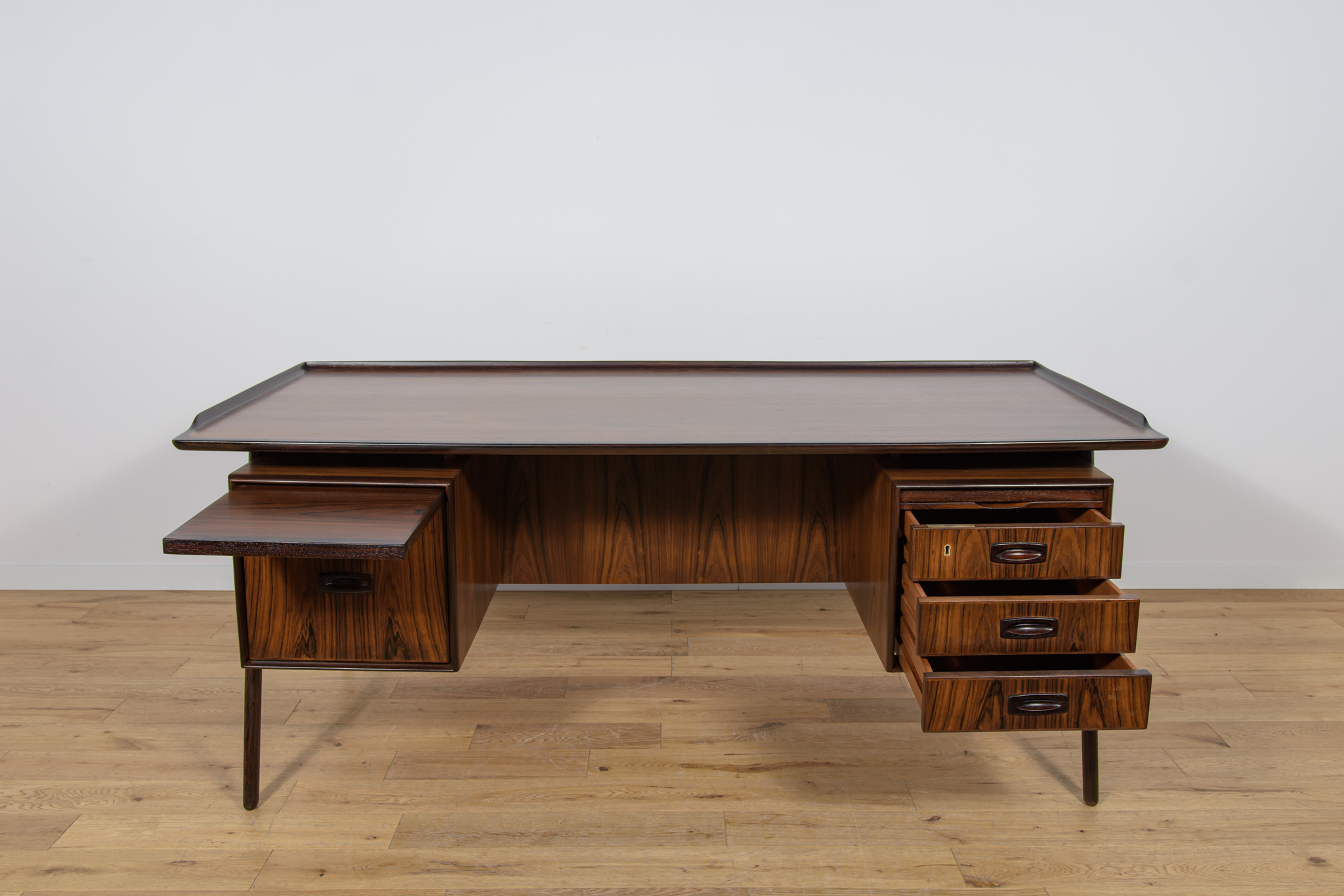 Wolnostojące duże biurko wyprodukowane w Danii w latach 60. Mebel został wykonany z drewna palisandrowego, posiada wyprofilowane uchwyty i ranty blatu. Biurko wolnostojące składa się z dwóch modułów, po lewej stronie, znajduje się głęboka szuflada na akta i wysuwany blat, z prawej trzy szuflady i wysuwany blat. Od strony frontalnej znajduje się półka na książki, zamykana przesuwnymi drzwiami. Biurko jest po kompleksowej renowacji, zostało oczyszczone ze starej powłoki, barwione bejcą w kolorze palisandru, wykończone mocnym półmatowym lakierem. Mebel posiada klucz do szuflad.
