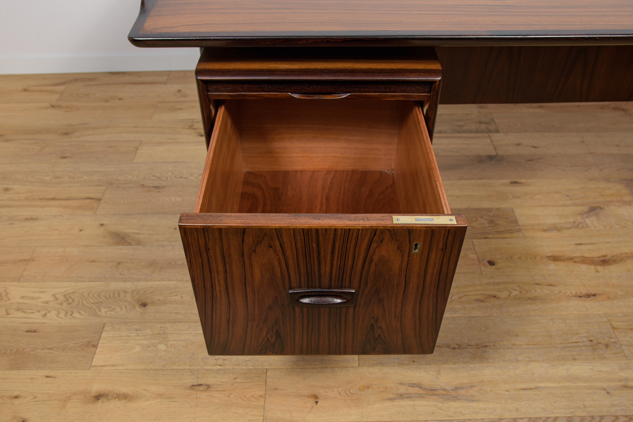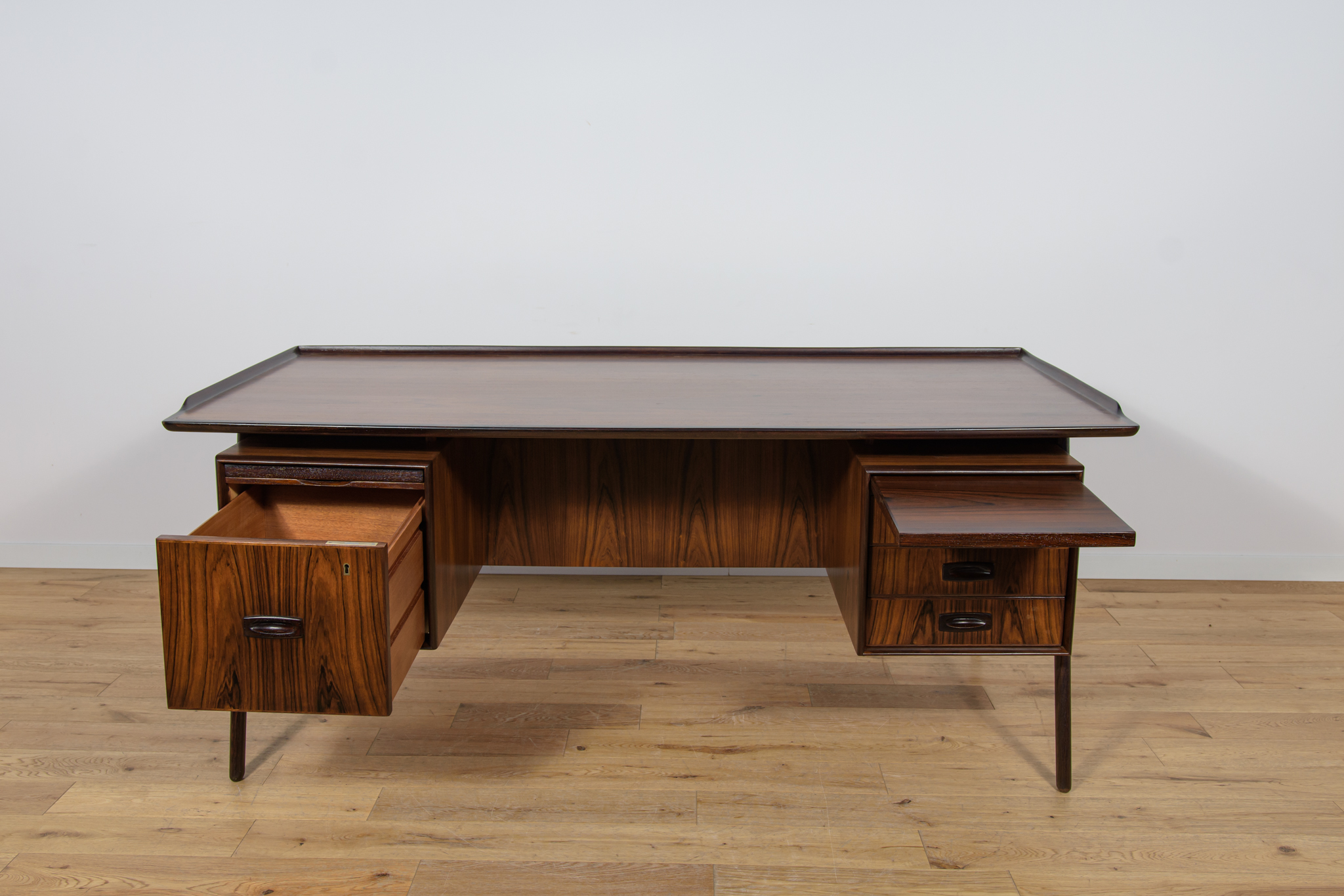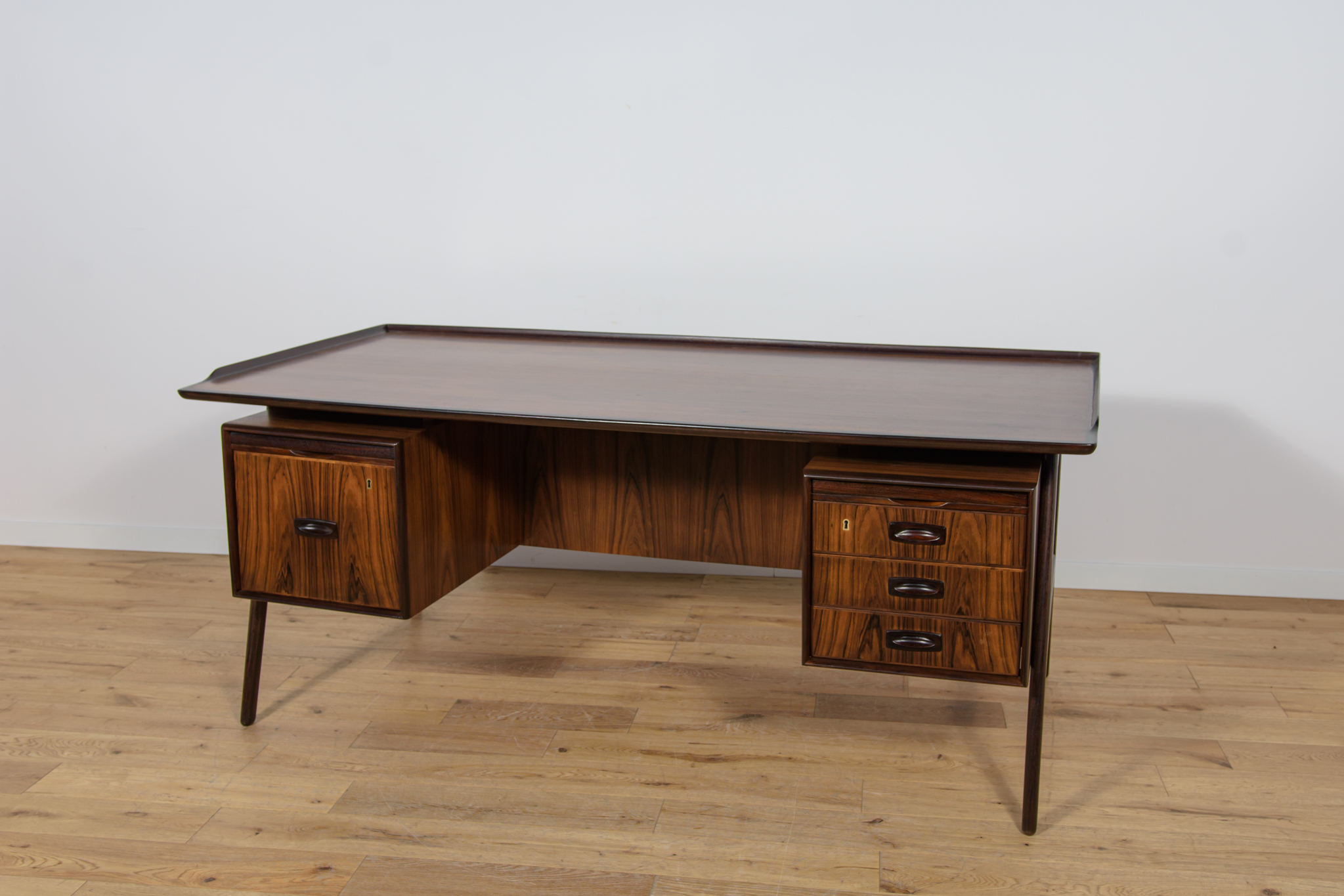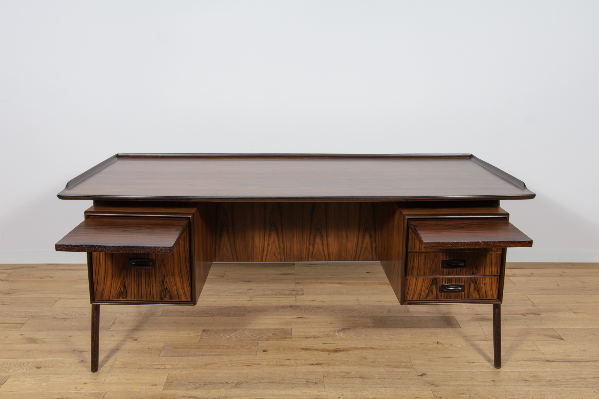 Wolnostojące duże biurko wyprodukowane w Danii w latach 60. Mebel został wykonany z drewna palisandrowego, posiada wyprofilowane uchwyty i ranty blatu. Biurko wolnostojące składa się z dwóch modułów, po lewej stronie, znajduje się głęboka szuflada na akta i wysuwany blat, z prawej trzy szuflady i wysuwany blat. Od strony frontalnej znajduje się półka na książki, zamykana przesuwnymi drzwiami. Biurko jest po kompleksowej renowacji, zostało oczyszczone ze starej powłoki, barwione bejcą w kolorze palisandru, wykończone mocnym półmatowym lakierem. Mebel posiada klucz do szuflad.