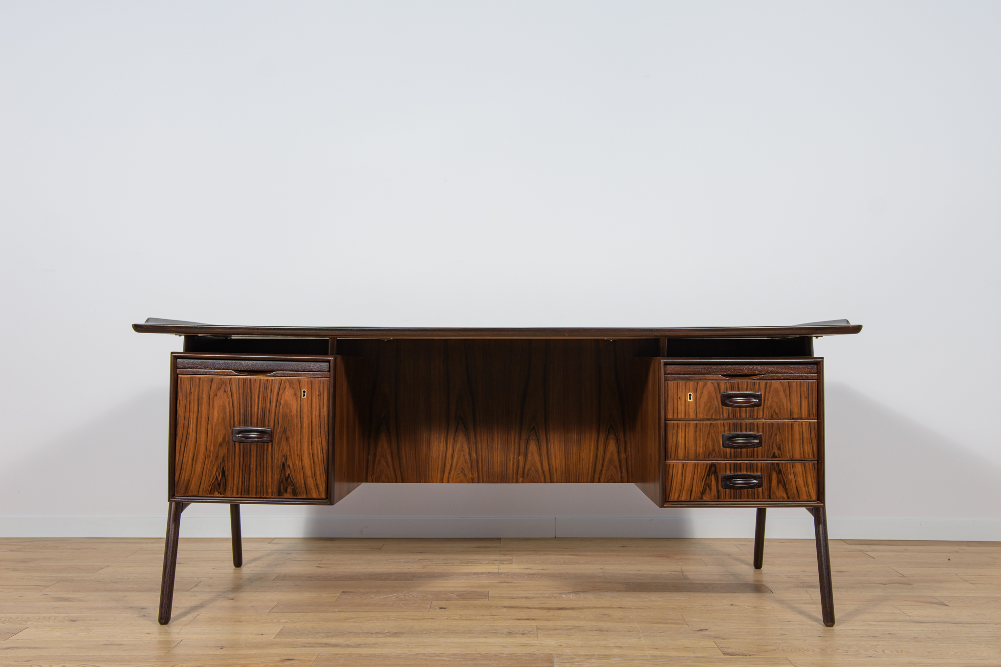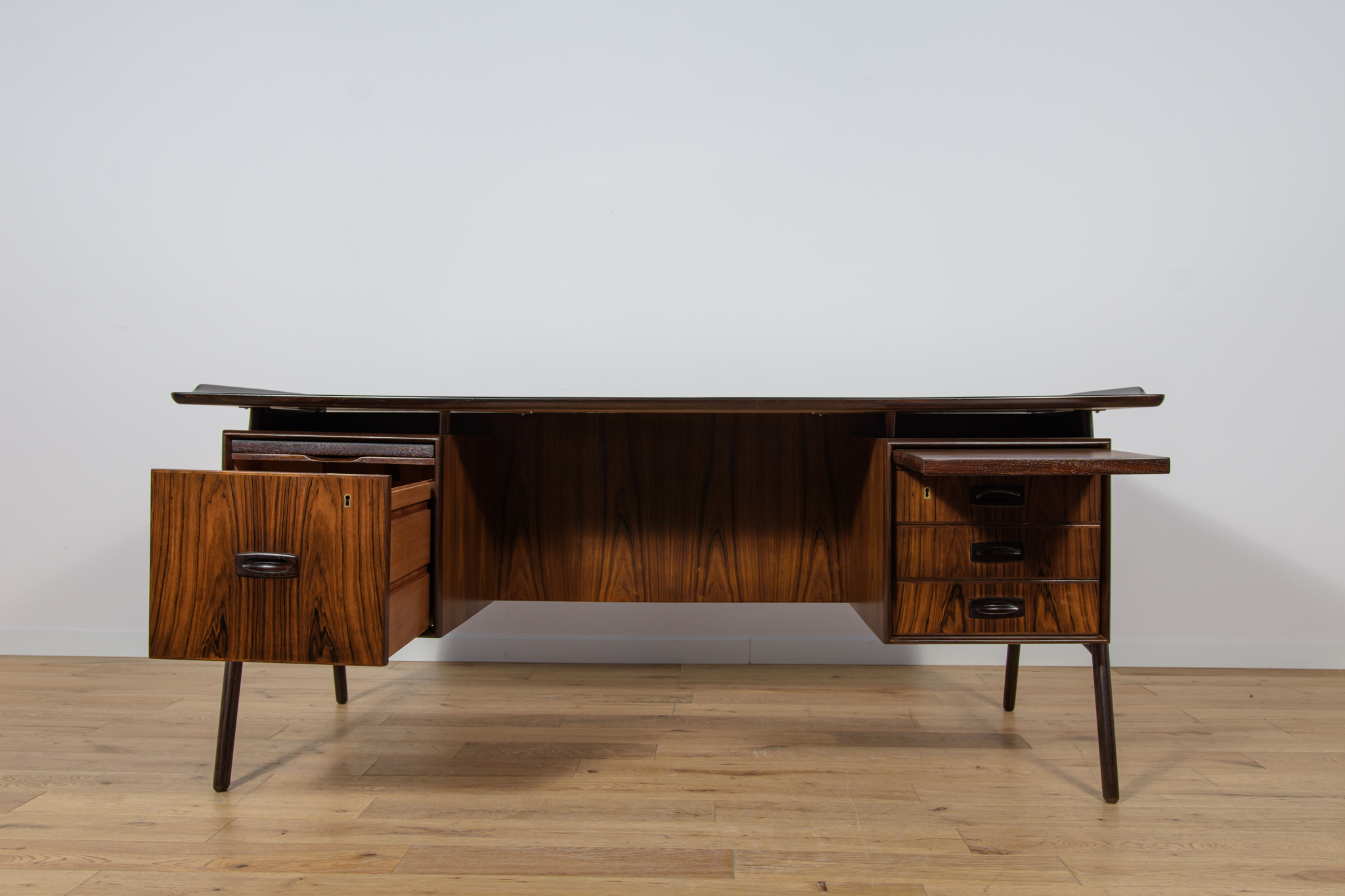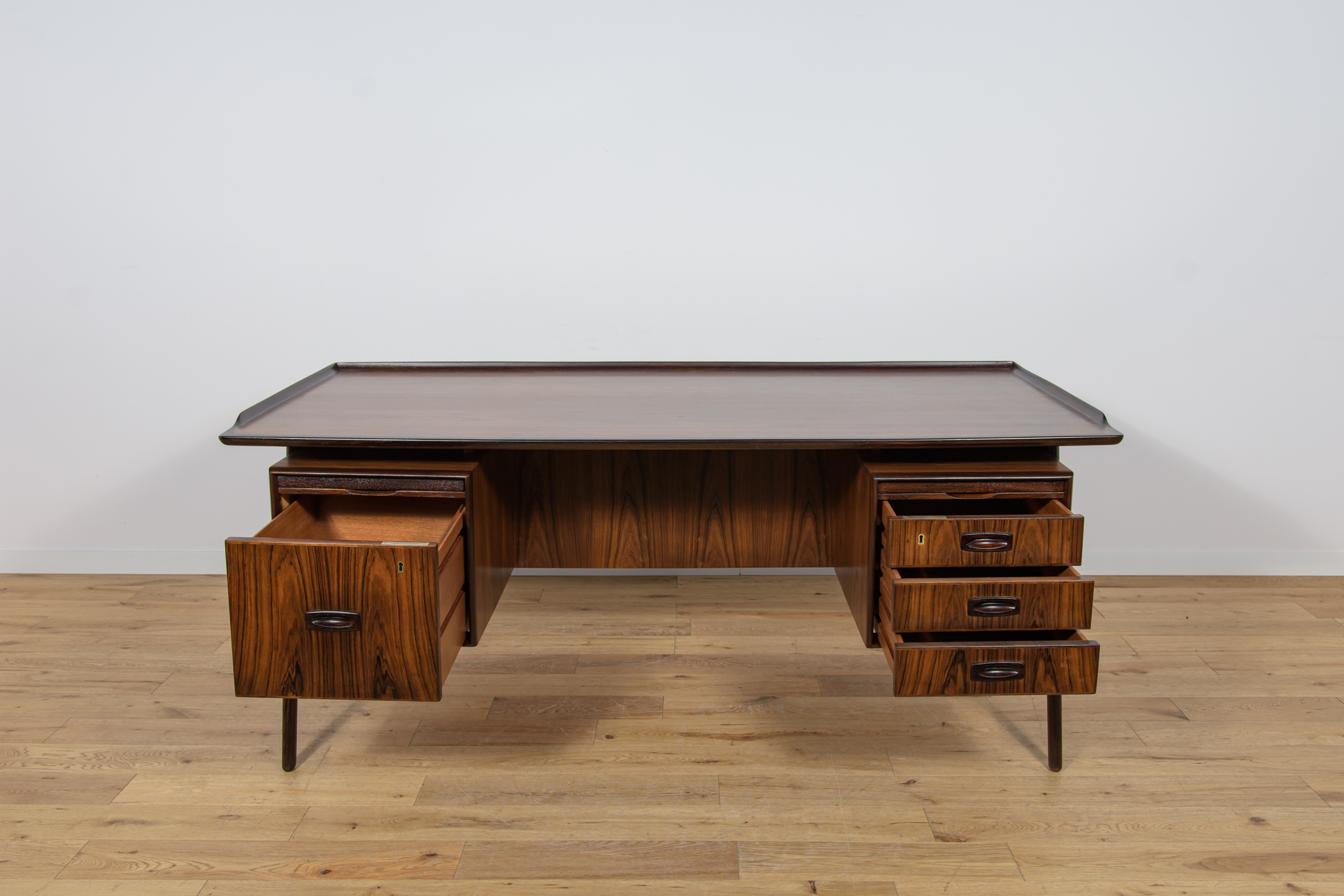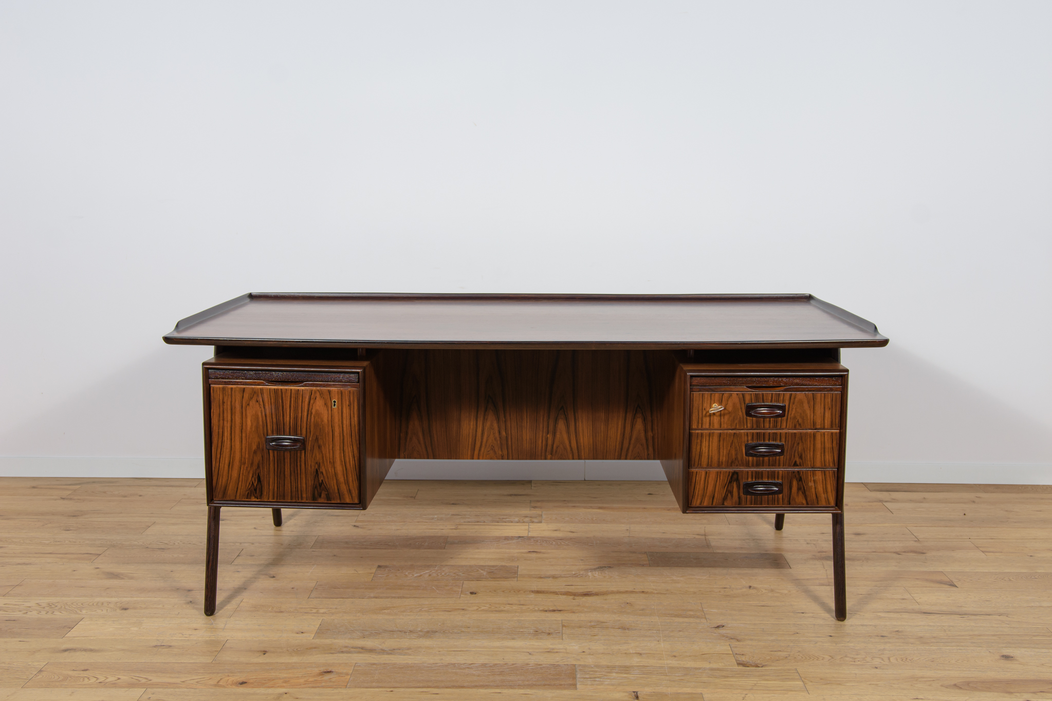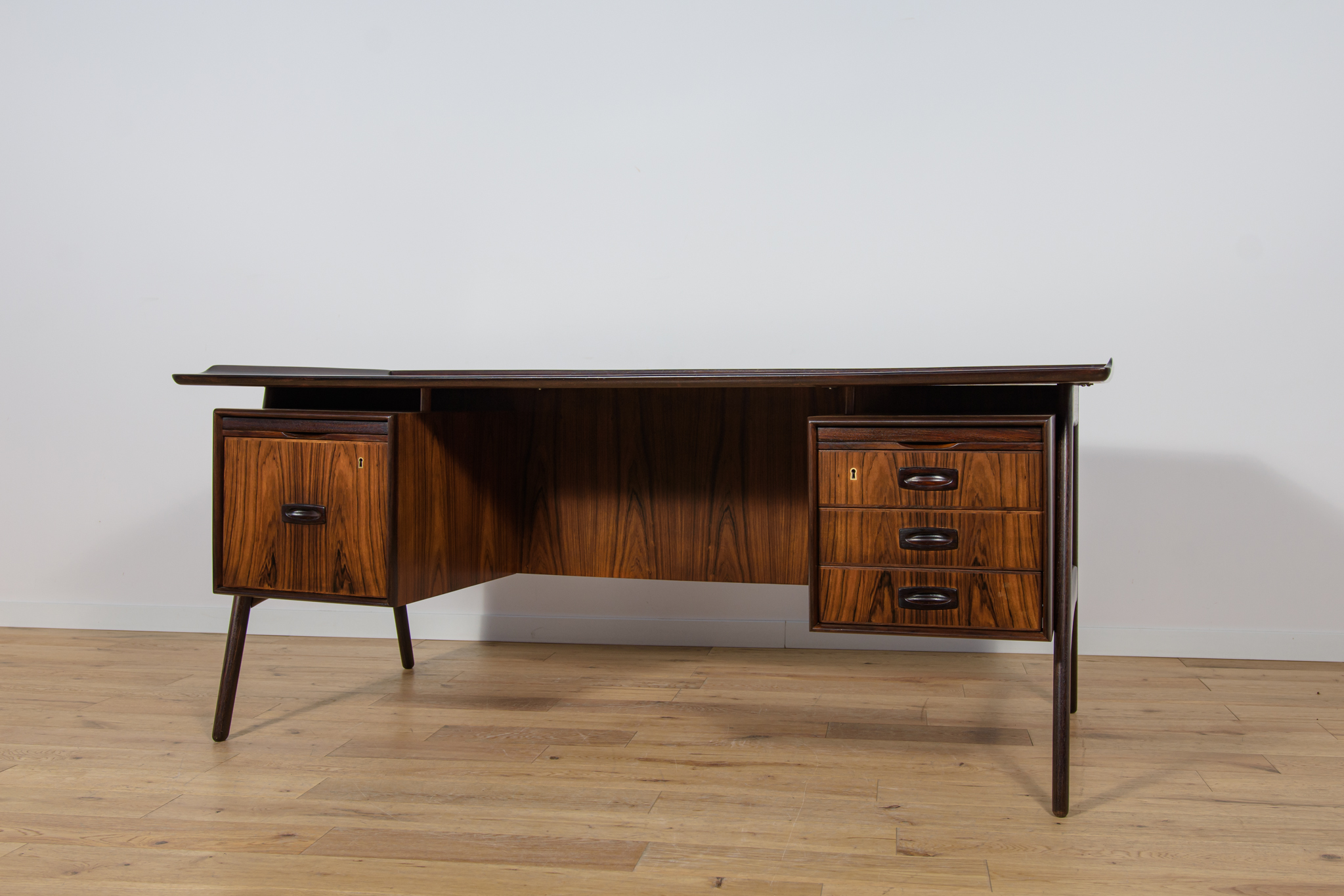 Wolnostojące duże biurko wyprodukowane w Danii w latach 60. Mebel został wykonany z drewna palisandrowego, posiada wyprofilowane uchwyty i ranty blatu. Biurko wolnostojące składa się z dwóch modułów, po lewej stronie, znajduje się głęboka szuflada na akta i wysuwany blat, z prawej trzy szuflady i wysuwany blat. Od strony frontalnej znajduje się półka na książki, zamykana przesuwnymi drzwiami. Biurko jest po kompleksowej renowacji, zostało oczyszczone ze starej powłoki, barwione bejcą w kolorze palisandru, wykończone mocnym półmatowym lakierem. Mebel posiada klucz do szuflad.