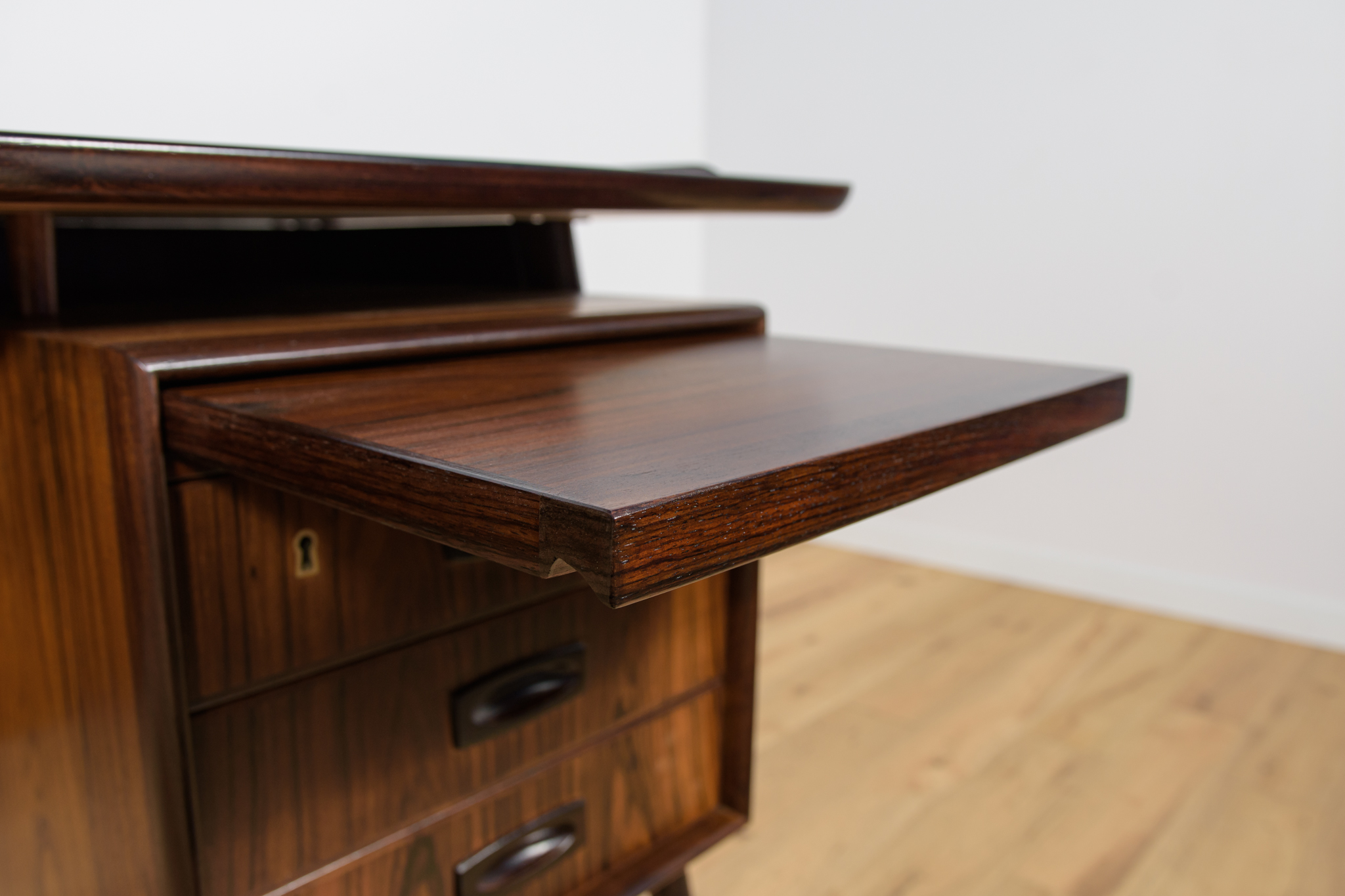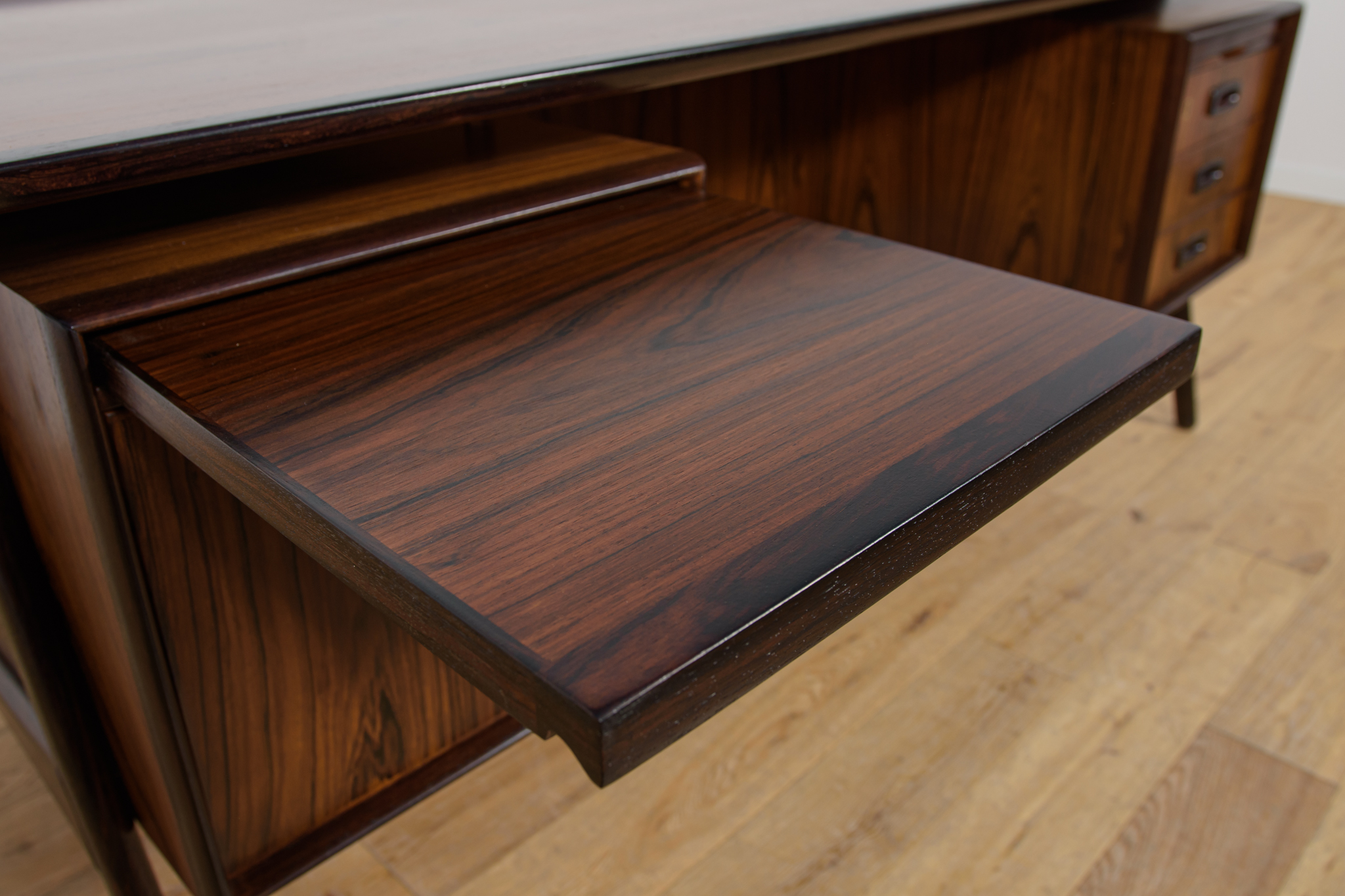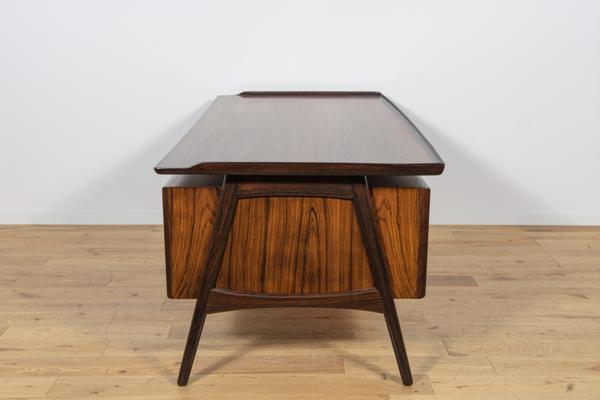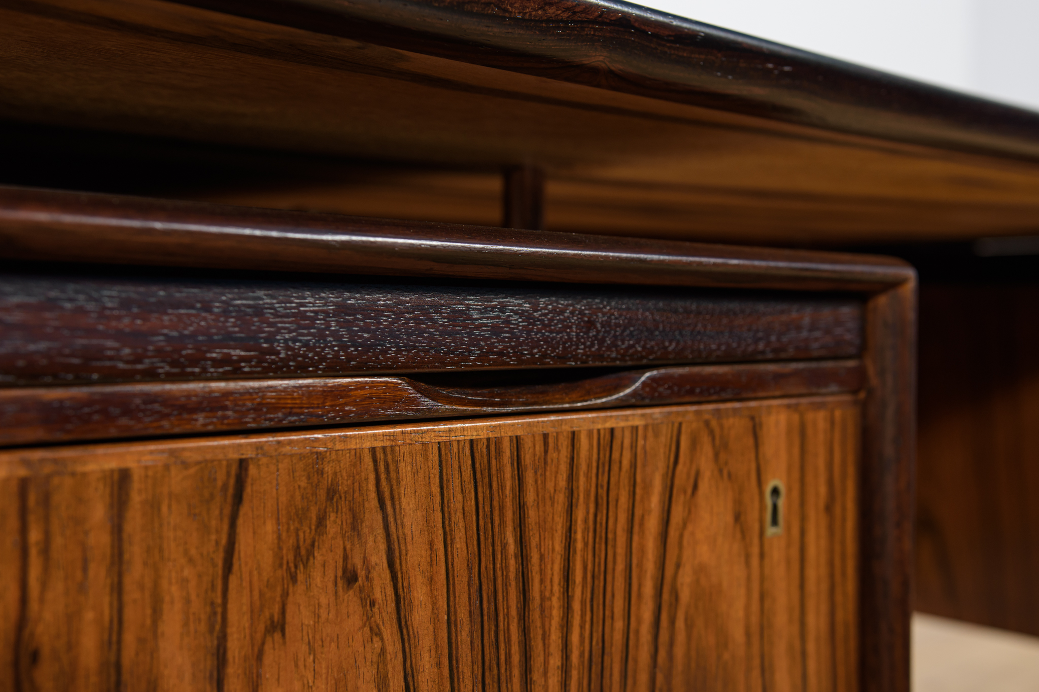 Wolnostojące duże biurko wyprodukowane w Danii w latach 60. Mebel został wykonany z drewna palisandrowego, posiada wyprofilowane uchwyty i ranty blatu. Biurko wolnostojące składa się z dwóch modułów, po lewej stronie, znajduje się głęboka szuflada na akta i wysuwany blat, z prawej trzy szuflady i wysuwany blat. Od strony frontalnej znajduje się półka na książki, zamykana przesuwnymi drzwiami. Biurko jest po kompleksowej renowacji, zostało oczyszczone ze starej powłoki, barwione bejcą w kolorze palisandru, wykończone mocnym półmatowym lakierem. Mebel posiada klucz do szuflad.