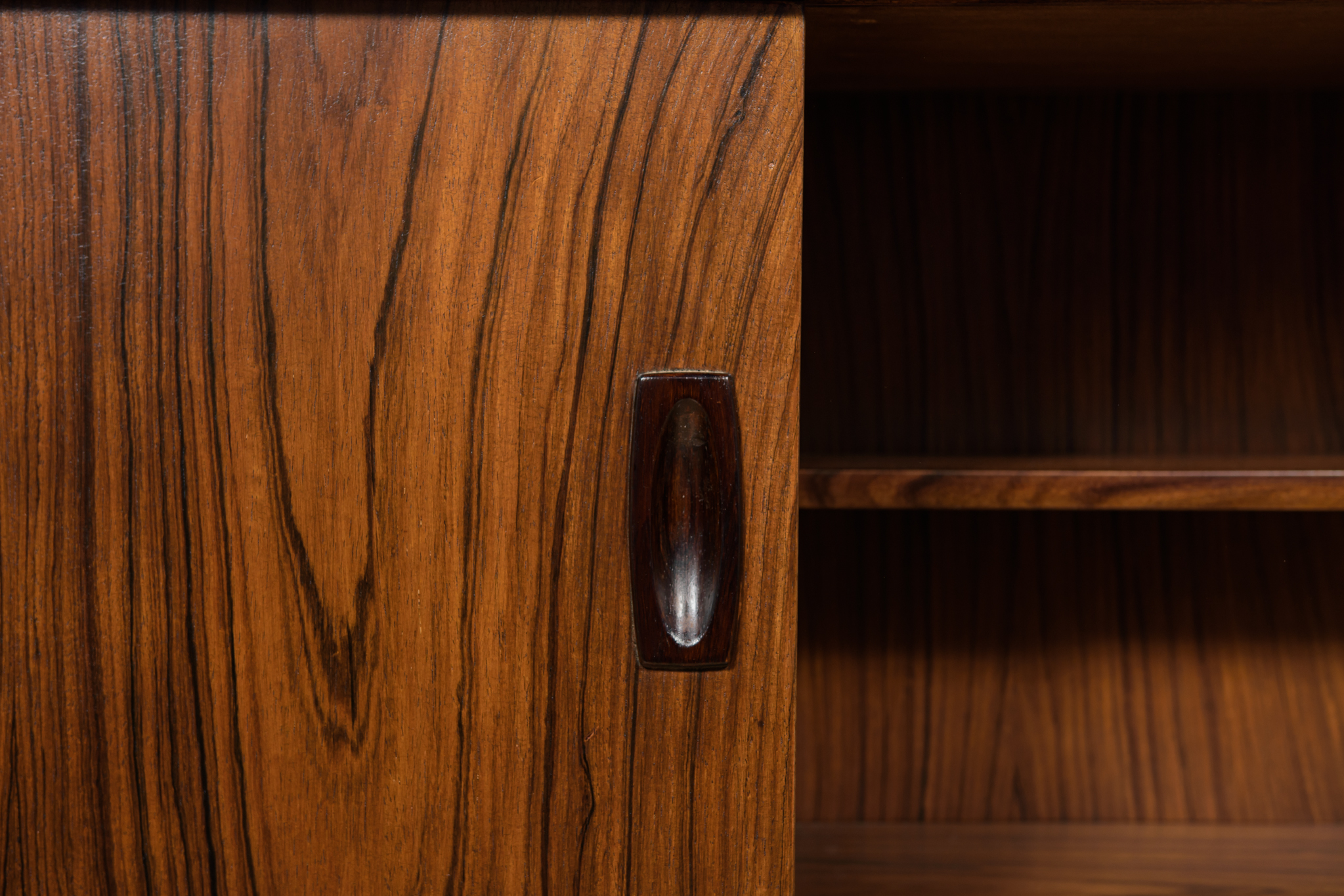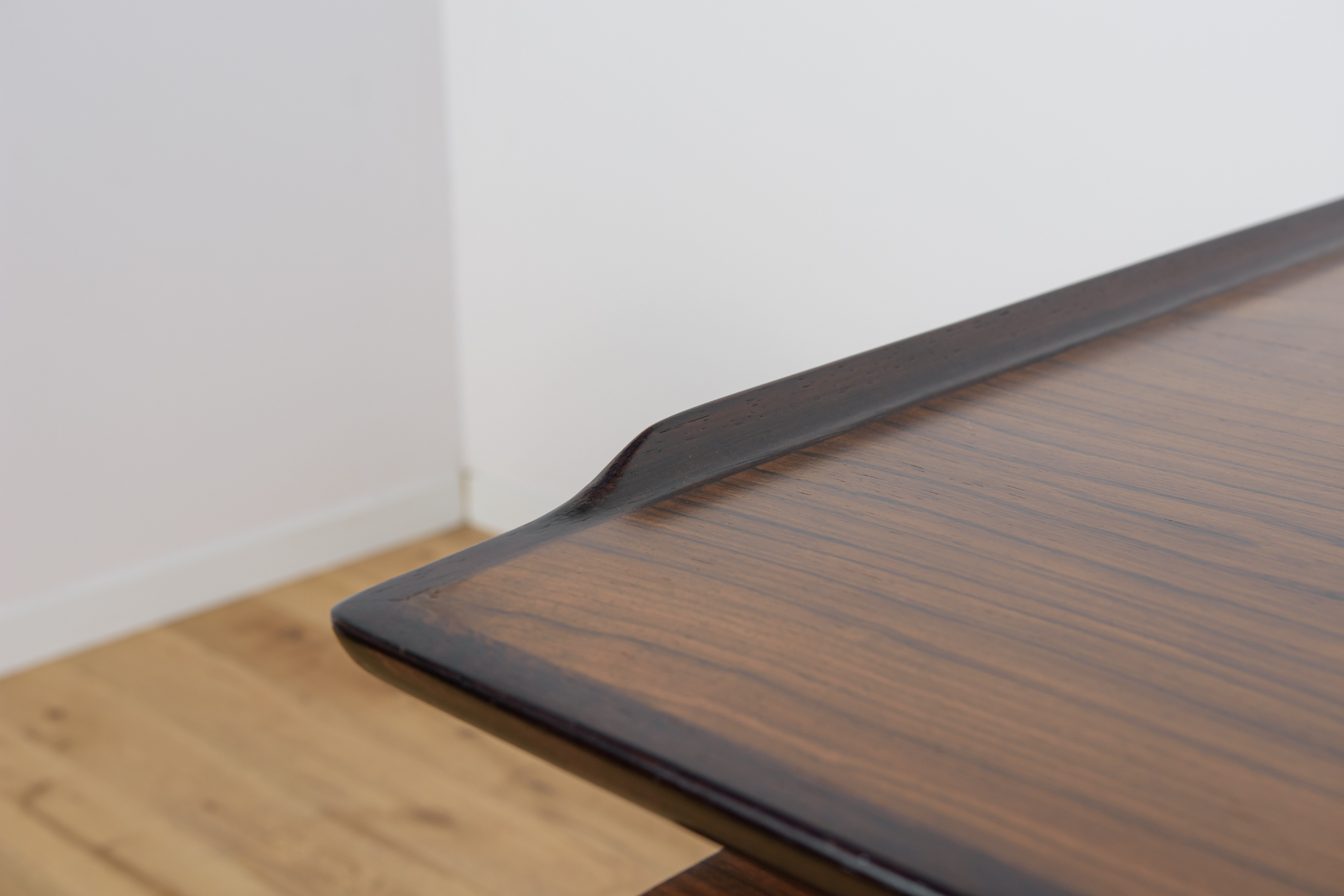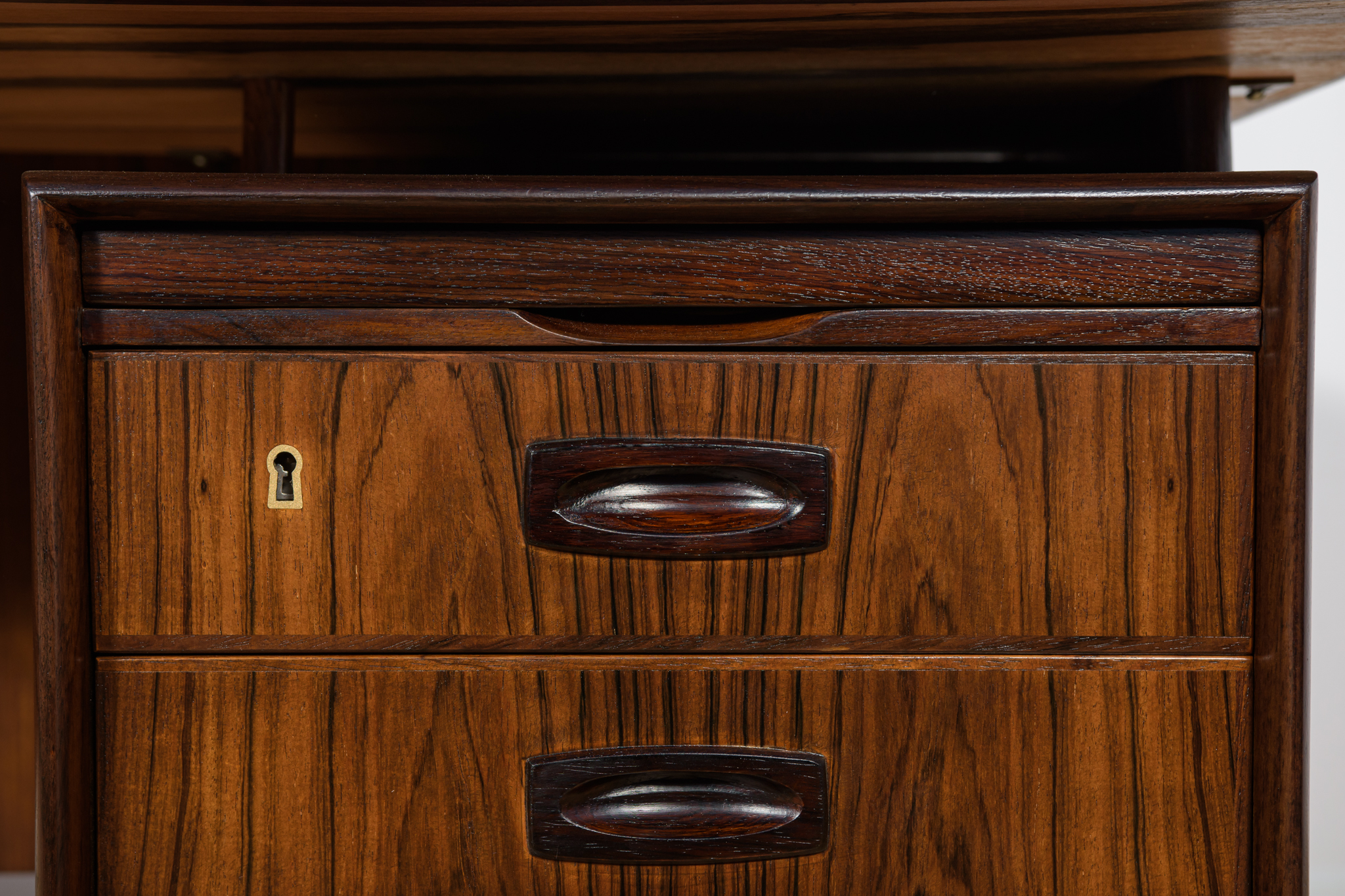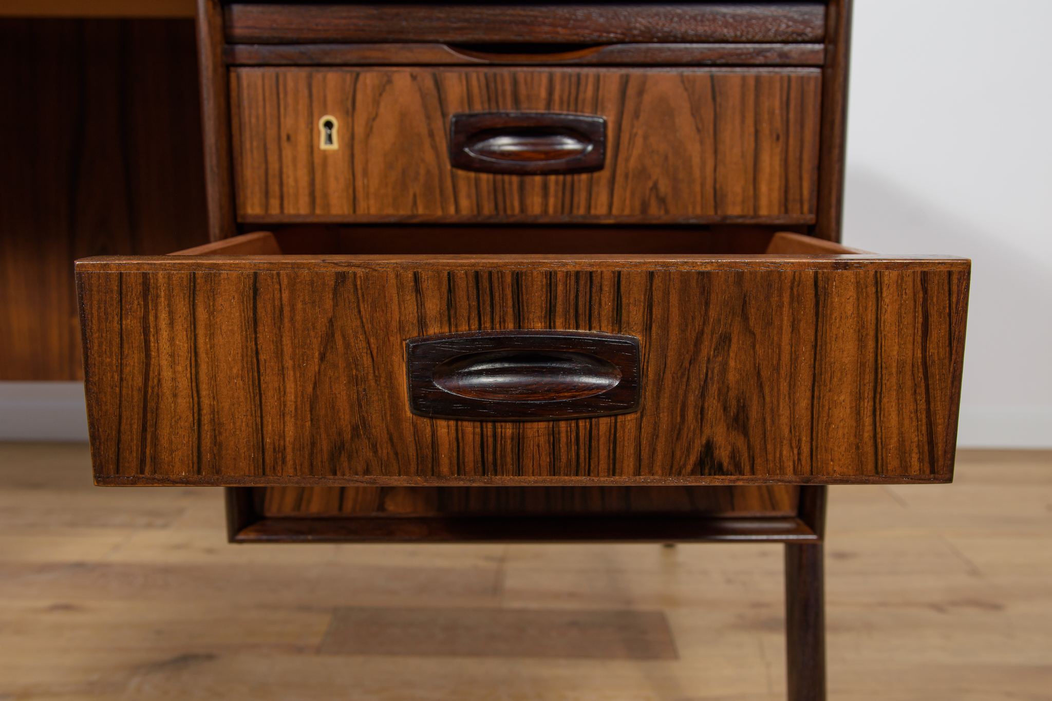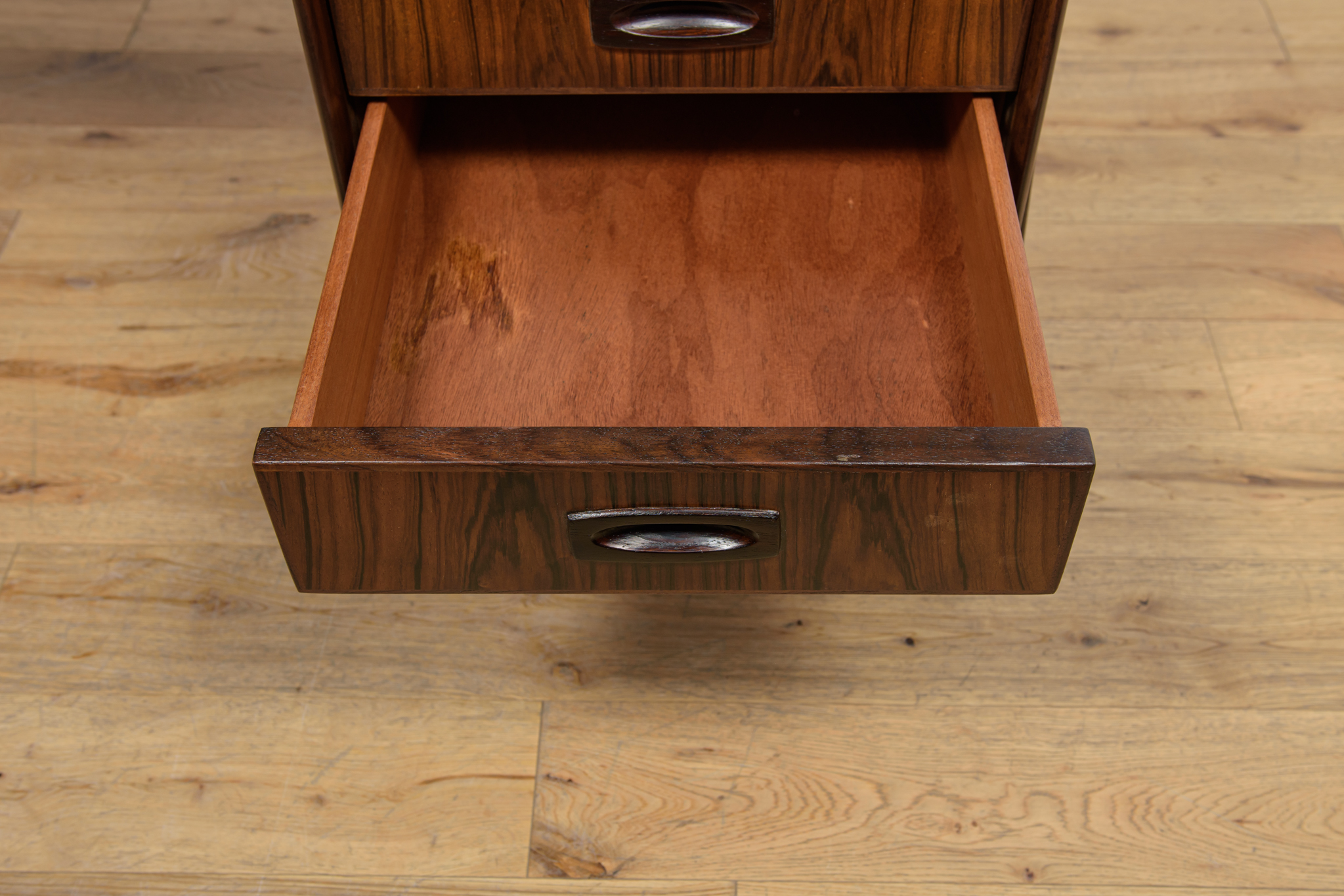 Wolnostojące duże biurko wyprodukowane w Danii w latach 60. Mebel został wykonany z drewna palisandrowego, posiada wyprofilowane uchwyty i ranty blatu. Biurko wolnostojące składa się z dwóch modułów, po lewej stronie, znajduje się głęboka szuflada na akta i wysuwany blat, z prawej trzy szuflady i wysuwany blat. Od strony frontalnej znajduje się półka na książki, zamykana przesuwnymi drzwiami. Biurko jest po kompleksowej renowacji, zostało oczyszczone ze starej powłoki, barwione bejcą w kolorze palisandru, wykończone mocnym półmatowym lakierem. Mebel posiada klucz do szuflad.