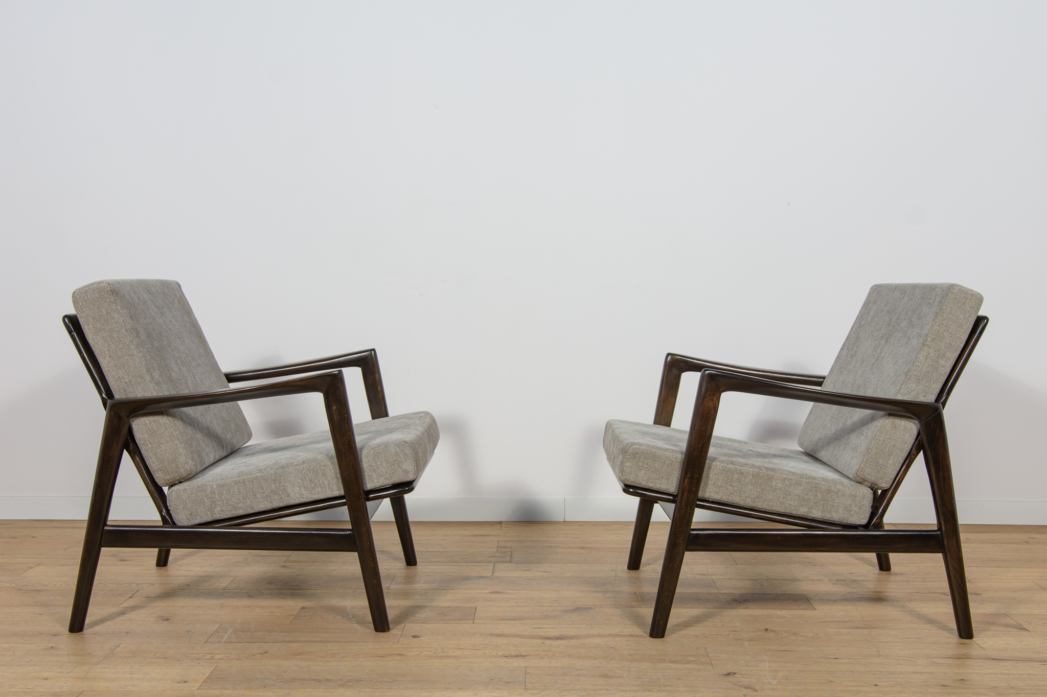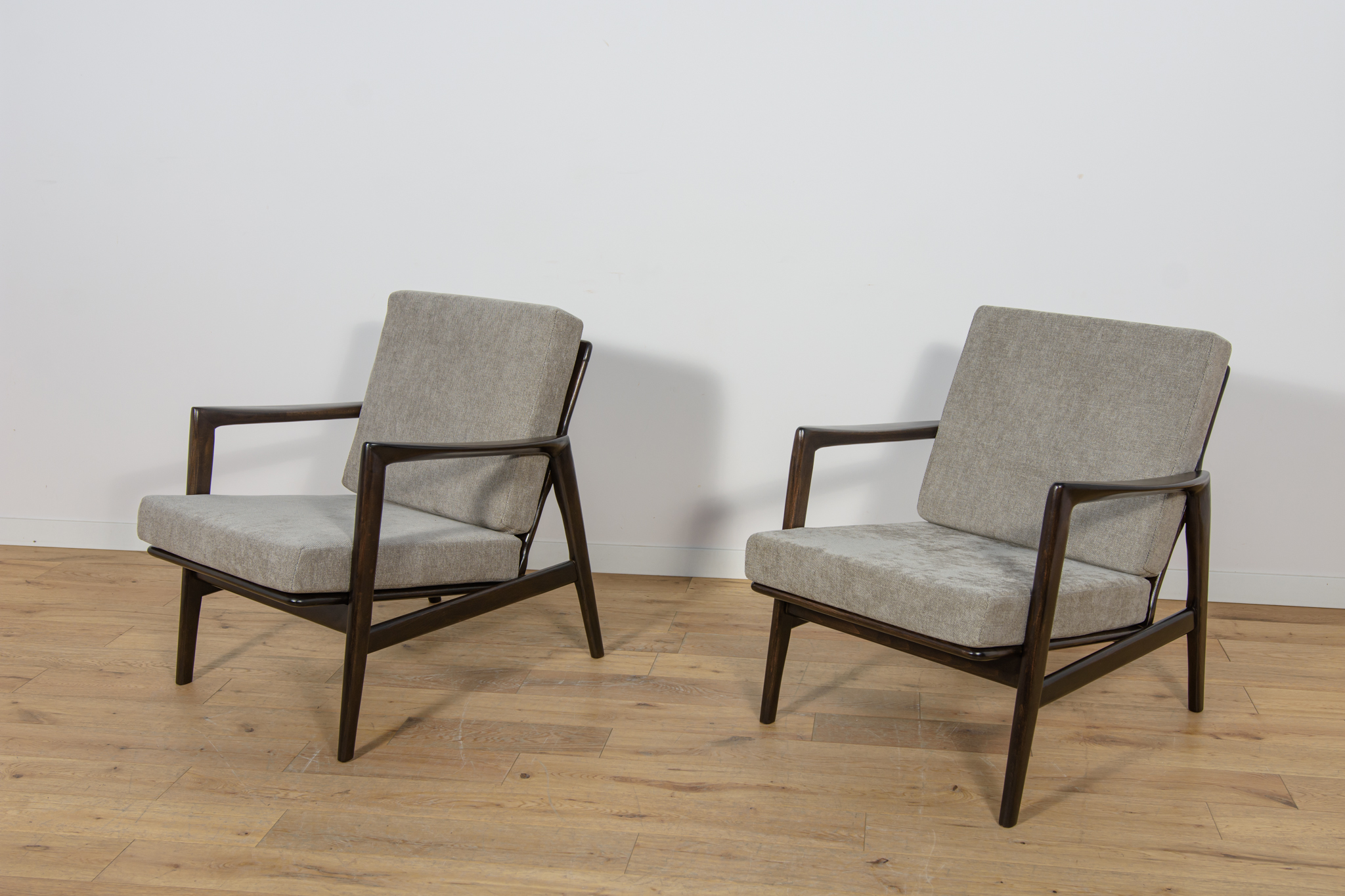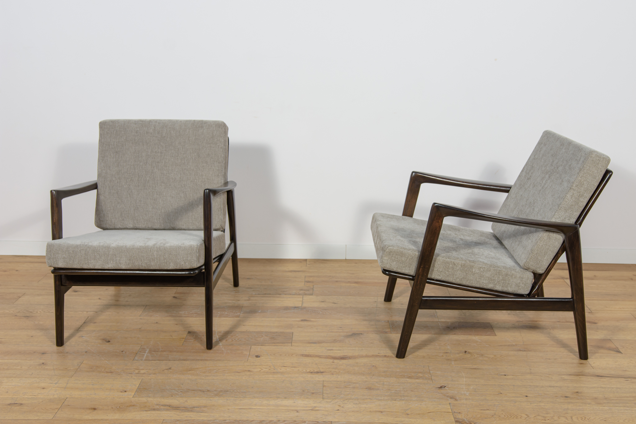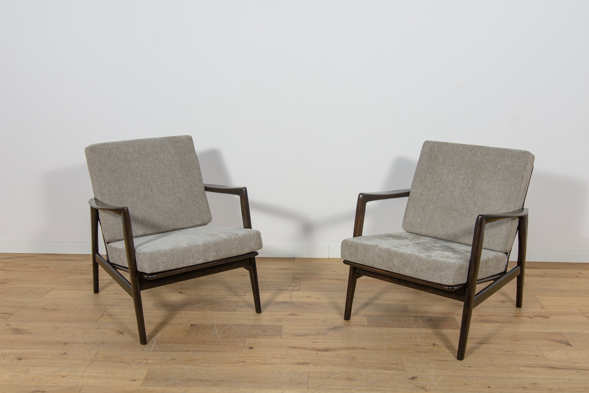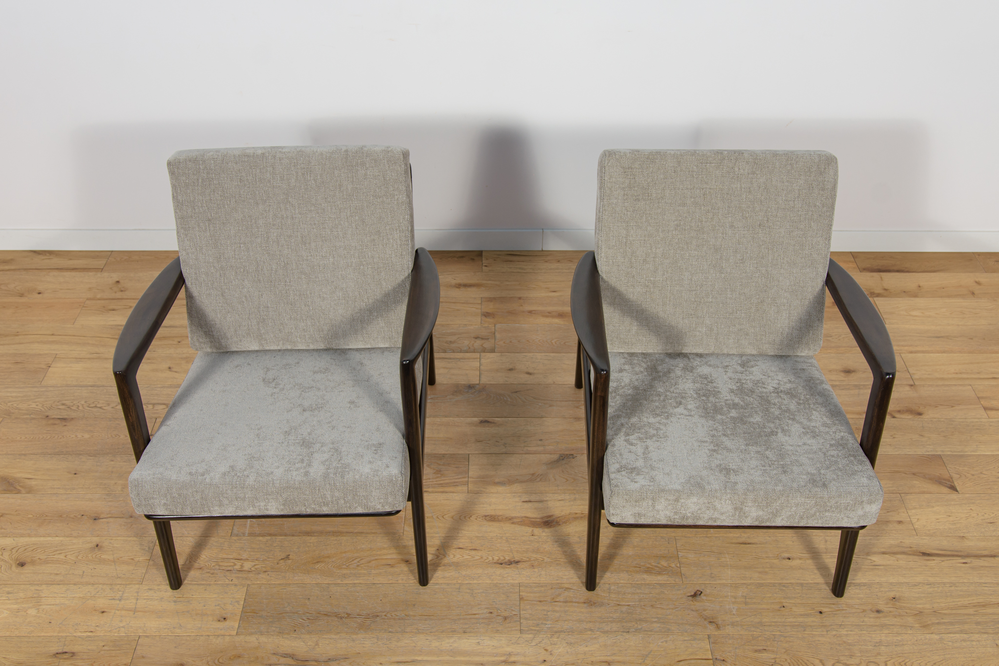 Para foteli typu 300-139 z Swarzędzkiej Fabryki Mebli, wyprodukowanych w latach 60. Wygodne fotele o unikatowej linii na wzór skandynawski.. Fotele przeszły profesjonalną renowacje stolarsko-tapicerską. Drewno bukowe oczyszczone ze starej powierzchni, pomalowane bejcą w kolorze palisandrowym. Poduszki wymienione na nowe w kolorze szarym.