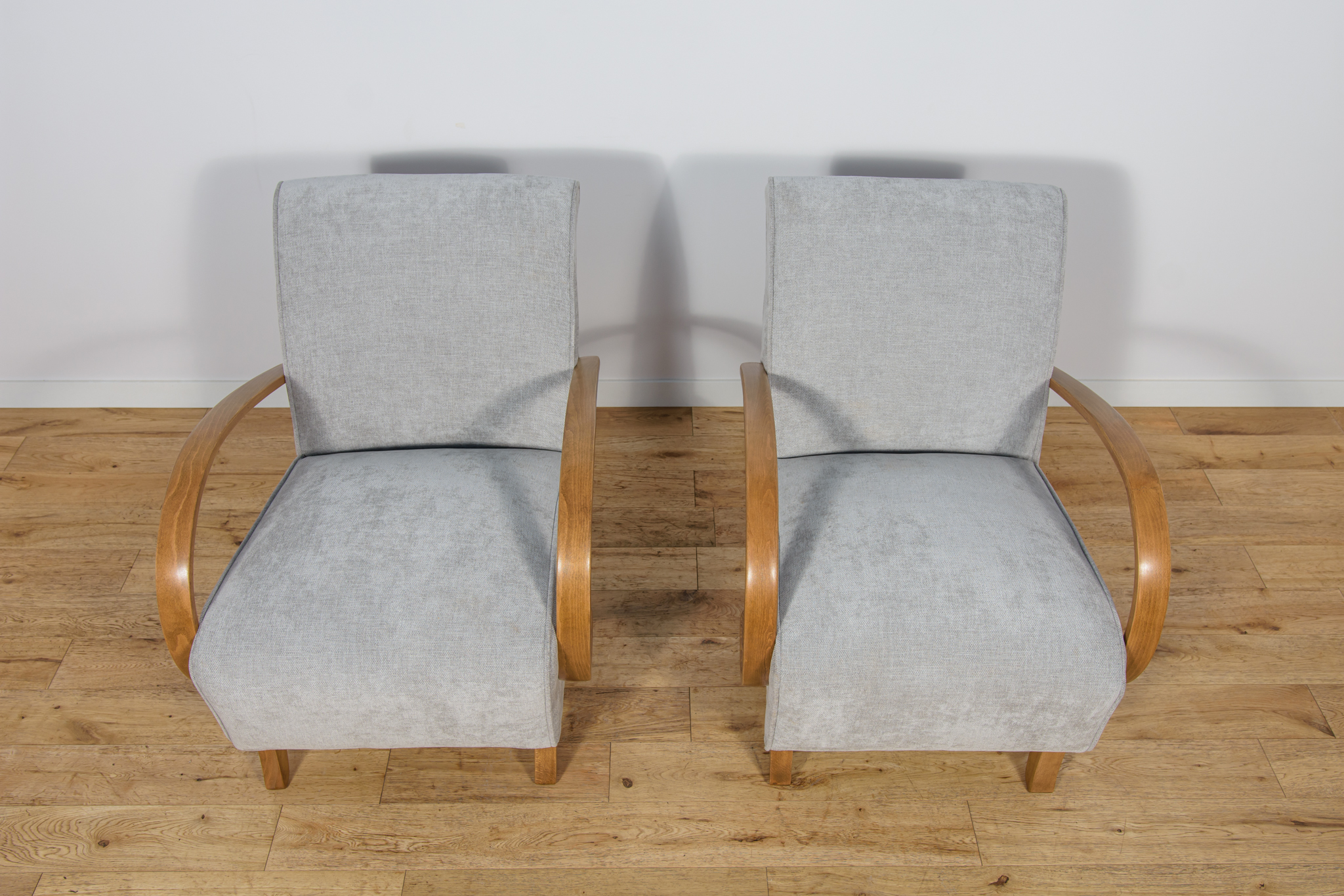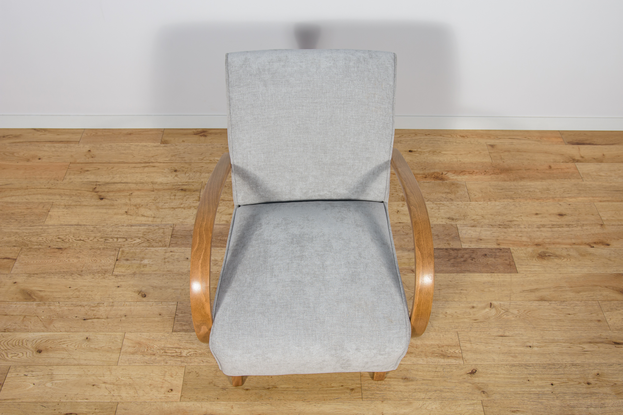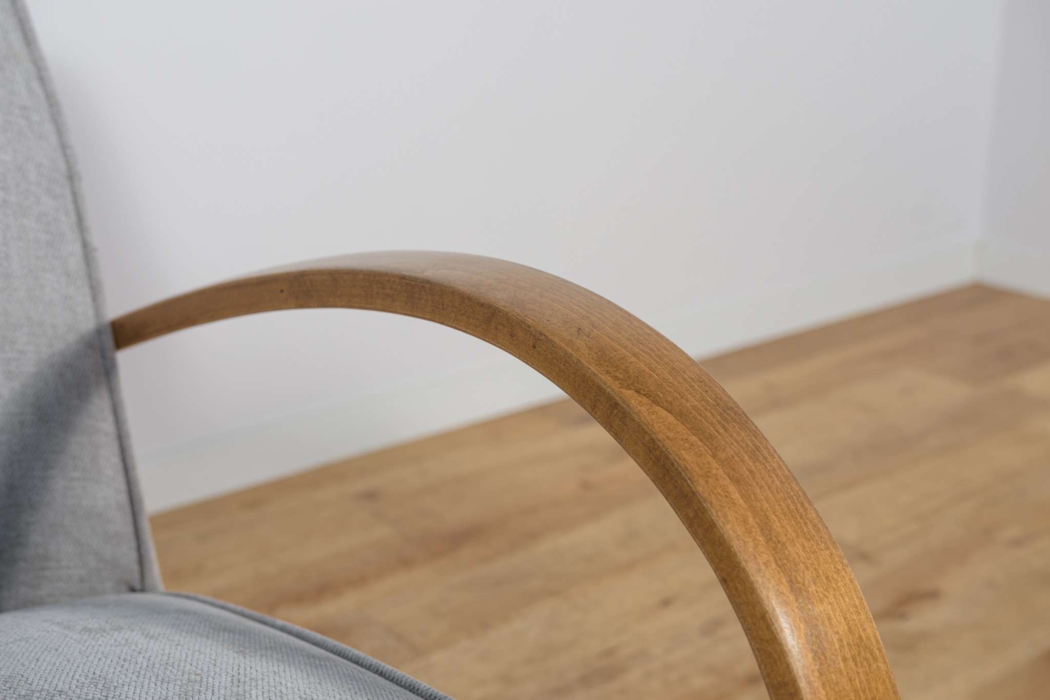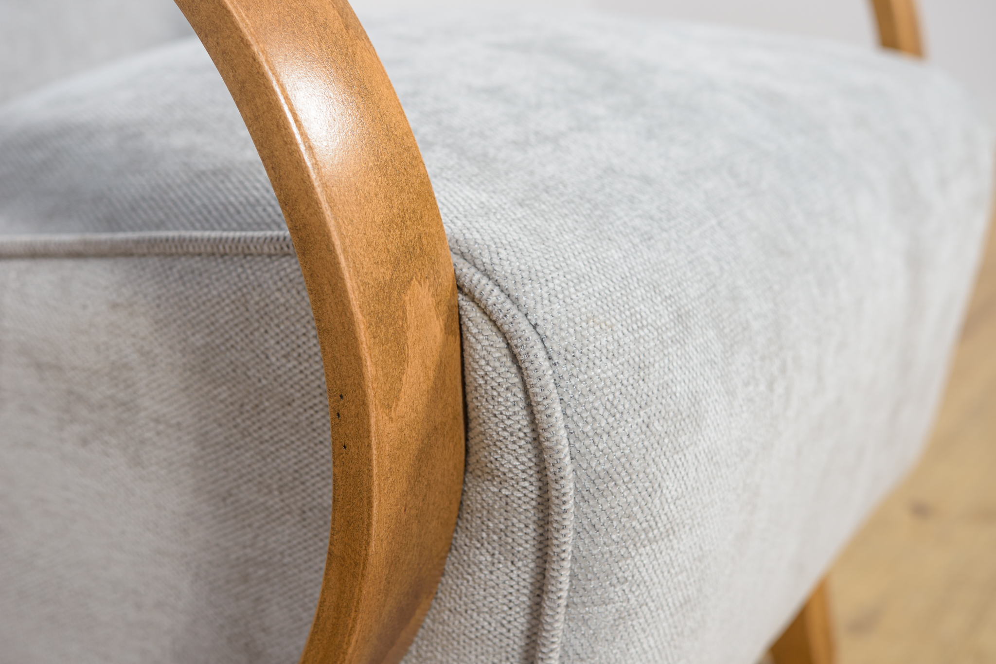 Para foteli Model H-410 projektu Jindřicha Halabali pochodzi z lat 30. Mebel został wykonany w fabryce UP Zavody w Czechosłowacji. Do jego produkcji wykorzystano opracowaną przez firmę Thonet metodę gięcia drewna. Fotele przeszły profesjonalną renowację tapicerską i stolarską. Renowacja tapicerska została wykonana tradycyjną metodą rzemieślniczą, z zastosowaniem sprężyn i pasów. Fotele zostały obite wysokogatunkową tkaniną w kolorze jasno szarym. Elementy drewniane zostały oczyszczone ze starej powierzchni, barwione bejcą w kolorze dębu, wykończone mocnym półmatowym lakierem.