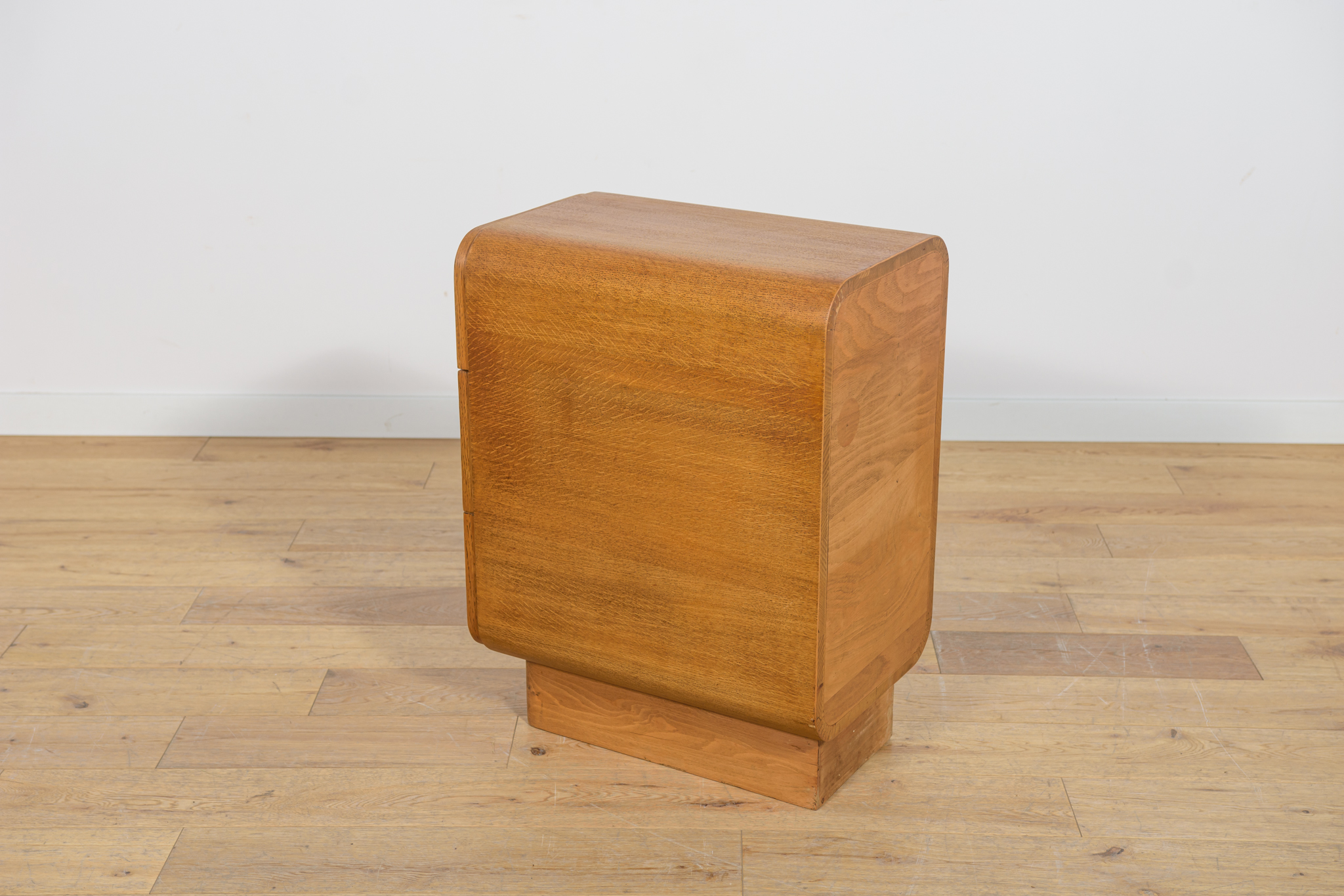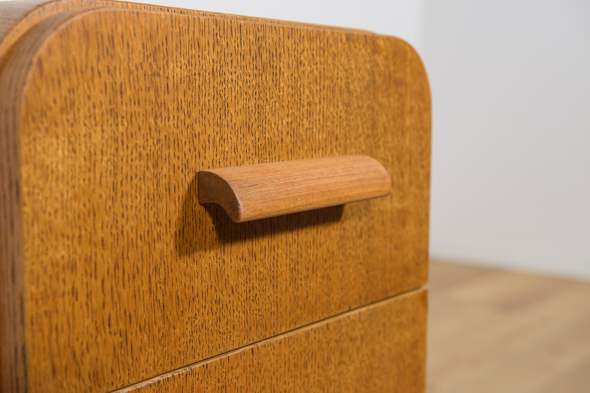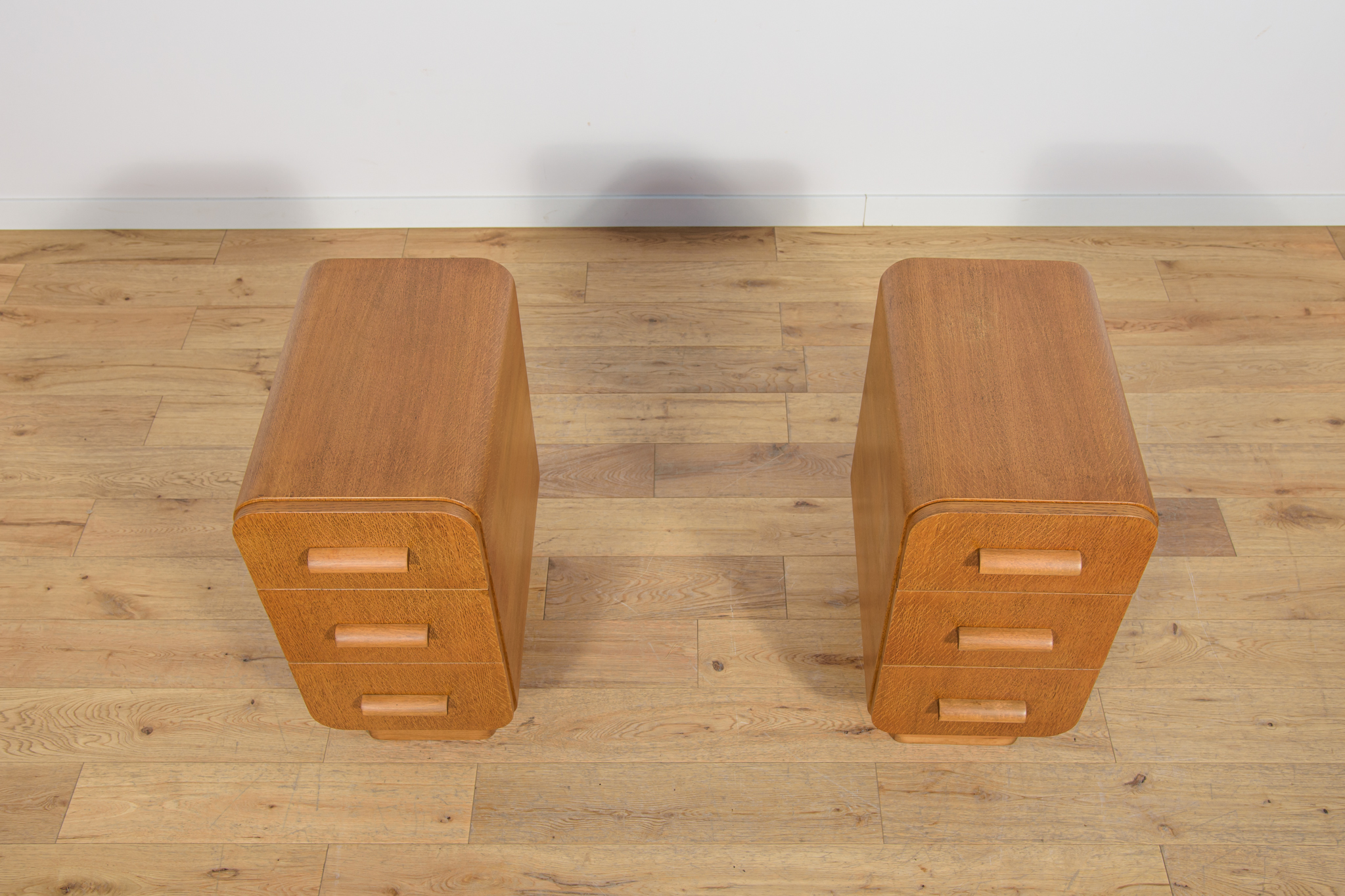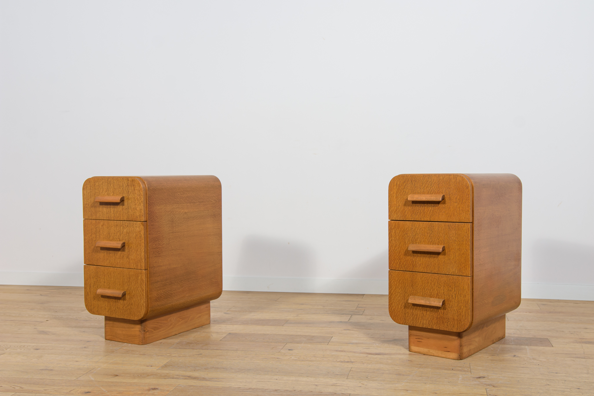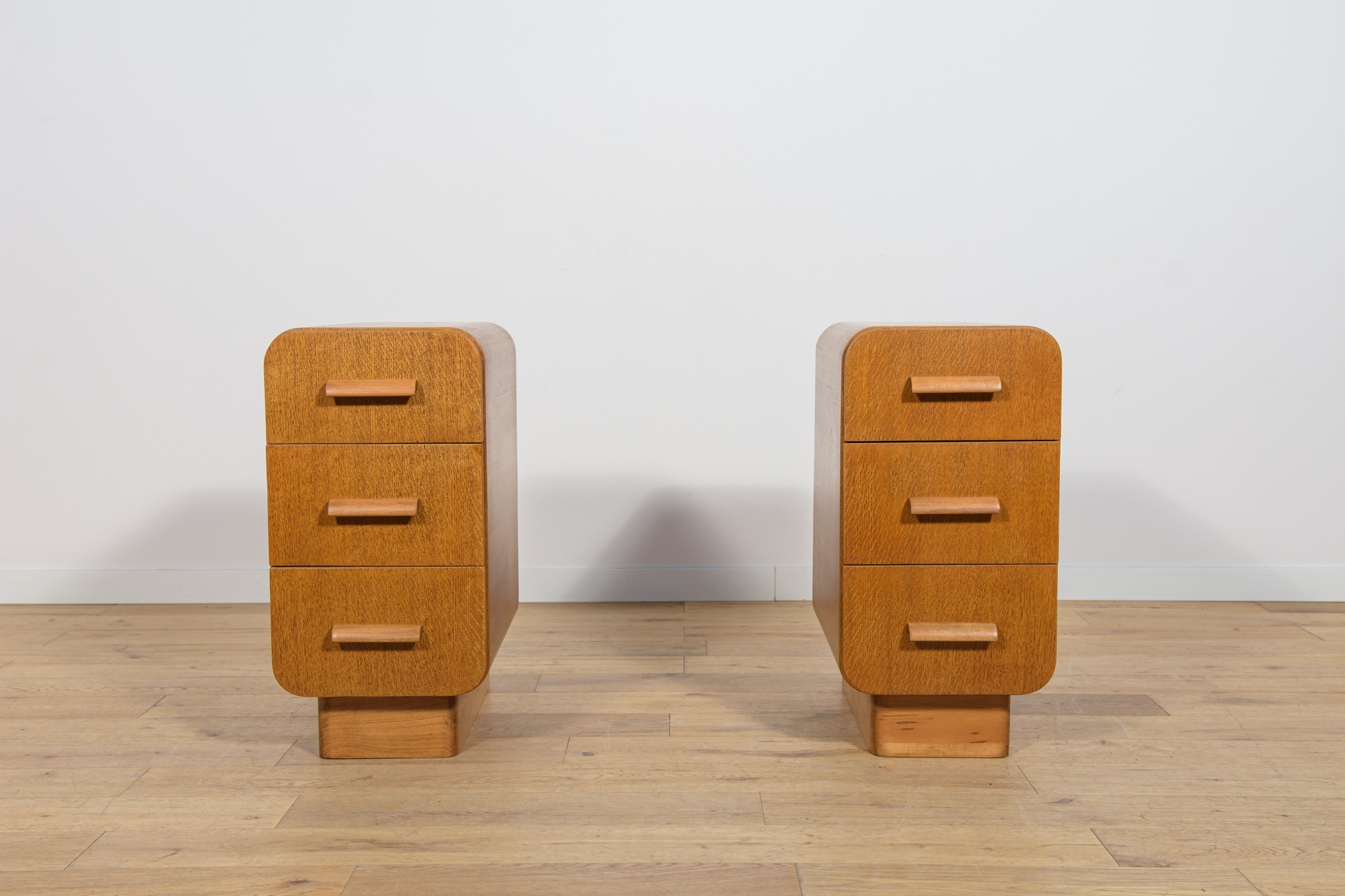 Para szafek nocnych w stylu Art Deco wyprodukowana w czechosłowackiej manufakturze Former w latach 50 ubiegłego wieku. Szafki posiadają zaokrąglone kształty, nadające mu unikalnego charakteru. Szuflady posiadają wyprofilowane, zaokrąglone dna. Mebel z drewna dębowego i bukowego po kompleksowej renowacji, został oczyszczony ze starej powłoki, wykończony woskiem o barwie dębu średniego.