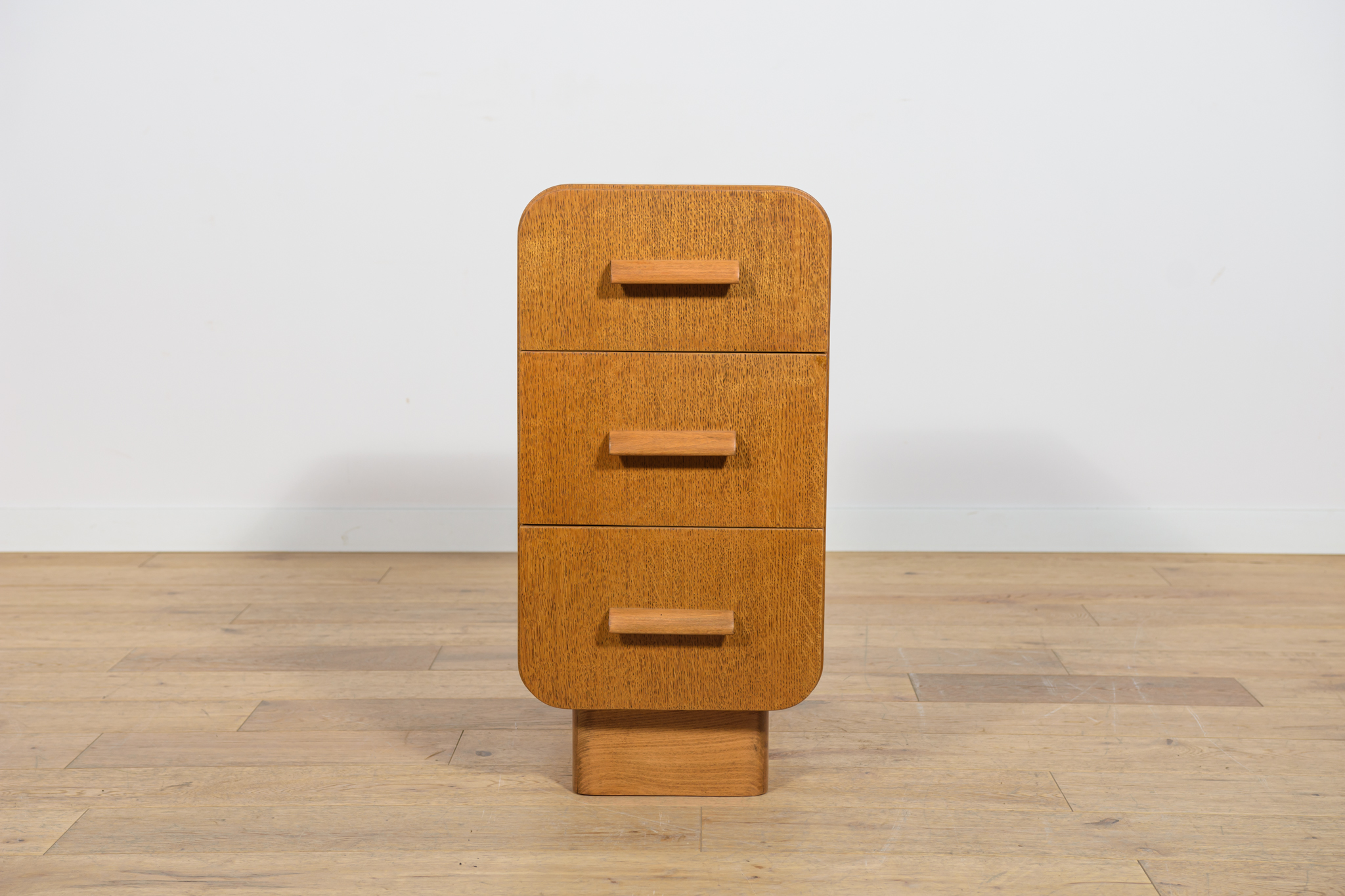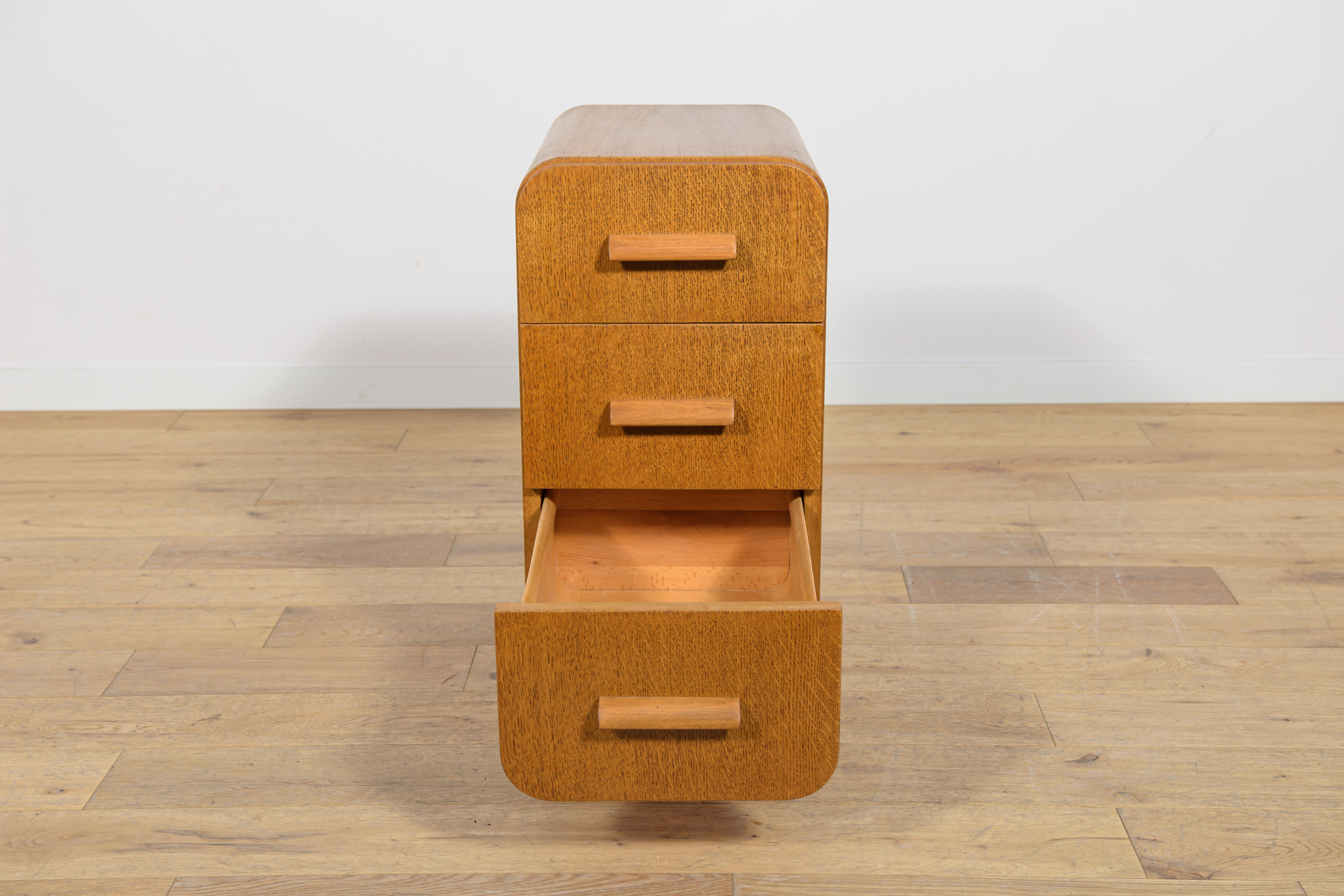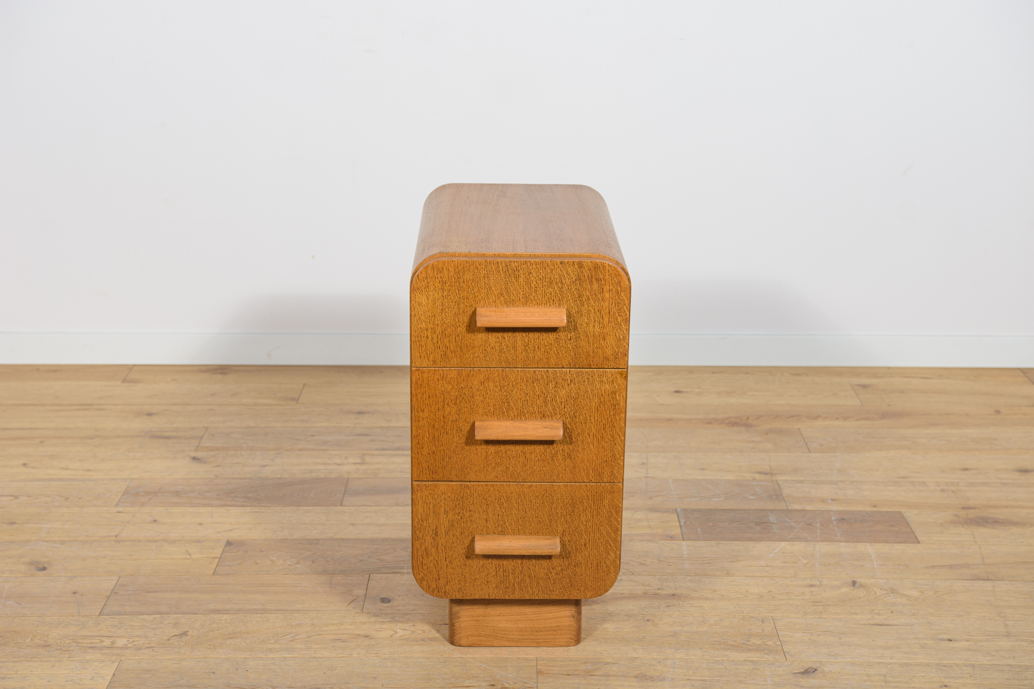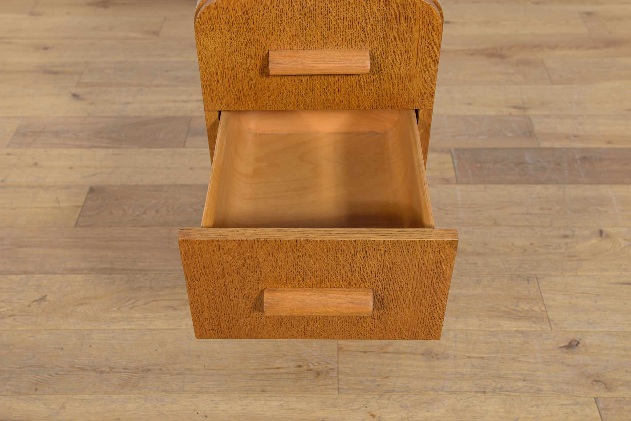 Para szafek nocnych w stylu Art Deco wyprodukowana w czechosłowackiej manufakturze Former w latach 50 ubiegłego wieku. Szafki posiadają zaokrąglone kształty, nadające mu unikalnego charakteru. Szuflady posiadają wyprofilowane, zaokrąglone dna. Mebel z drewna dębowego i bukowego po kompleksowej renowacji, został oczyszczony ze starej powłoki, wykończony woskiem o barwie dębu średniego.