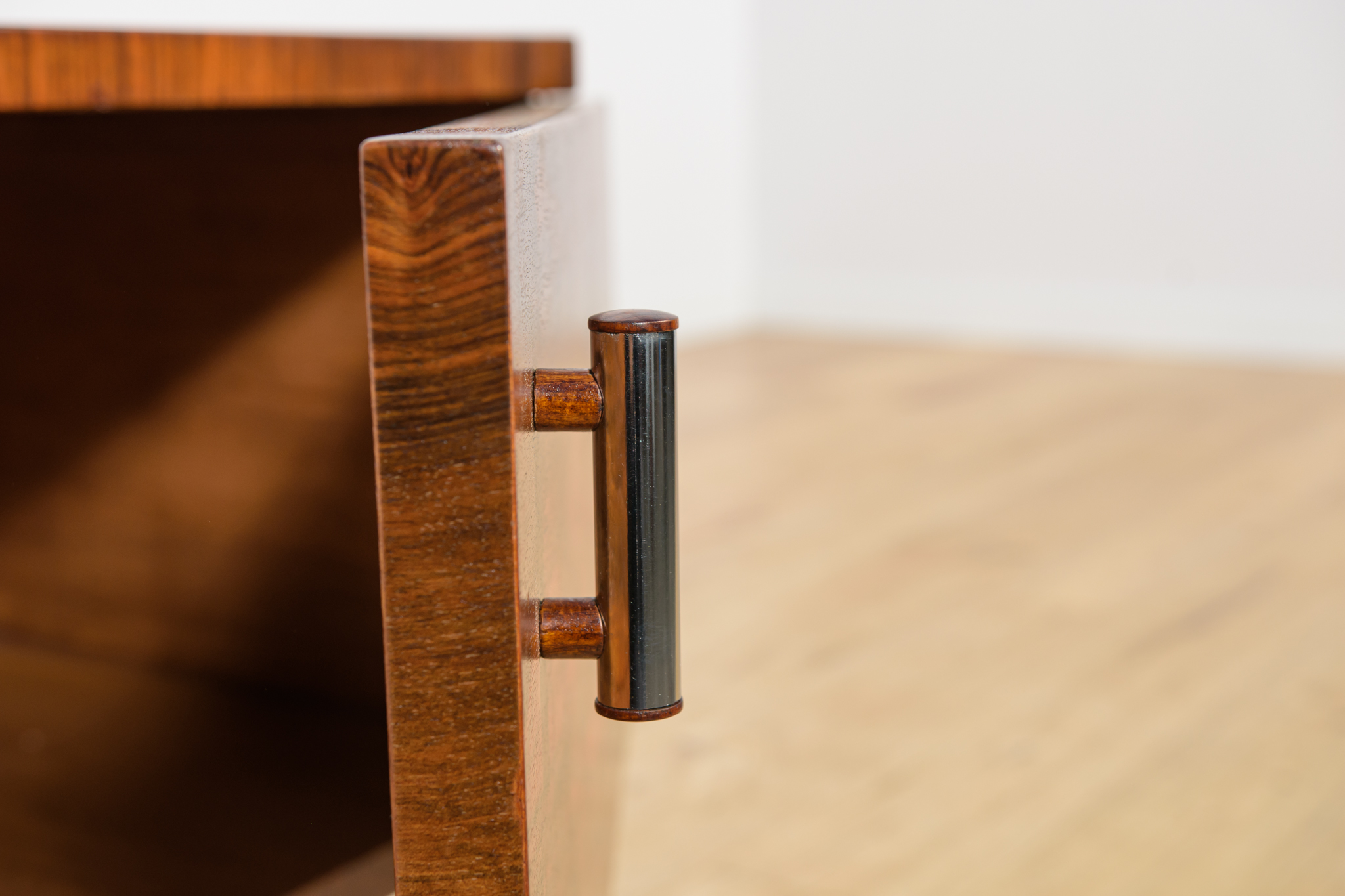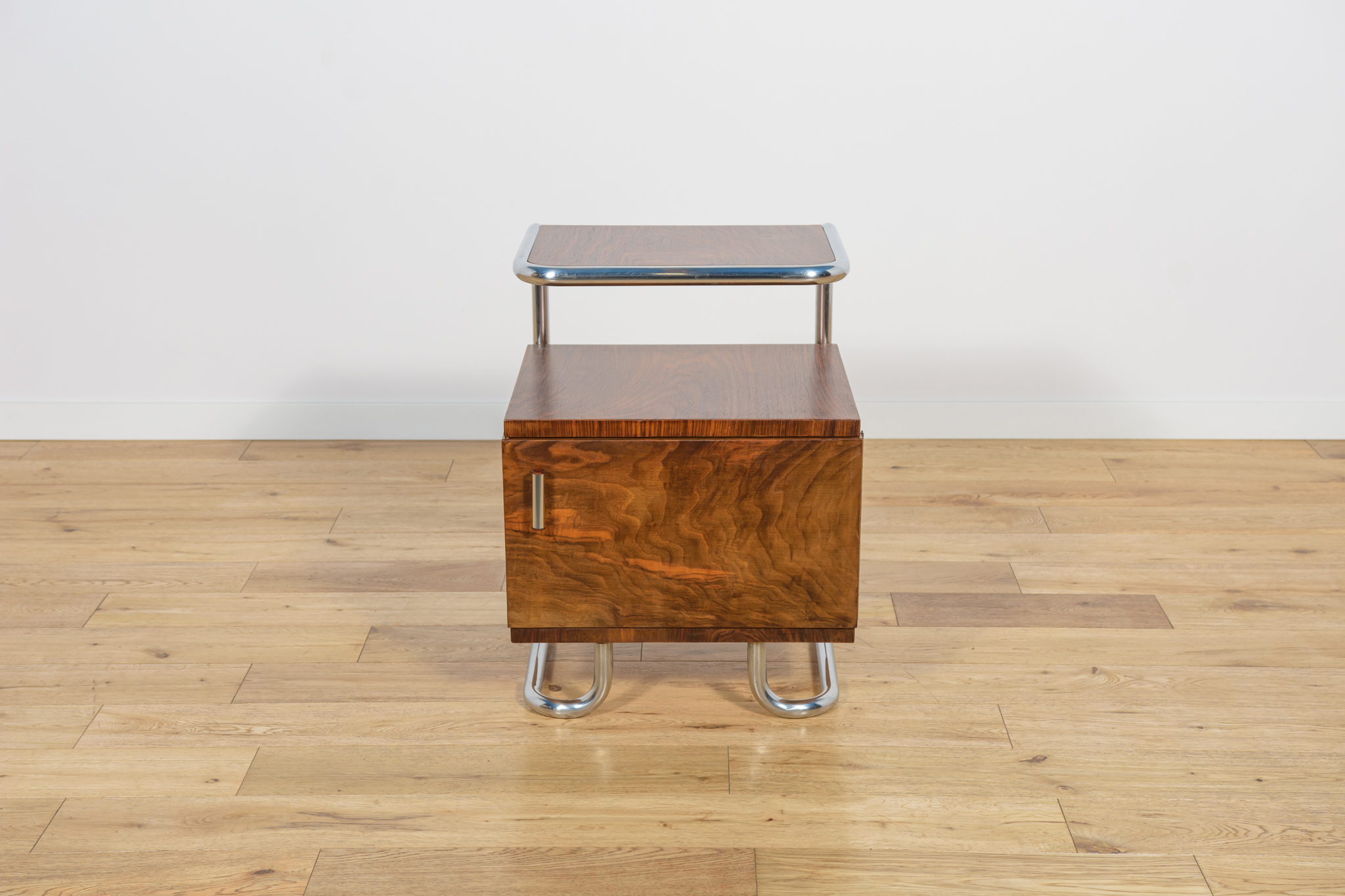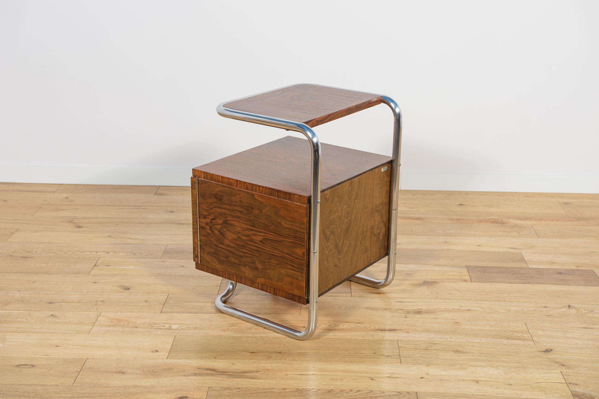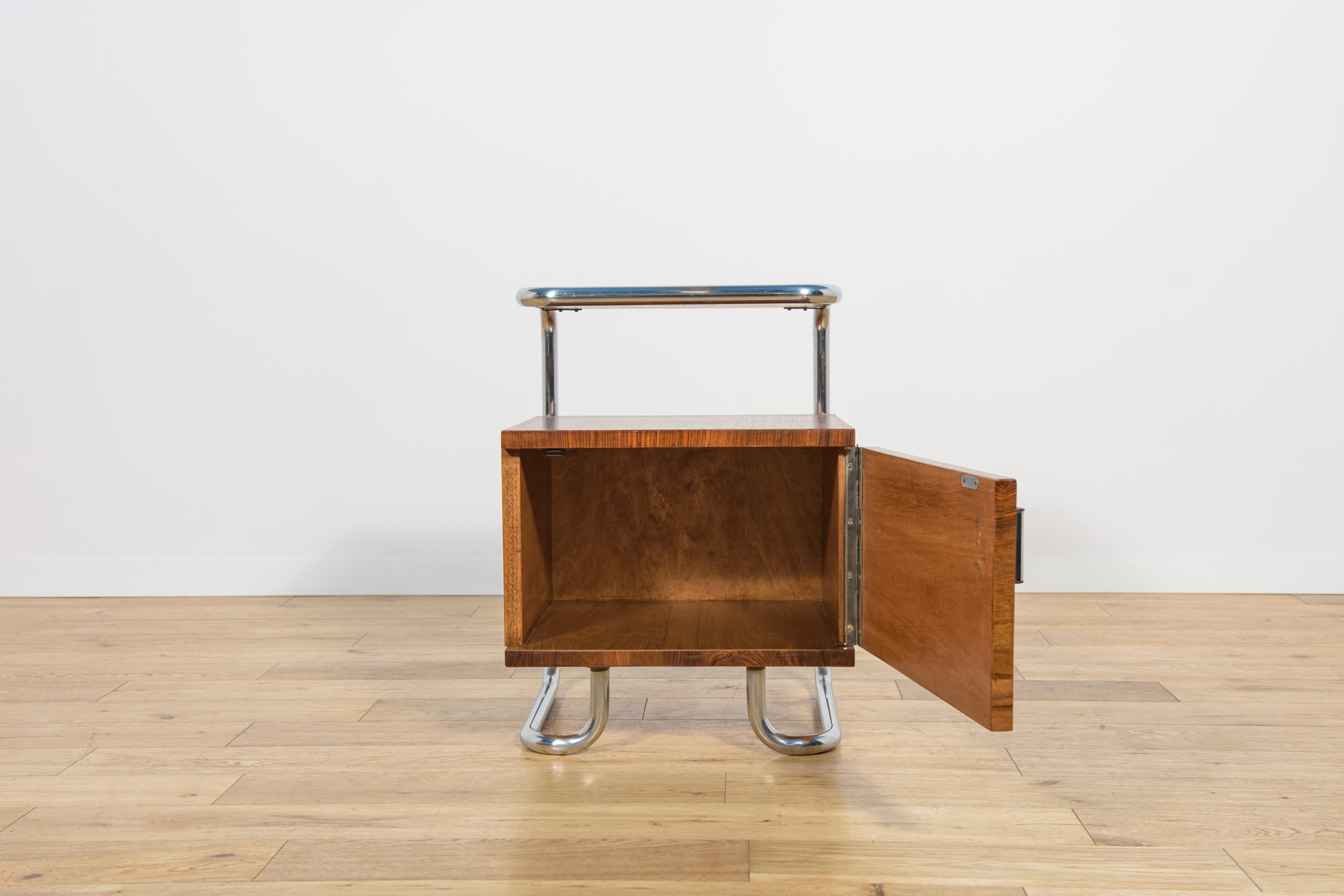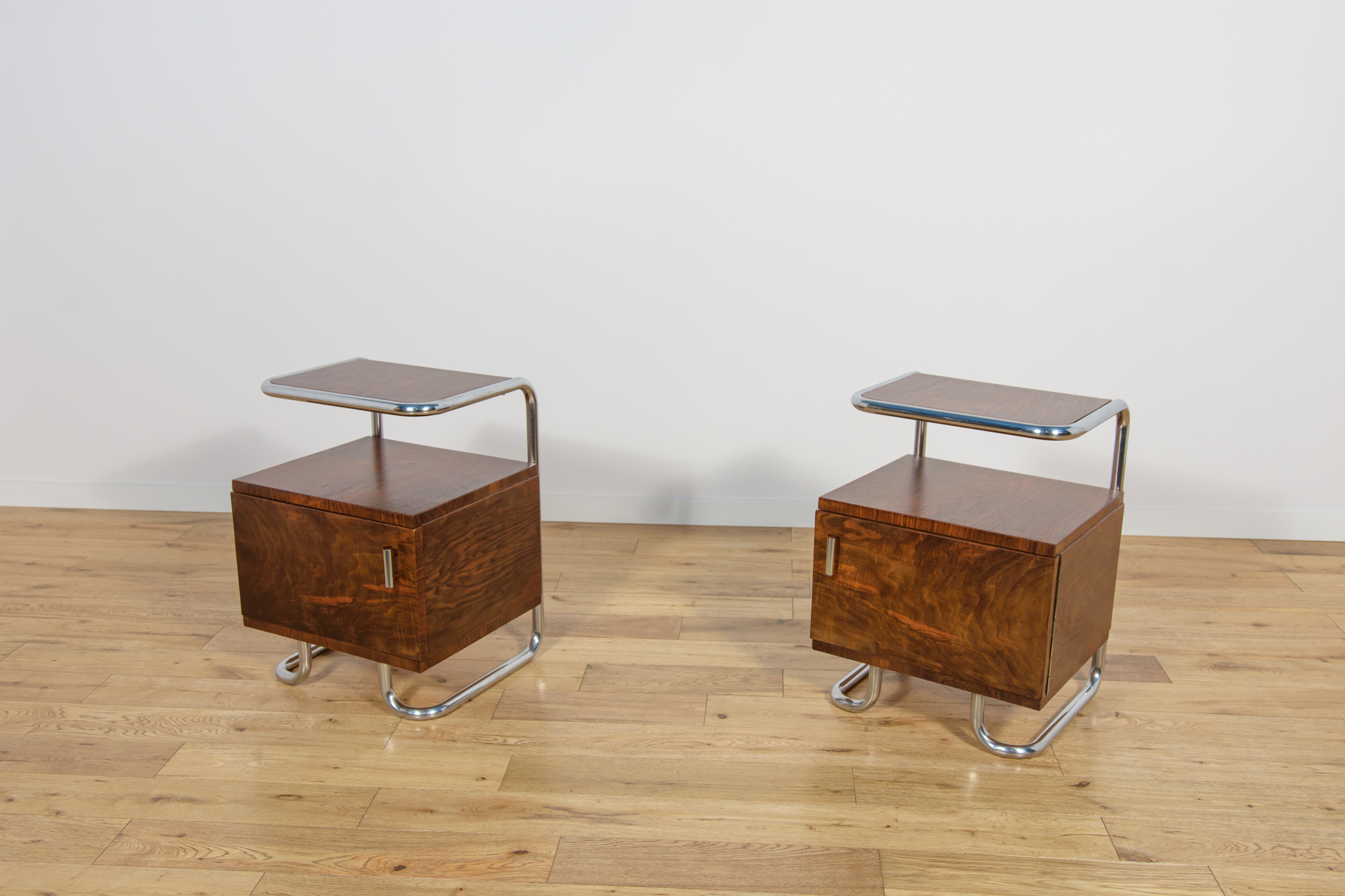 Para szafek nocnych w stylu Bauhaus wyprodukowanych w czechosłowackiej manufakturze Mücke-Melder w latach 30-tych ubiegłego wieku. Manufaktura Mücke-Melder było w okresie międzywojennym wpływowym, modernistycznego producentem mebli, specjalizującego się w projektach z rur stalowych. Mebel poddany kompleksowej renowacji. Szafki fornirowane ciekawym fornirem orzechowym, zostały oczyszczone ze starej powierzchni, wykończone wysokogatunkowym olejem duńskim. Elementy chromowane zostały oczyszczone i wypolerowane, są w stanie bardzo dobrym.