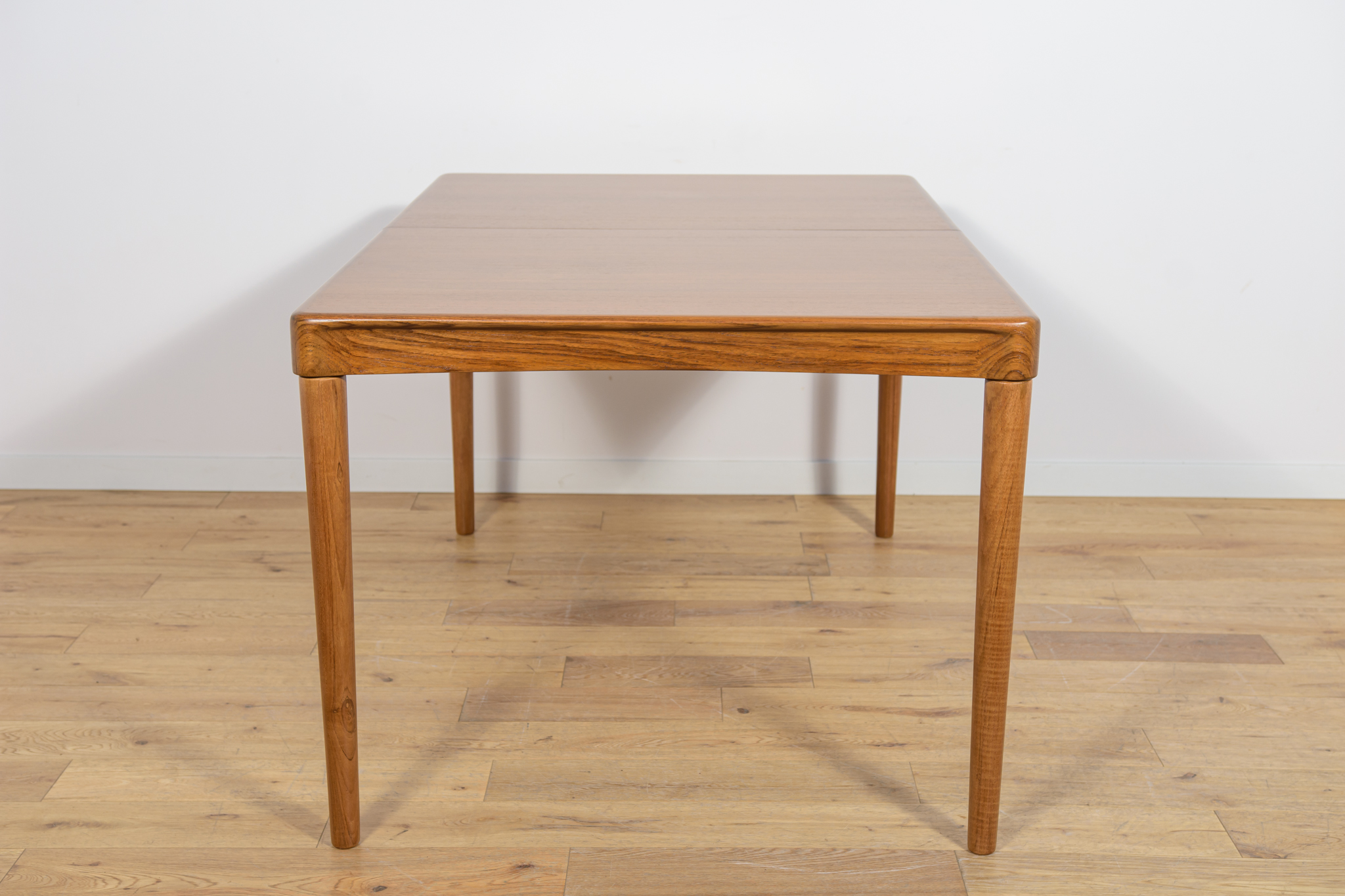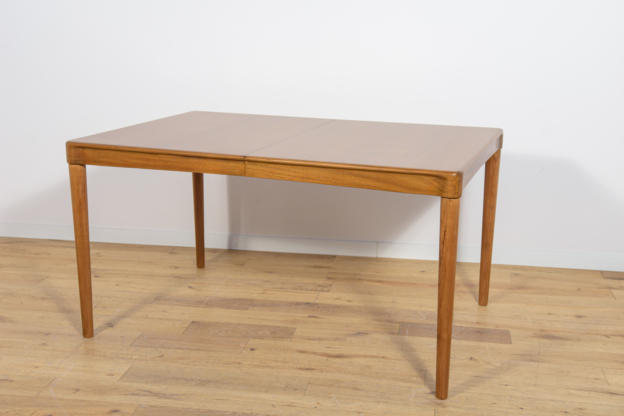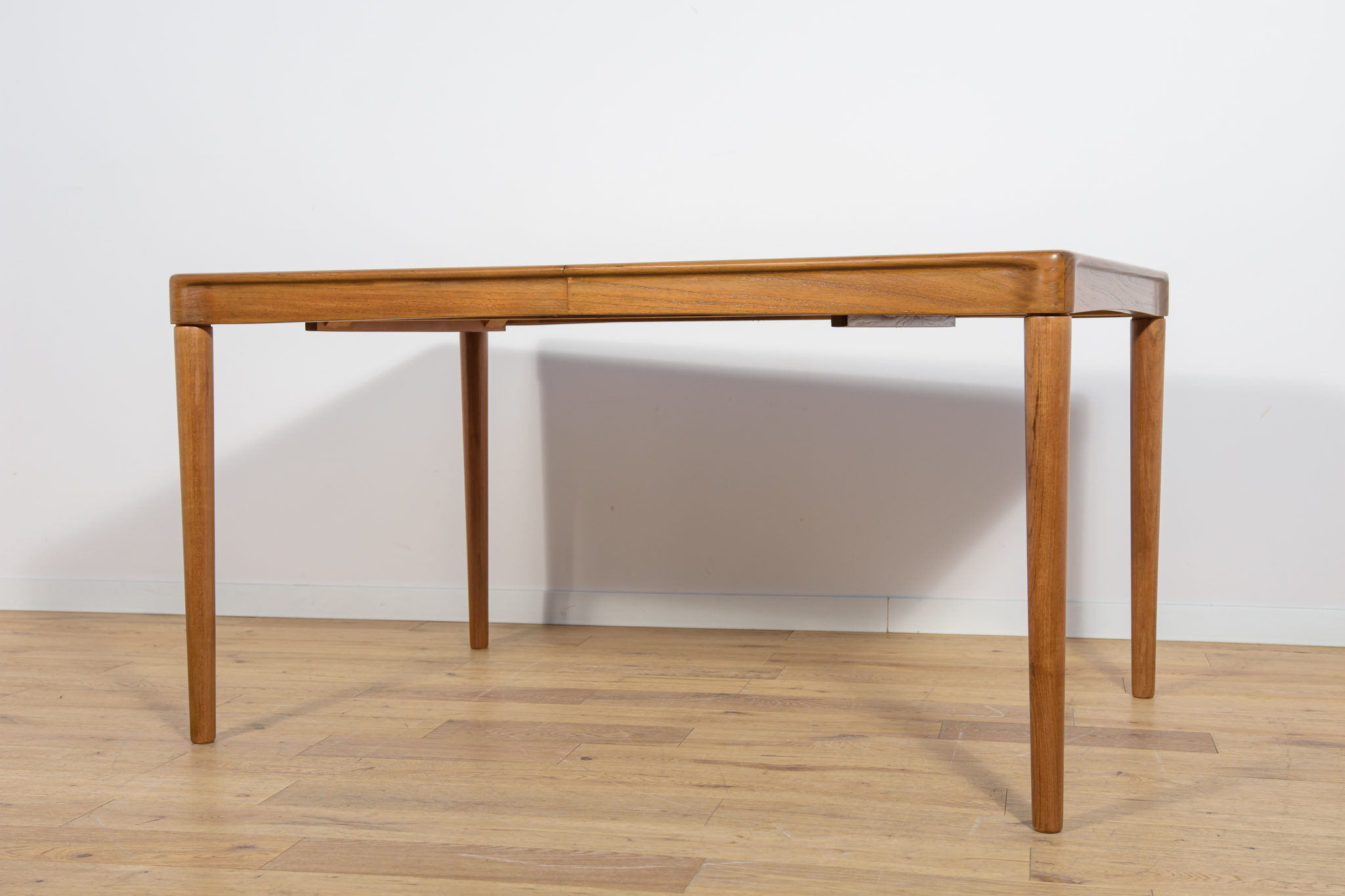 Unikatowy stół jadalny wykonany z drewna tekowego przez Henry Walter Klein dla duńskiej manufaktury Bramin. Stół charakterystyczny dla duńskiego designu połowy XX w, charakteryzuje się wysokim poziomem wzornictwa jak i zastosowanych materiałów. Zachwyca swoimi organicznymi liniami i dopracowanymi detalami, w szczególności uwagę przykuwa konstrukcja nóg i detale narożne. Mebel po profesjonalnej renowacji, został oczyszczone ze starej powierzchni, barwiony bejcą dębową, wykończony mocnym lakierem półmatowym. Stół rozszerza się poprzez jedną dostawkę z 135 cm do 195 cm.