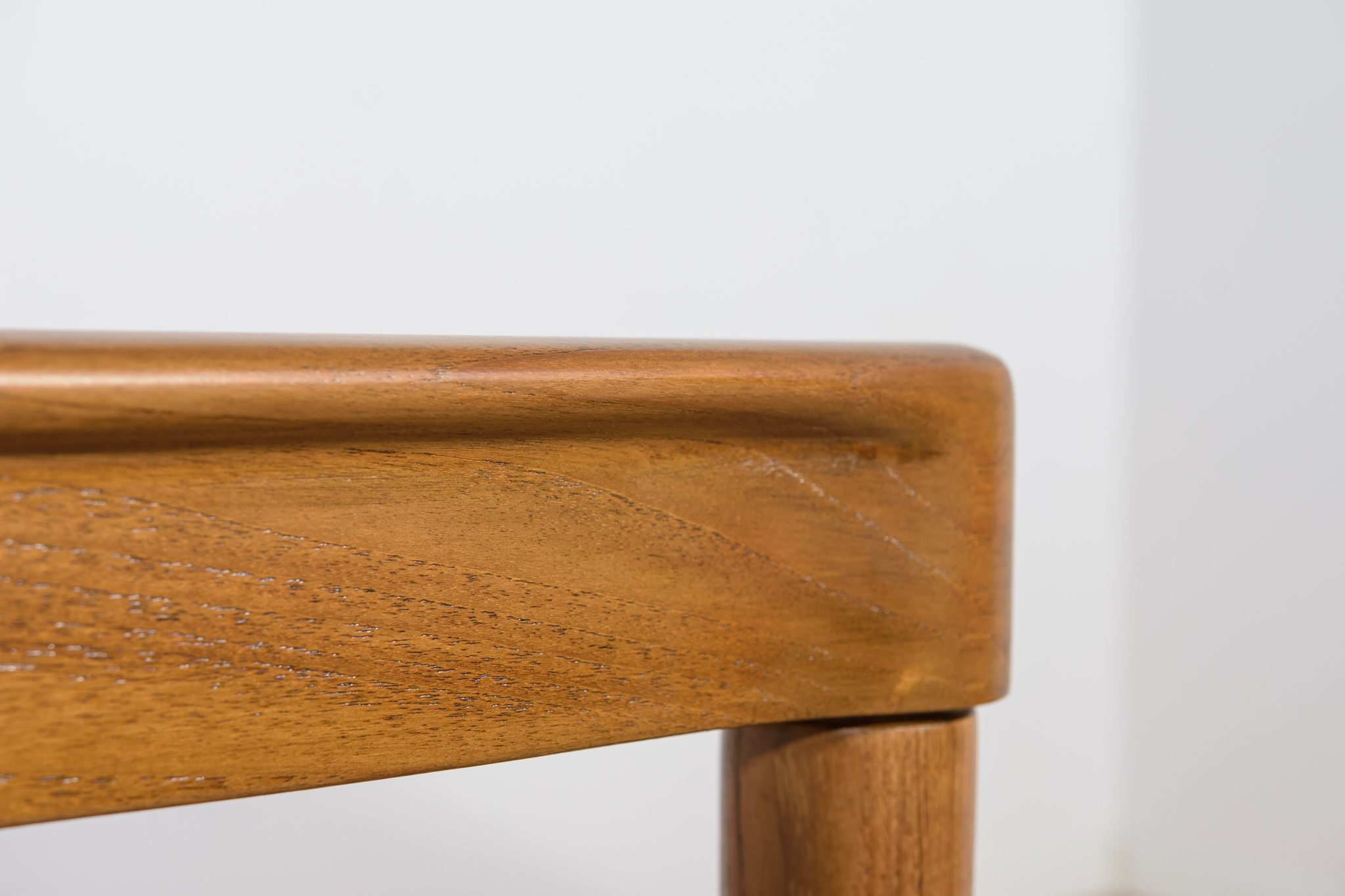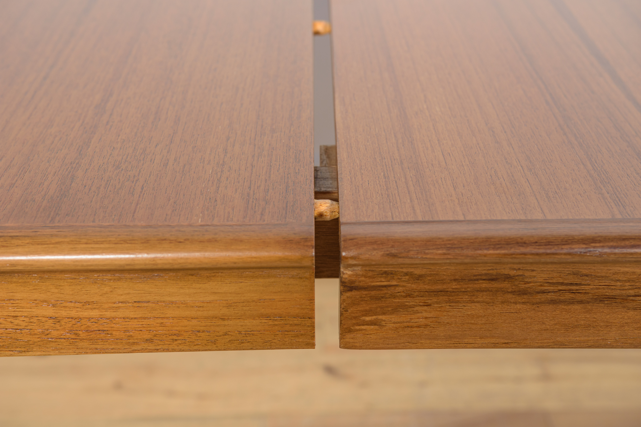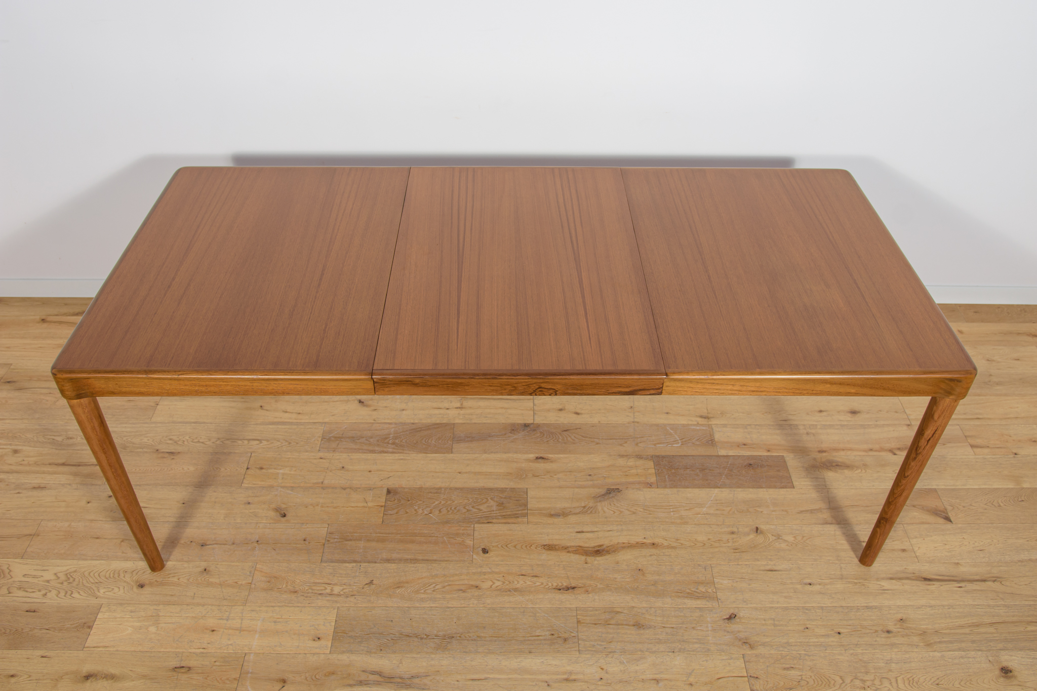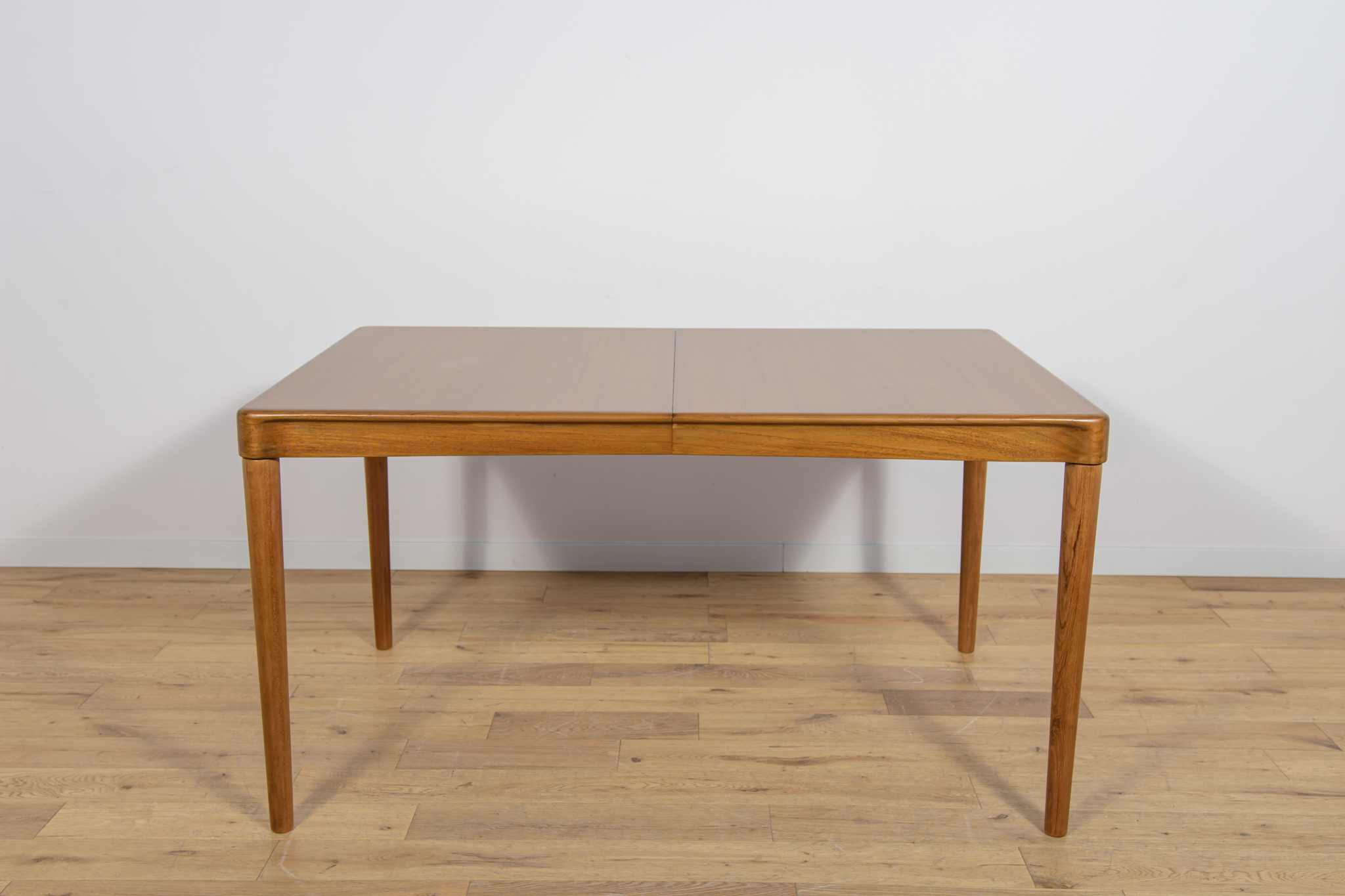 Unikatowy stół jadalny wykonany z drewna tekowego przez Henry Walter Klein dla duńskiej manufaktury Bramin. Stół charakterystyczny dla duńskiego designu połowy XX w, charakteryzuje się wysokim poziomem wzornictwa jak i zastosowanych materiałów. Zachwyca swoimi organicznymi liniami i dopracowanymi detalami, w szczególności uwagę przykuwa konstrukcja nóg i detale narożne. Mebel po profesjonalnej renowacji, został oczyszczone ze starej powierzchni, barwiony bejcą dębową, wykończony mocnym lakierem półmatowym. Stół rozszerza się poprzez jedną dostawkę z 135 cm do 195 cm.