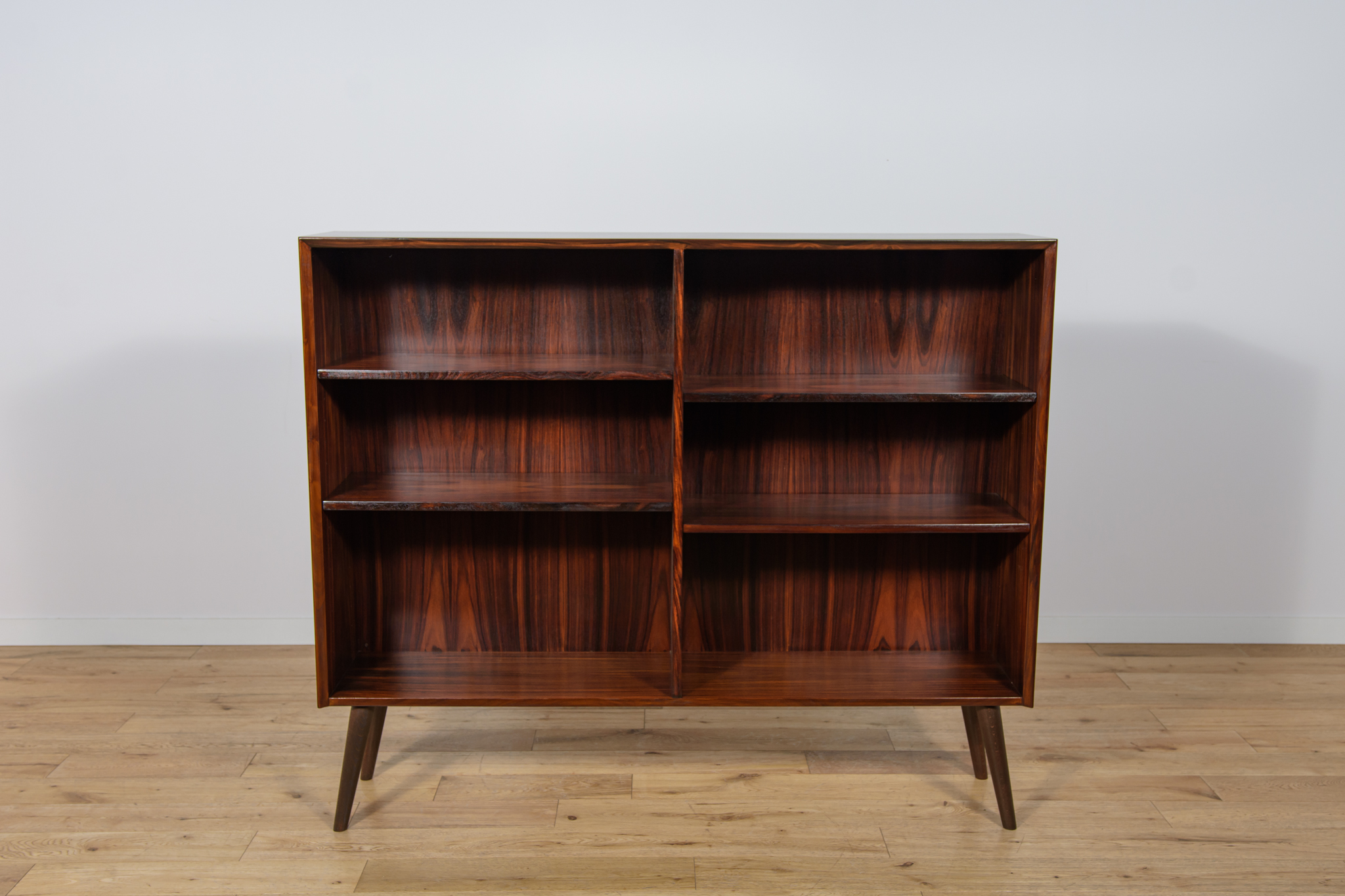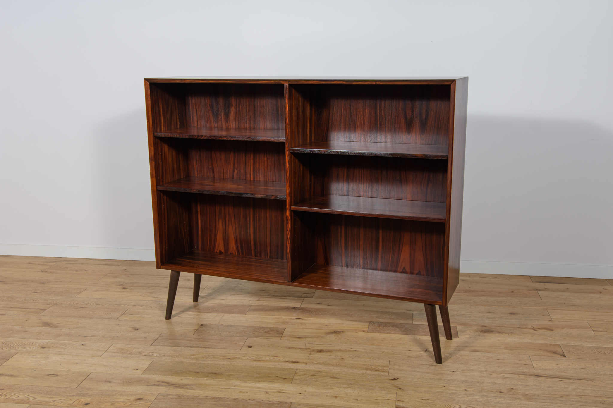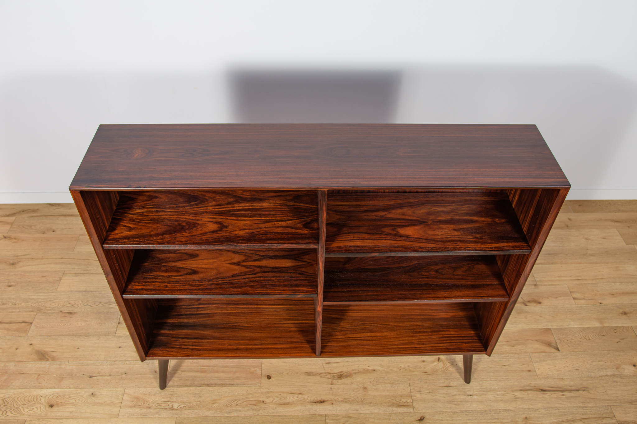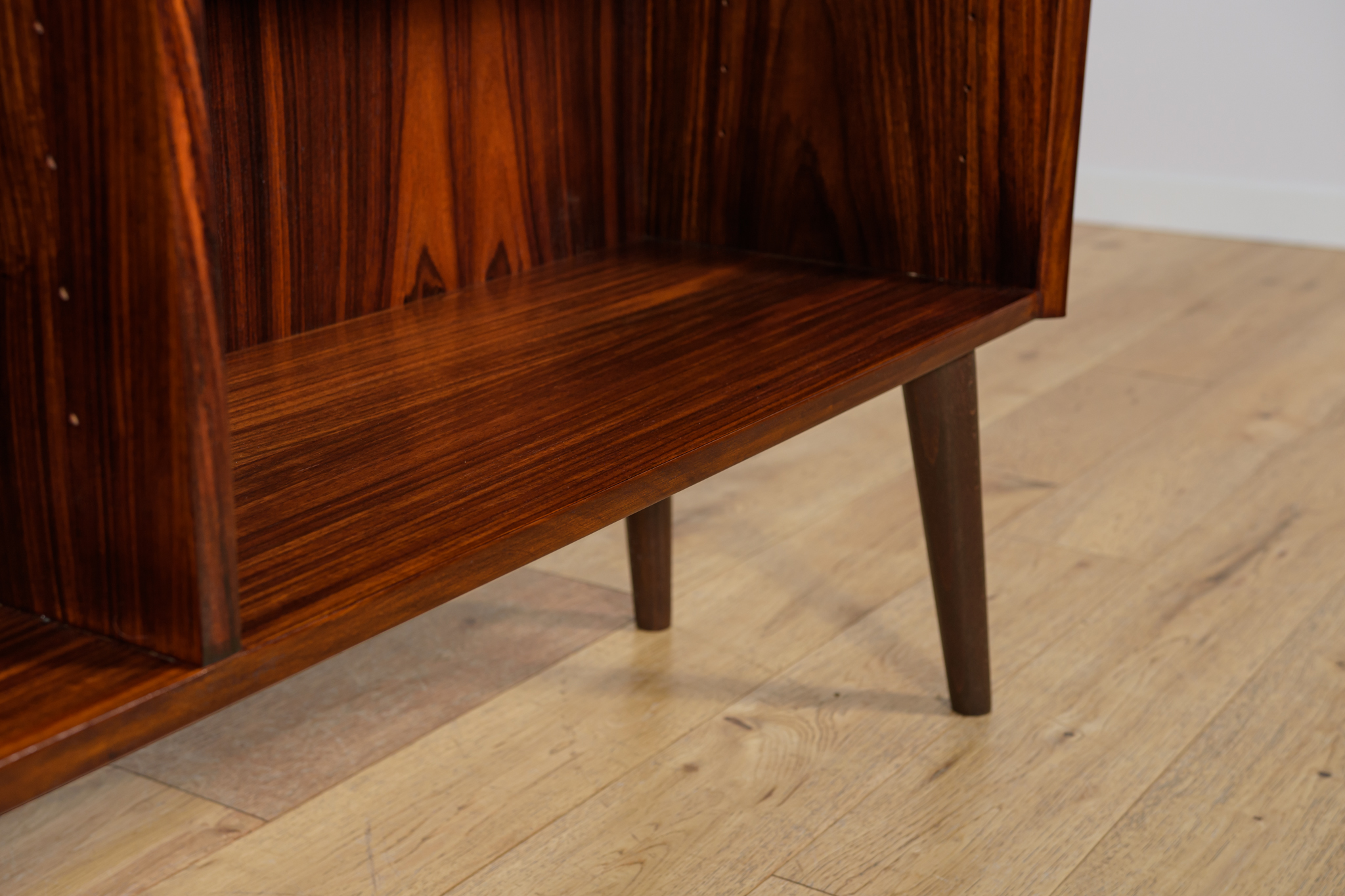 Regał wyprodukowany z drewna palisandrowego w Danii w latach 60-tych. Regał posiada ciekawe usłojenie i wyprofilowane krawędzie. Możliwość regulowania wysokości półek. Mebel po kompleksowej renowacji, oczyszczony ze starej powierzchni, wykończony wysokogatunkowym duńskim olejem.