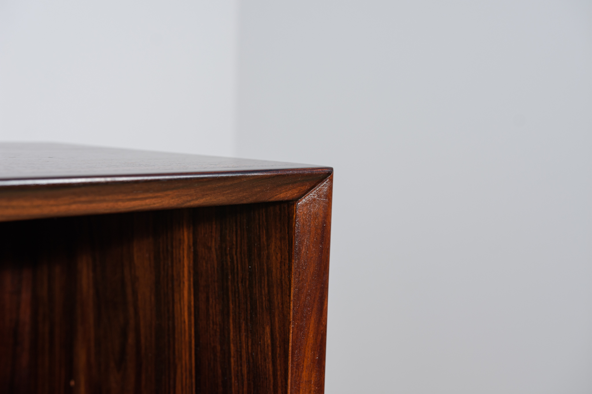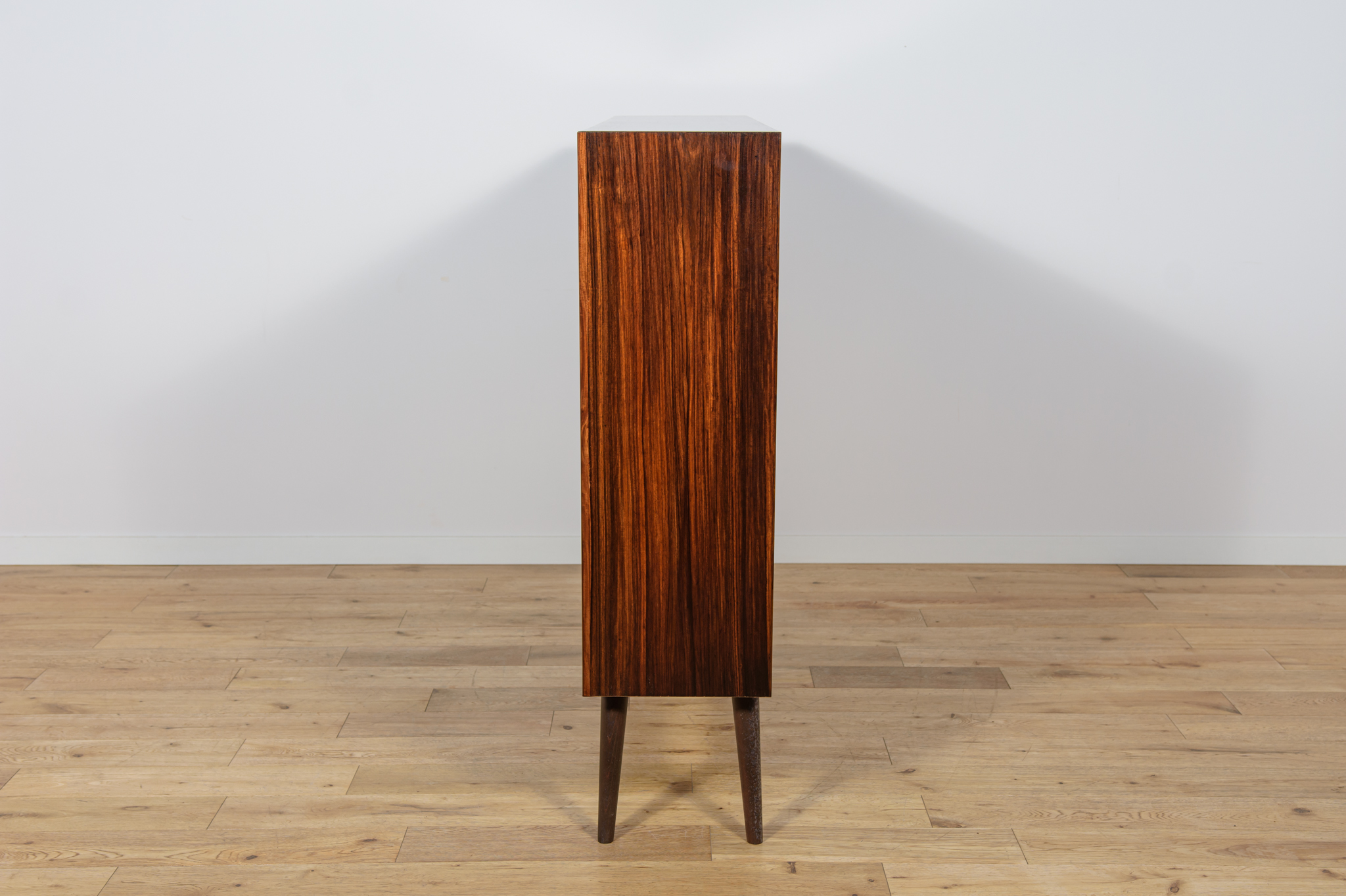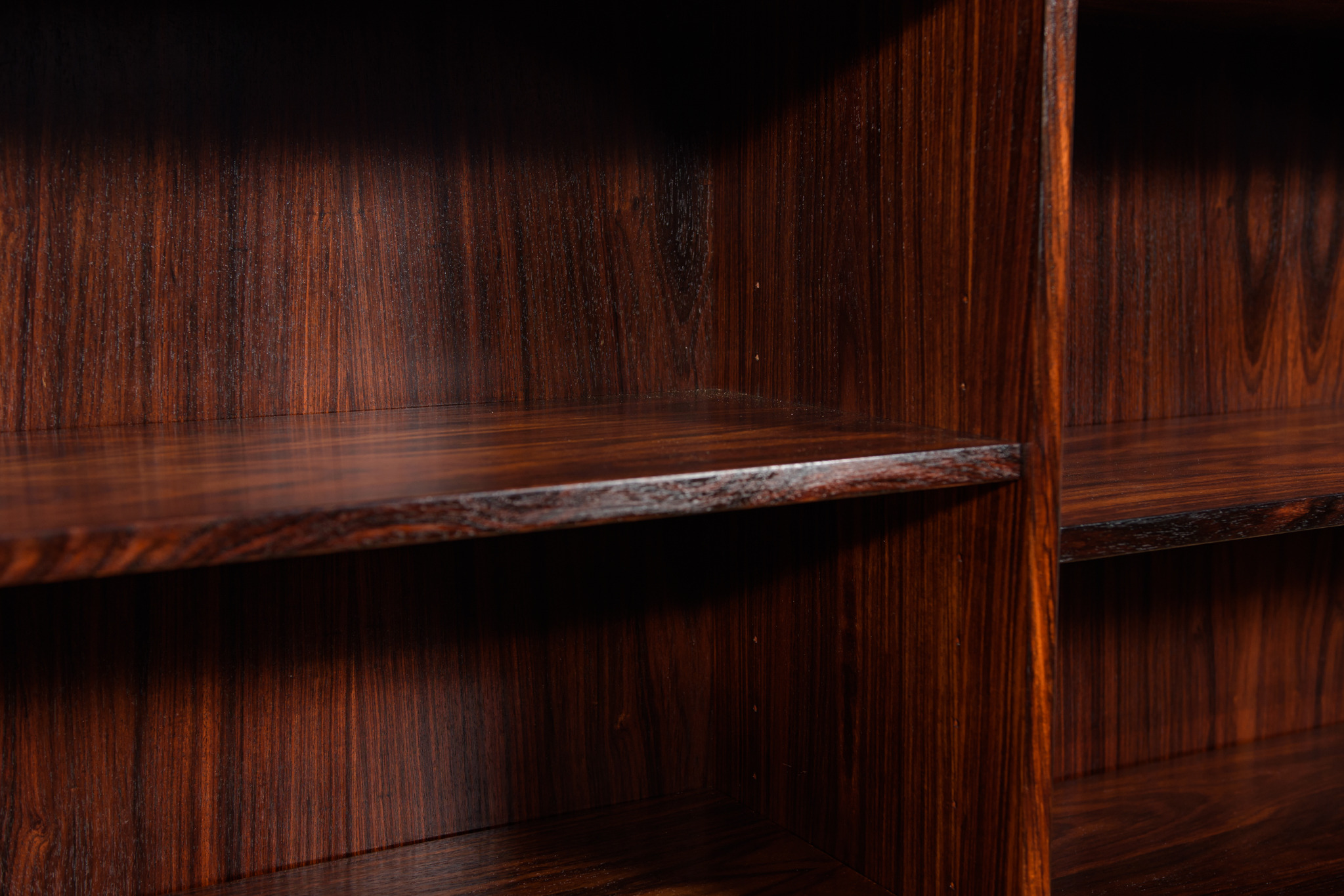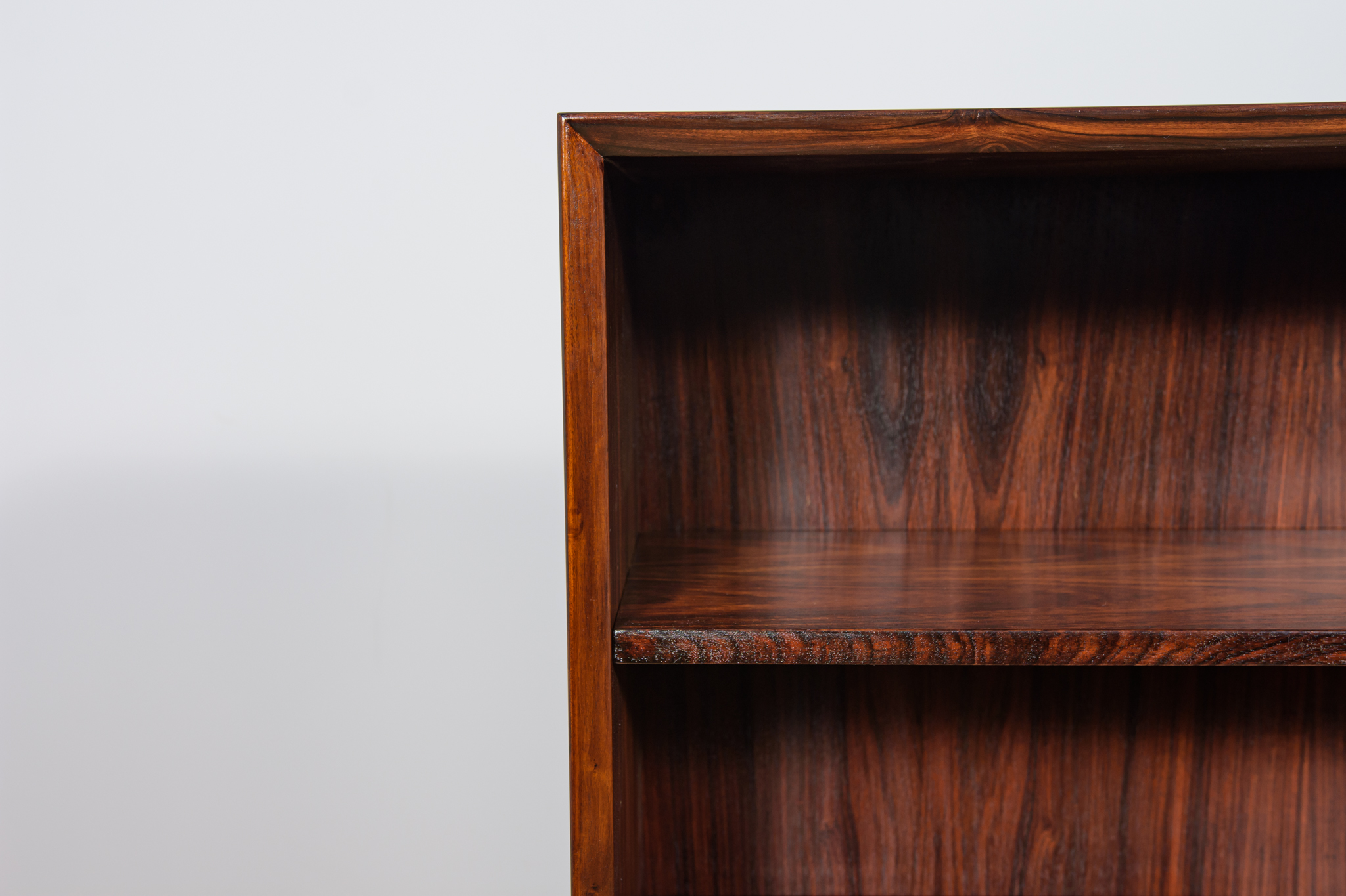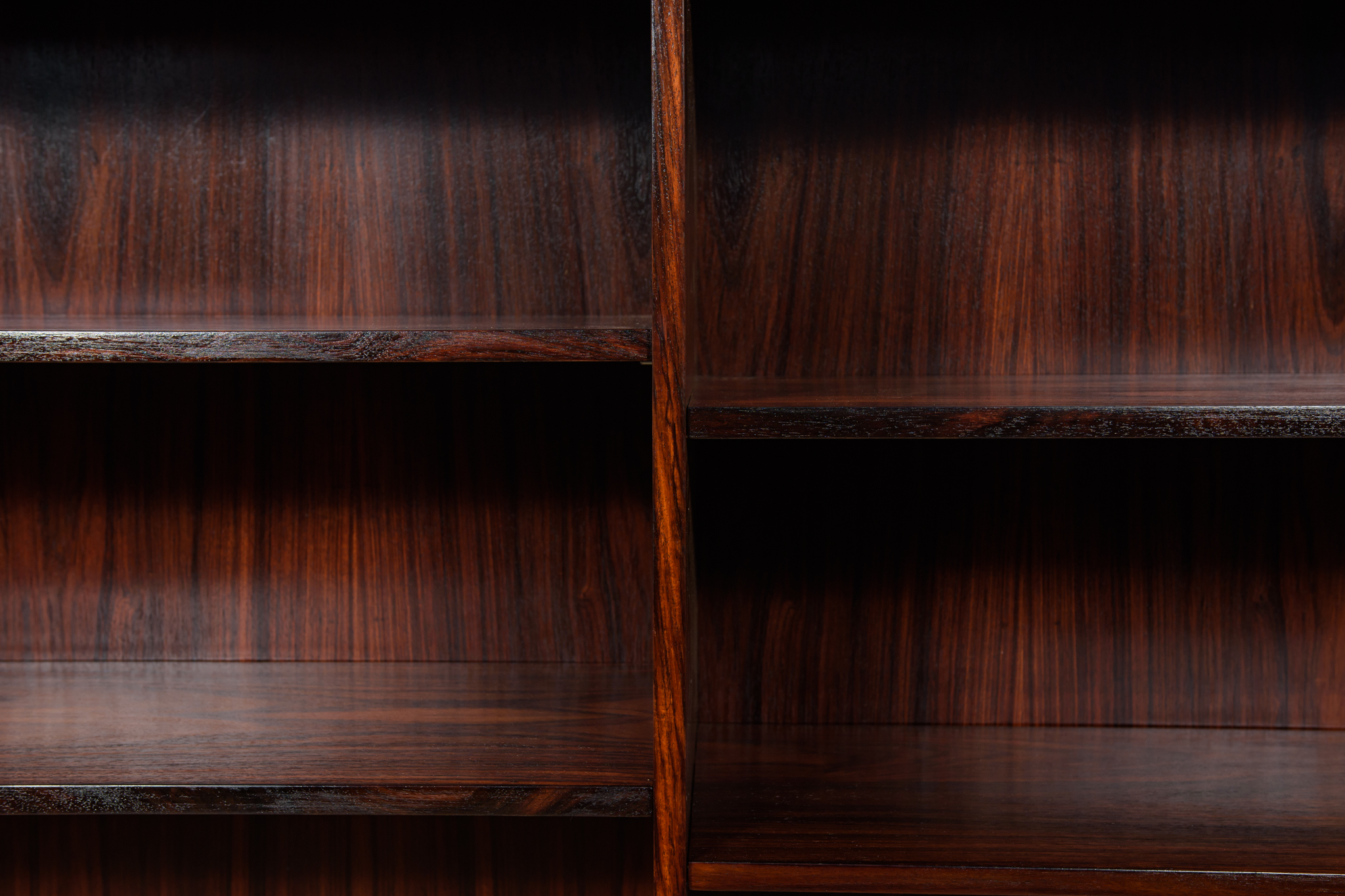 Regał wyprodukowany z drewna palisandrowego w Danii w latach 60-tych. Regał posiada ciekawe usłojenie i wyprofilowane krawędzie. Możliwość regulowania wysokości półek. Mebel po kompleksowej renowacji, oczyszczony ze starej powierzchni, wykończony wysokogatunkowym duńskim olejem.
