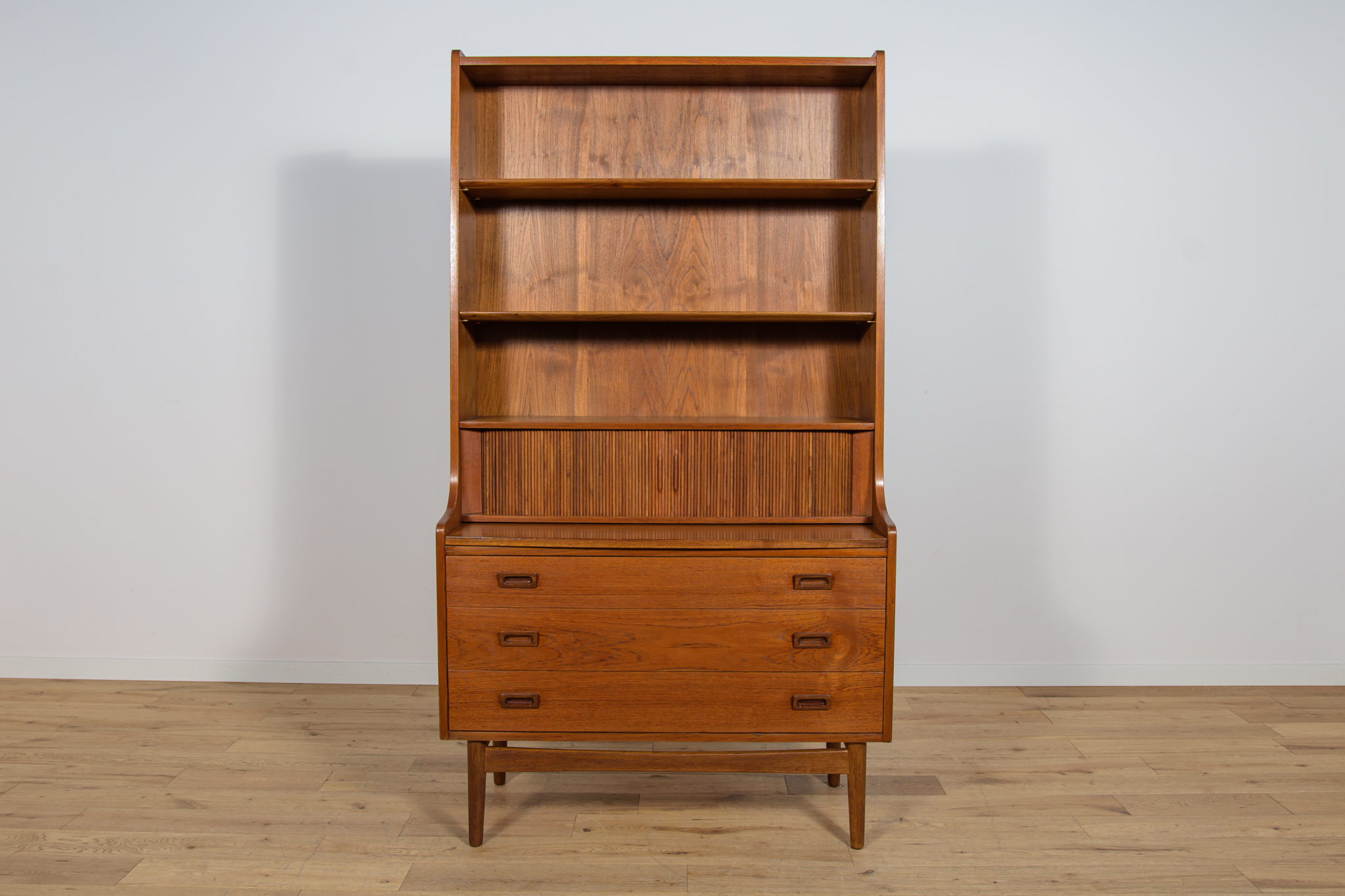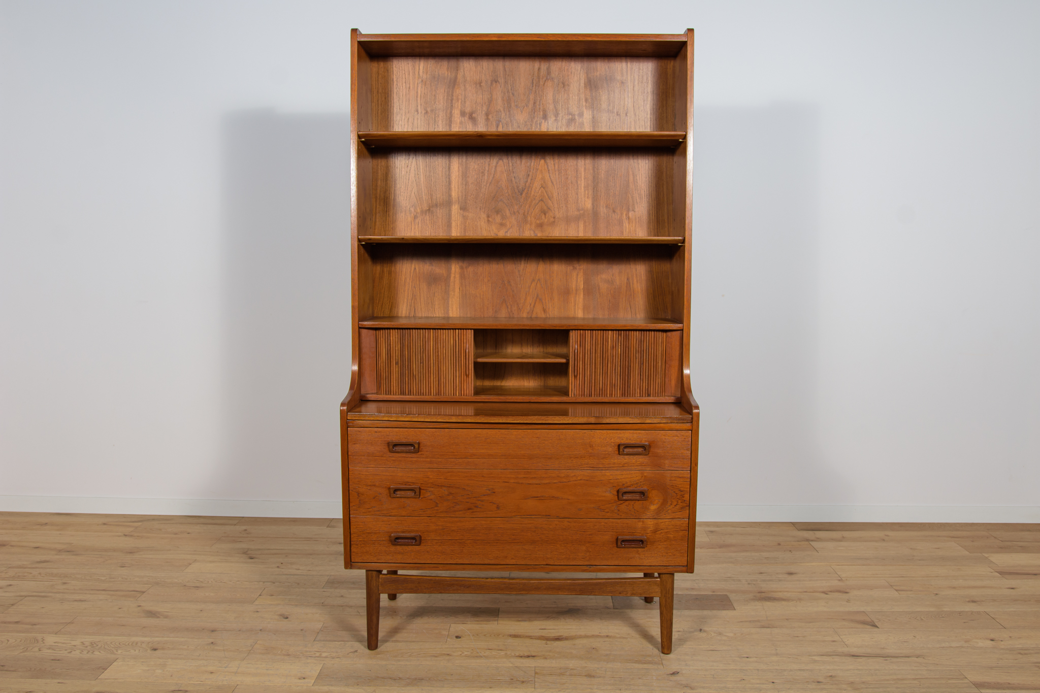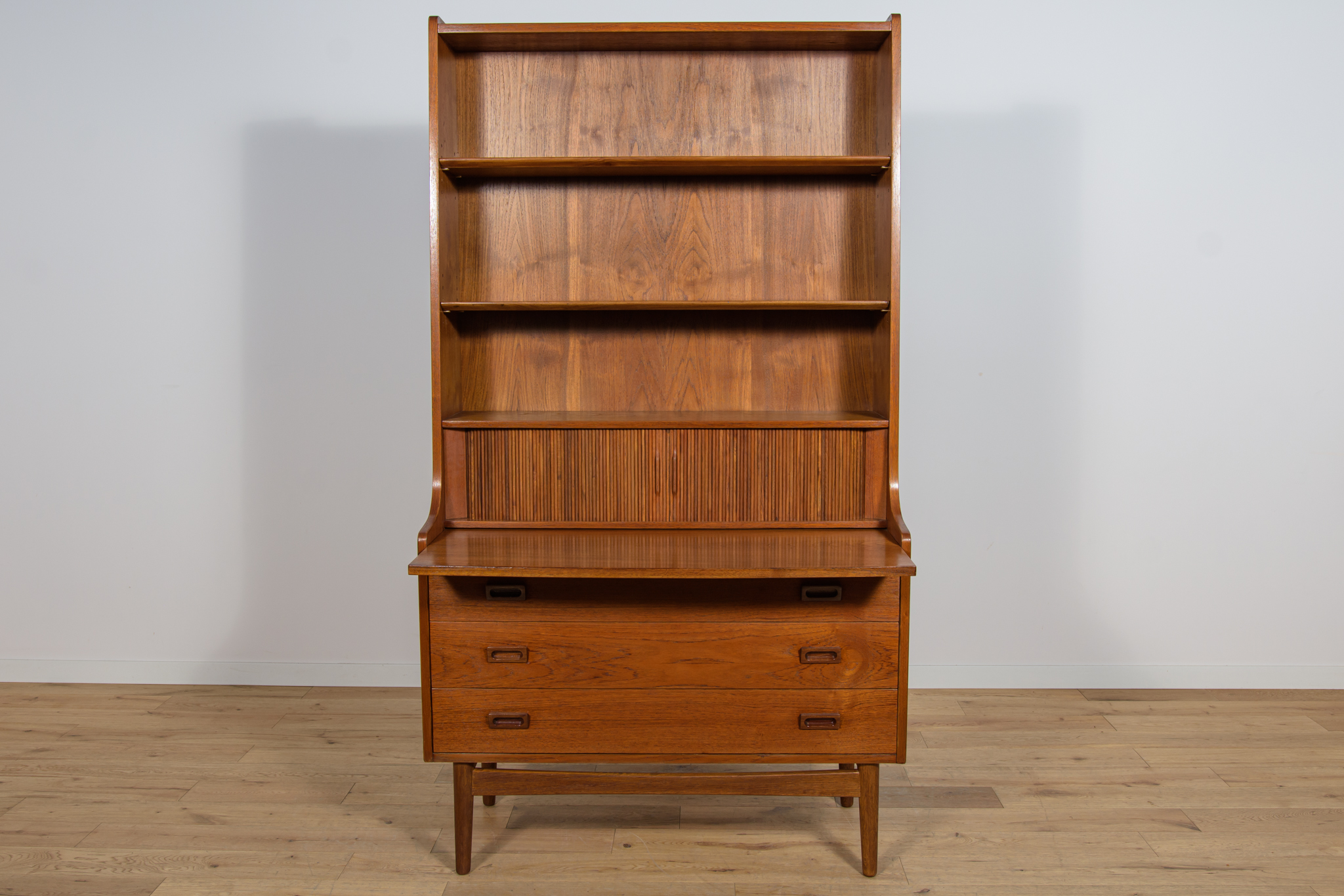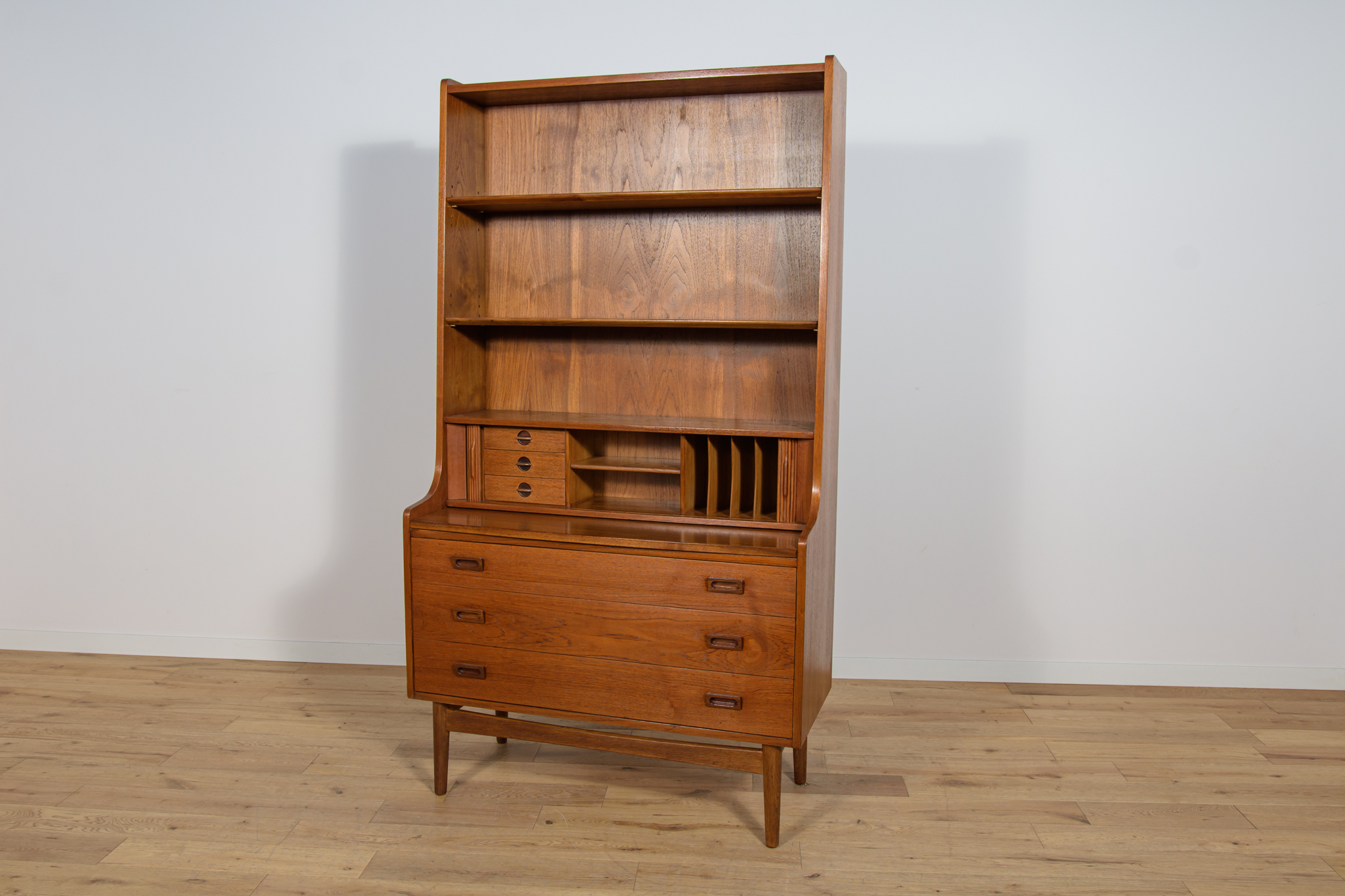 Regał z drewna tekowego zaprojektowany przez Johannesa Sortha dla Bornholm w Danii w latach 60. W górnej części regału umieszczone są cztery półki, z czego trzy półki są otwarte, najniższa półka zamykana roletą, pełni funkcję sekretarzyka z wysuwanym blatem. W dolnym segmencie znajdują trzy szuflady z wyprofilowanymi uchwytami. Regał po kompleksowej renowacji stolarskiej, oczyszczony ze starej powłoki, wykończony wysokogatunkowym olejem duńskim.