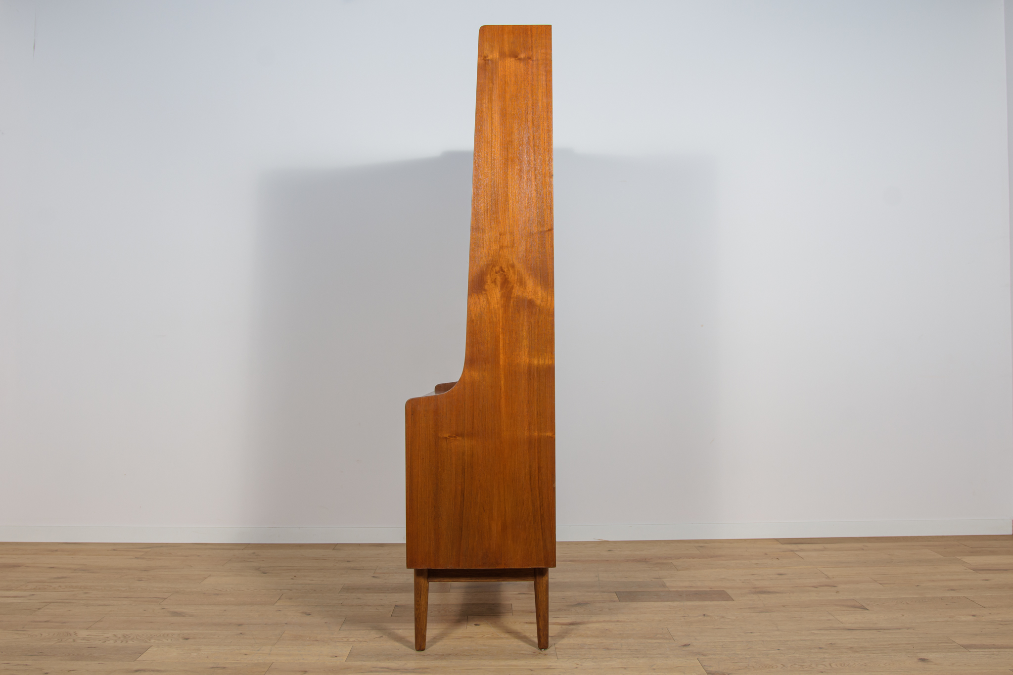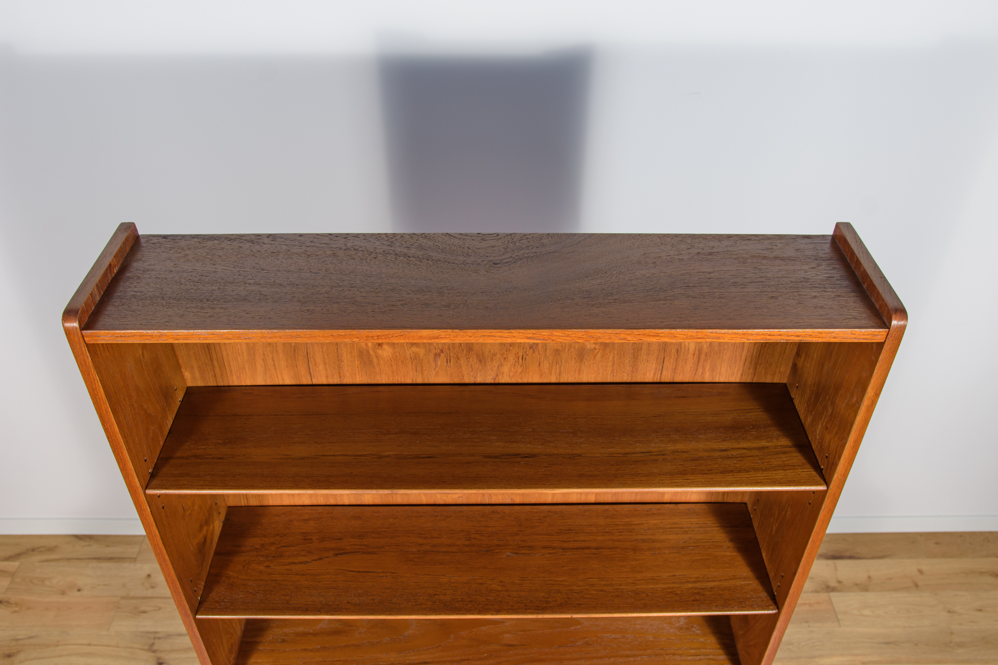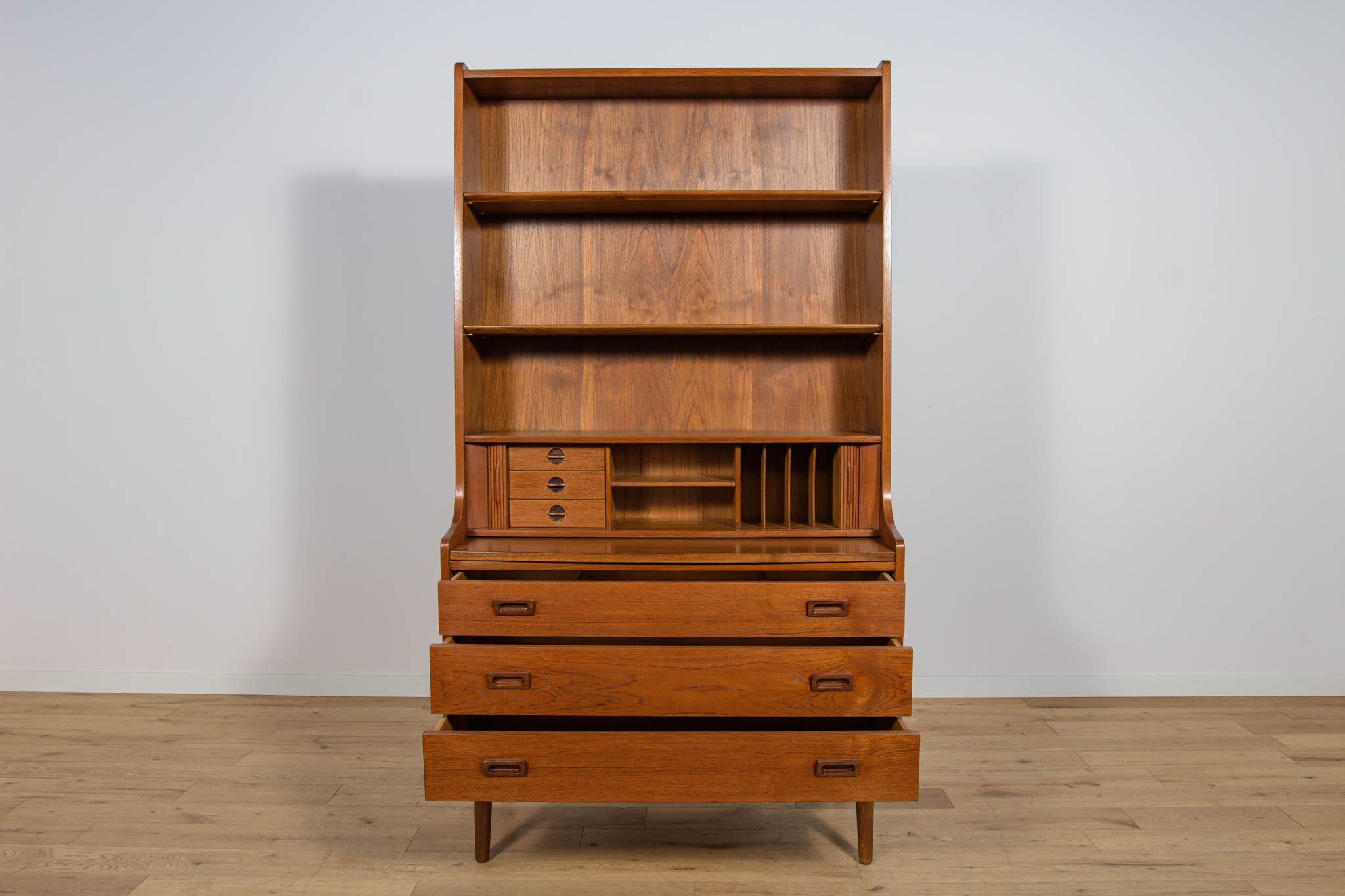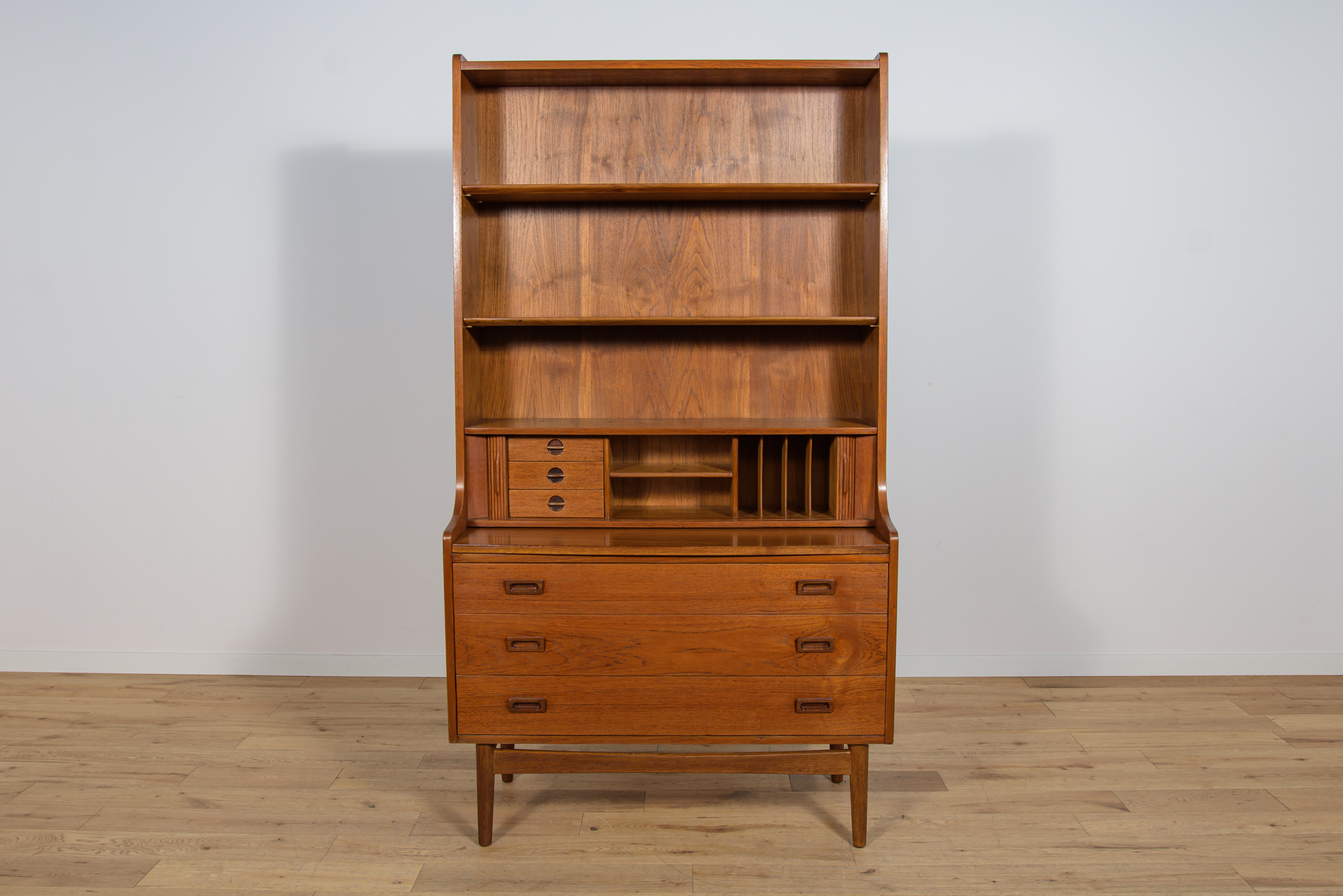 Regał z drewna tekowego zaprojektowany przez Johannesa Sortha dla Bornholm w Danii w latach 60. W górnej części regału umieszczone są cztery półki, z czego trzy półki są otwarte, najniższa półka zamykana roletą, pełni funkcję sekretarzyka z wysuwanym blatem. W dolnym segmencie znajdują trzy szuflady z wyprofilowanymi uchwytami. Regał po kompleksowej renowacji stolarskiej, oczyszczony ze starej powłoki, wykończony wysokogatunkowym olejem duńskim.