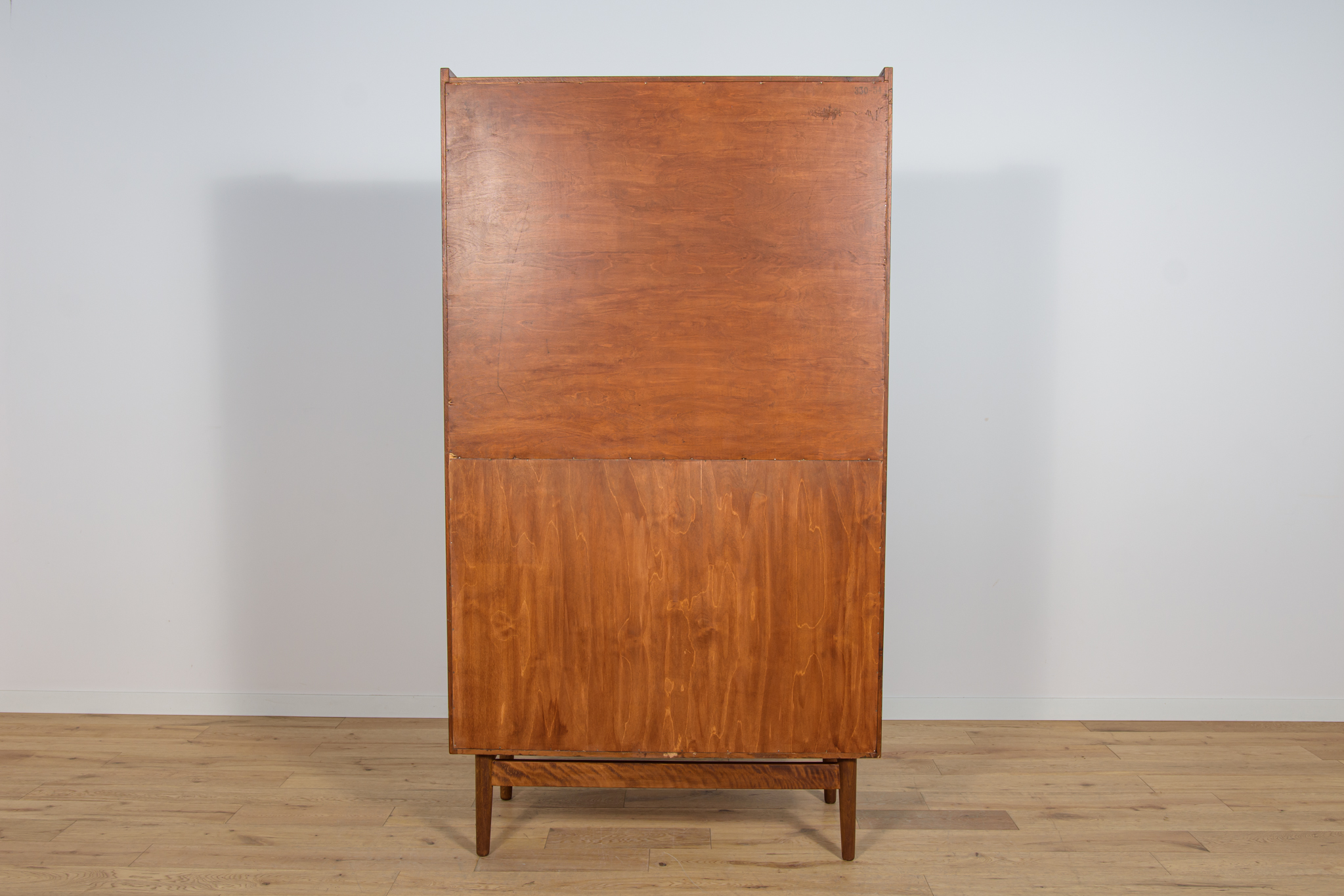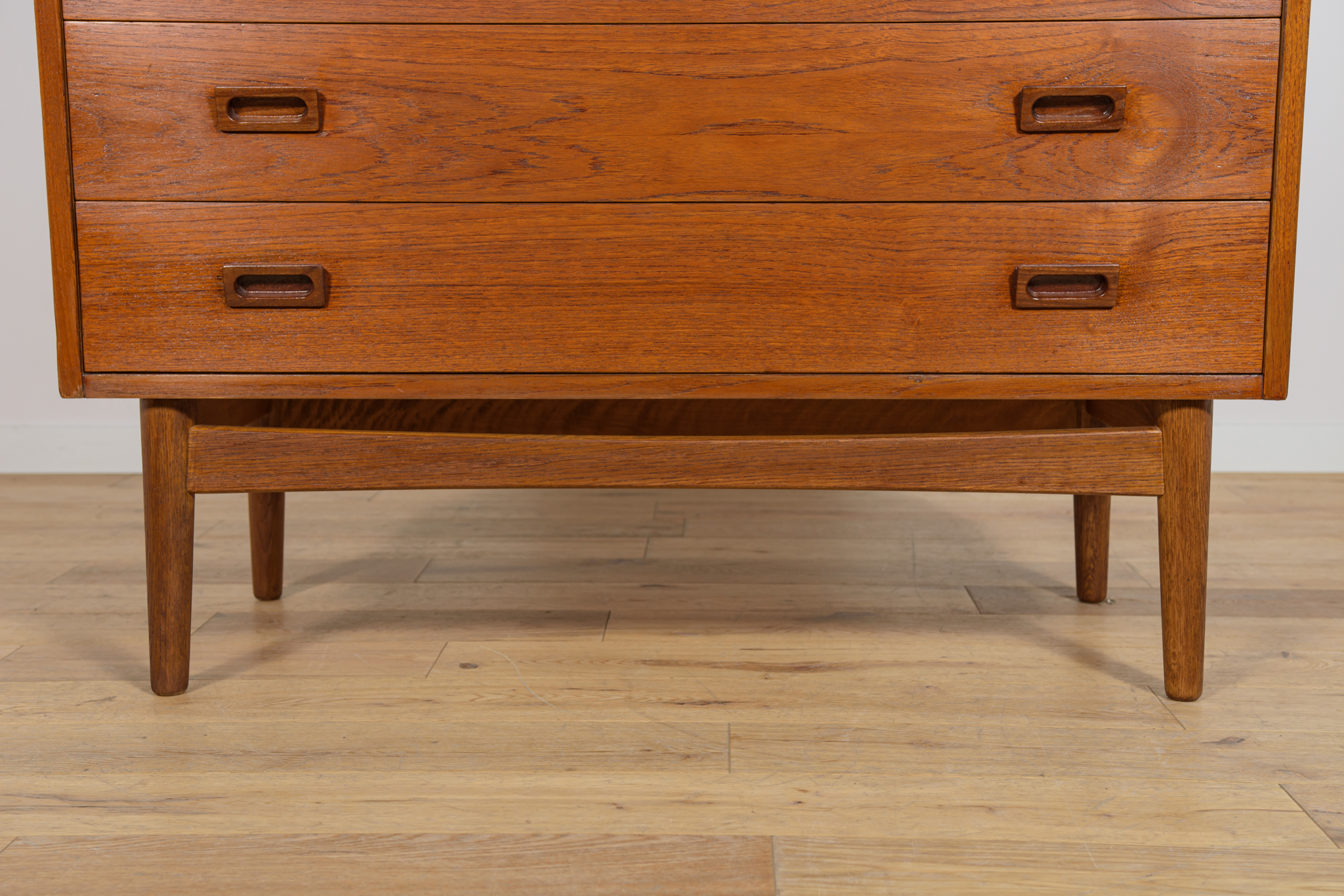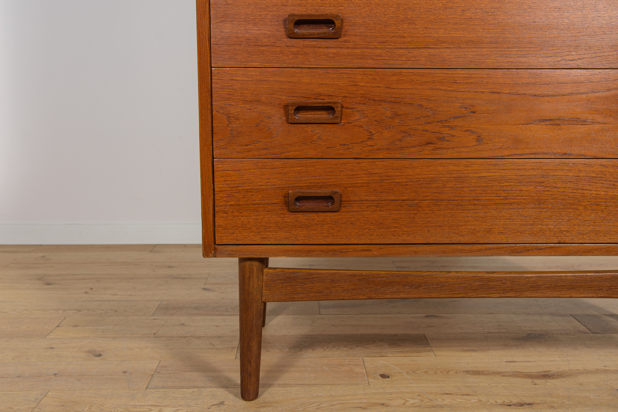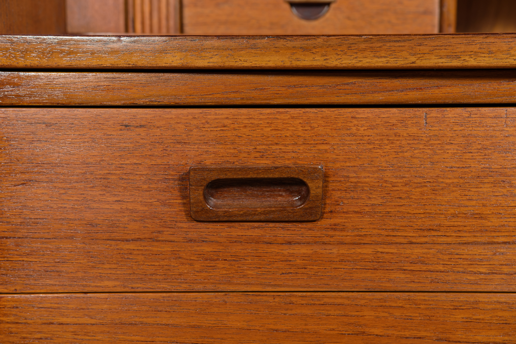 Regał z drewna tekowego zaprojektowany przez Johannesa Sortha dla Bornholm w Danii w latach 60. W górnej części regału umieszczone są cztery półki, z czego trzy półki są otwarte, najniższa półka zamykana roletą, pełni funkcję sekretarzyka z wysuwanym blatem. W dolnym segmencie znajdują trzy szuflady z wyprofilowanymi uchwytami. Regał po kompleksowej renowacji stolarskiej, oczyszczony ze starej powłoki, wykończony wysokogatunkowym olejem duńskim.