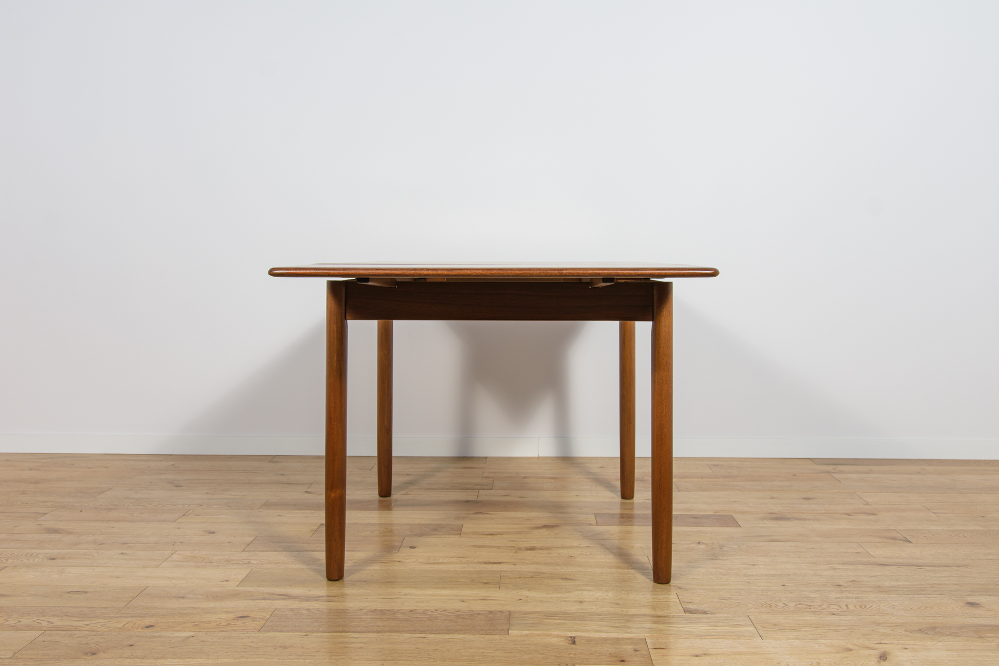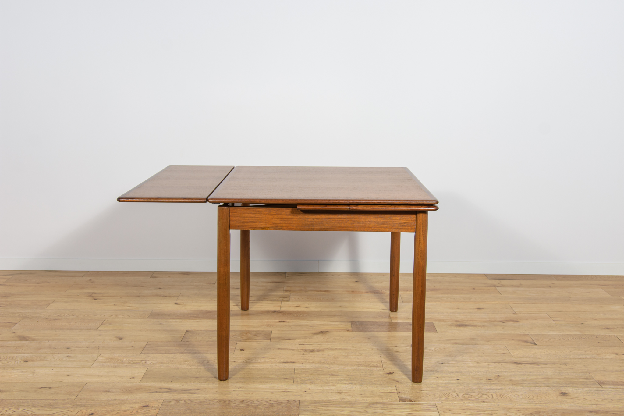 Kwadratowy rozkładany stół z drewna teakowego został wyprodukowany w Danii w latach 60. Stół ma wzmacniane, wyprofilowane krawędzie. Mebel jest po kompleksowej renowacji stolarskiej, oczyszczony ze starej powłoki, barwiony bejcą dębową, wykończone mocnym półmatowym lakierem. Stół rozkłada się z 86 cm do 152 cm.