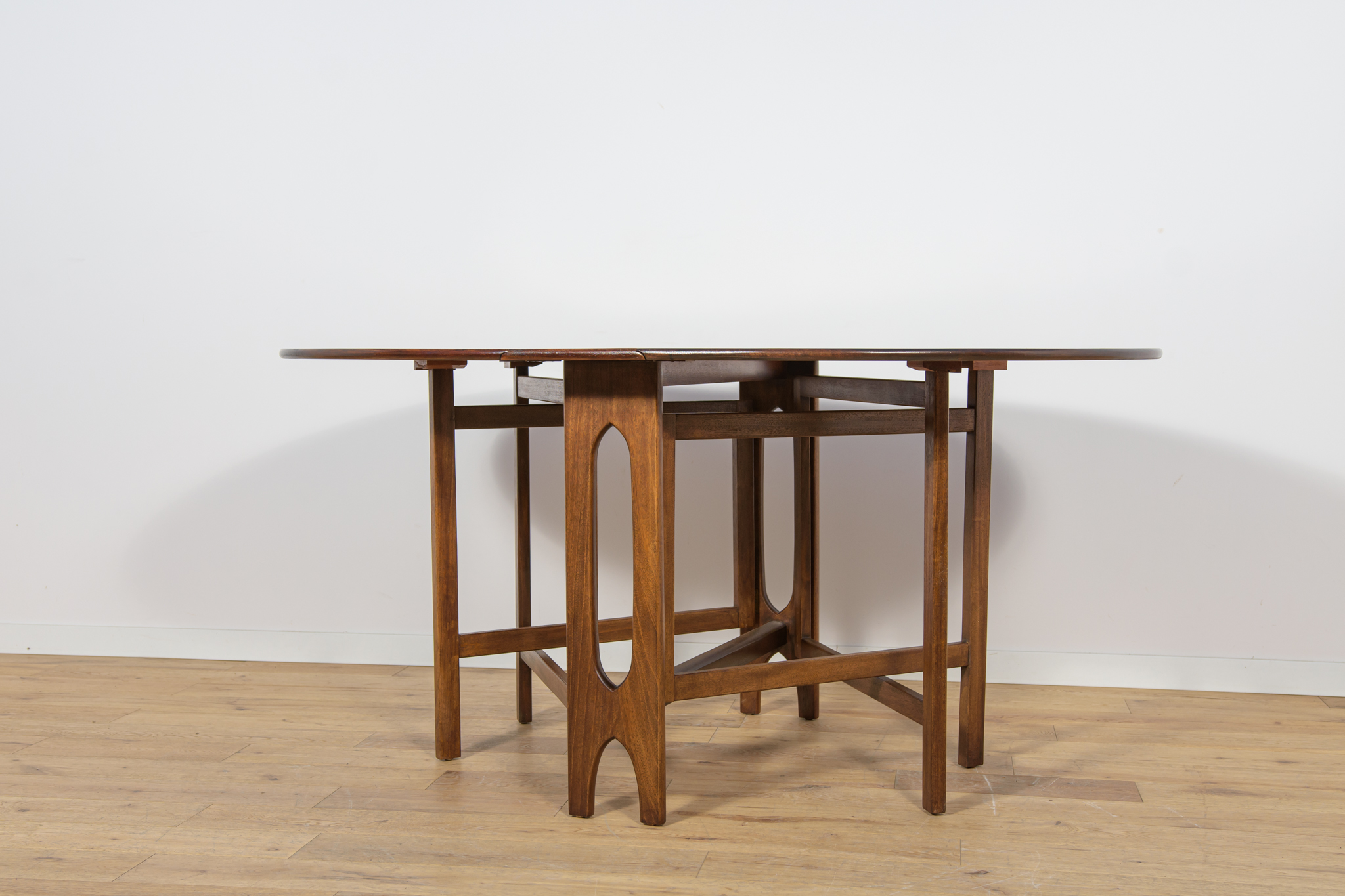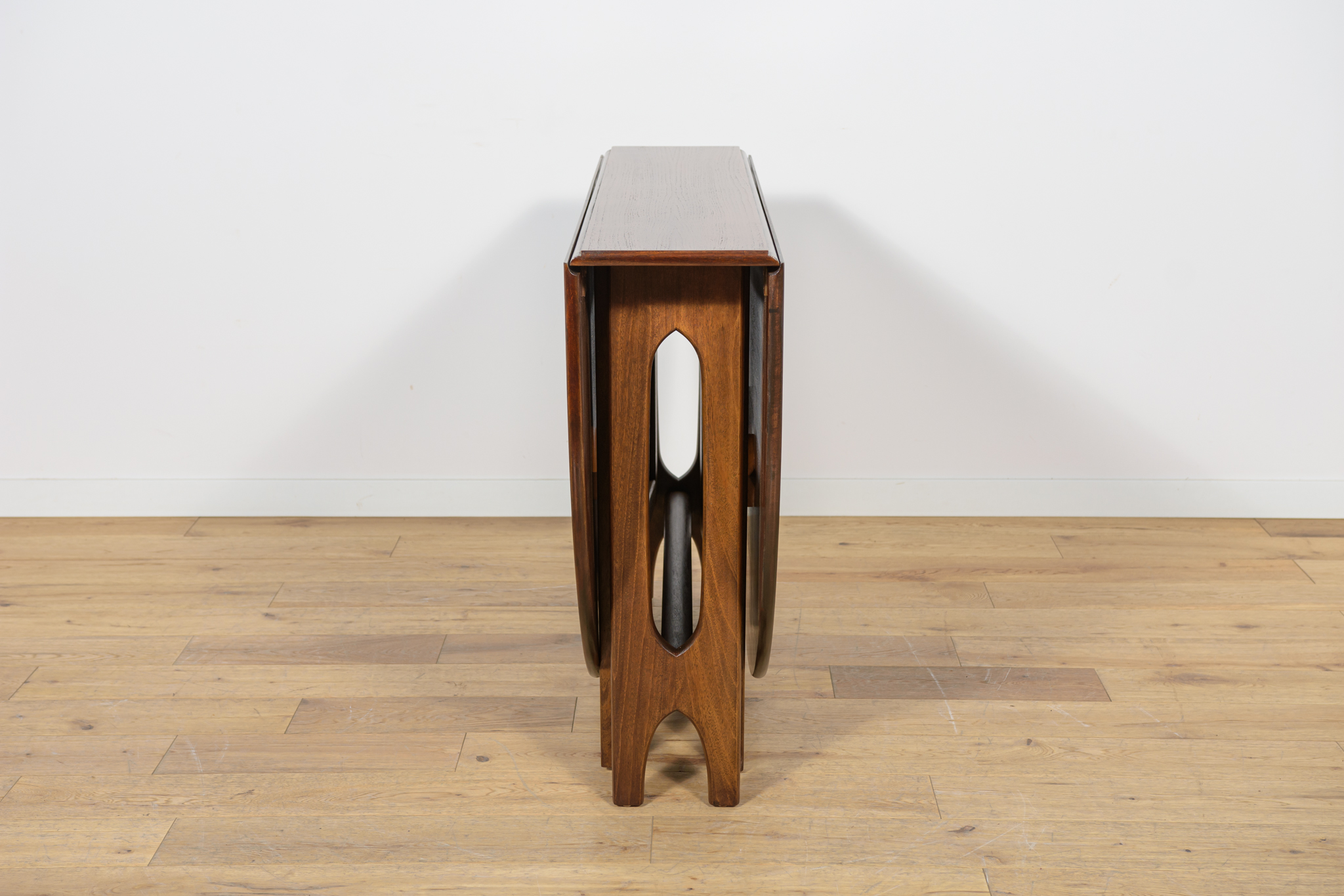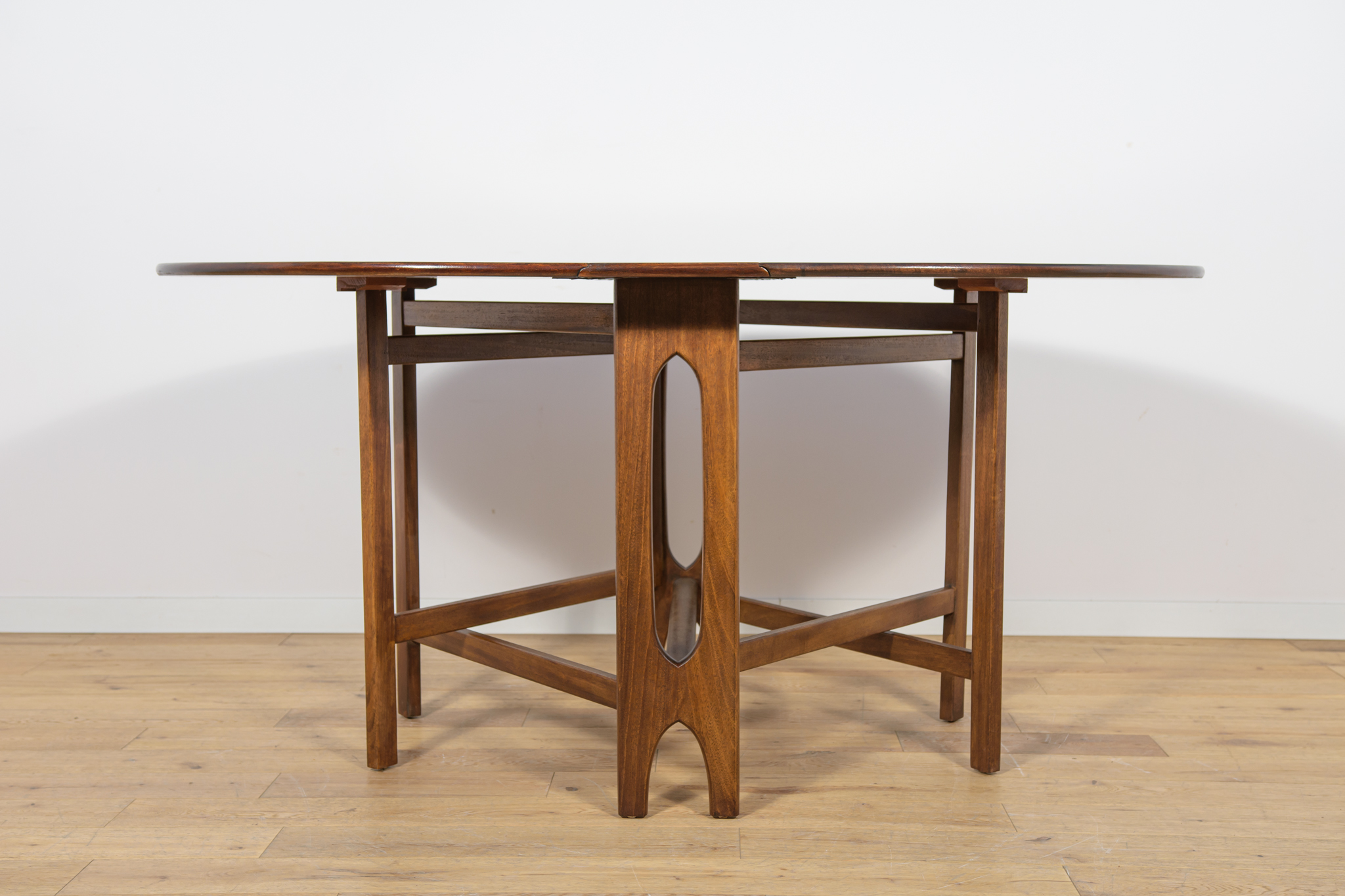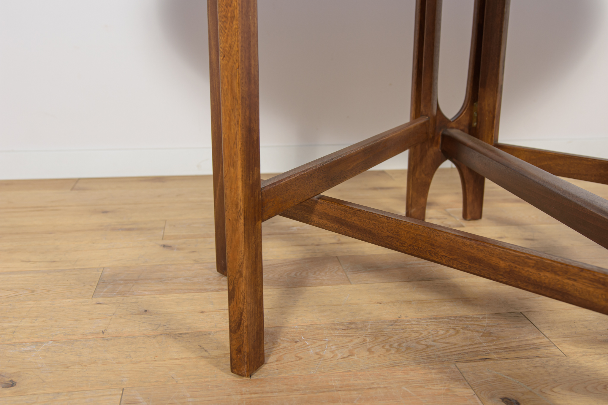 Rozkładany stół z drewna teak został wyprodukowany w latach 60. w brytyjskiej manufakturze Jentique. Stół o eleganckiej formie z wyprofilowanymi krawędziami. Mebel tekowy po profesjonalnej renowacji stolarskiej. Został oczyszczony ze starej powierzchni, barwiony bejcą palisandrową, wykończony mocnym półmatowym lakierem. Stół przed rozłożeniem zajmuje mało miejsca 26 cm ,po rozłożeniu dwóch dostawek jego długość zwiększa się aż do 154 cm