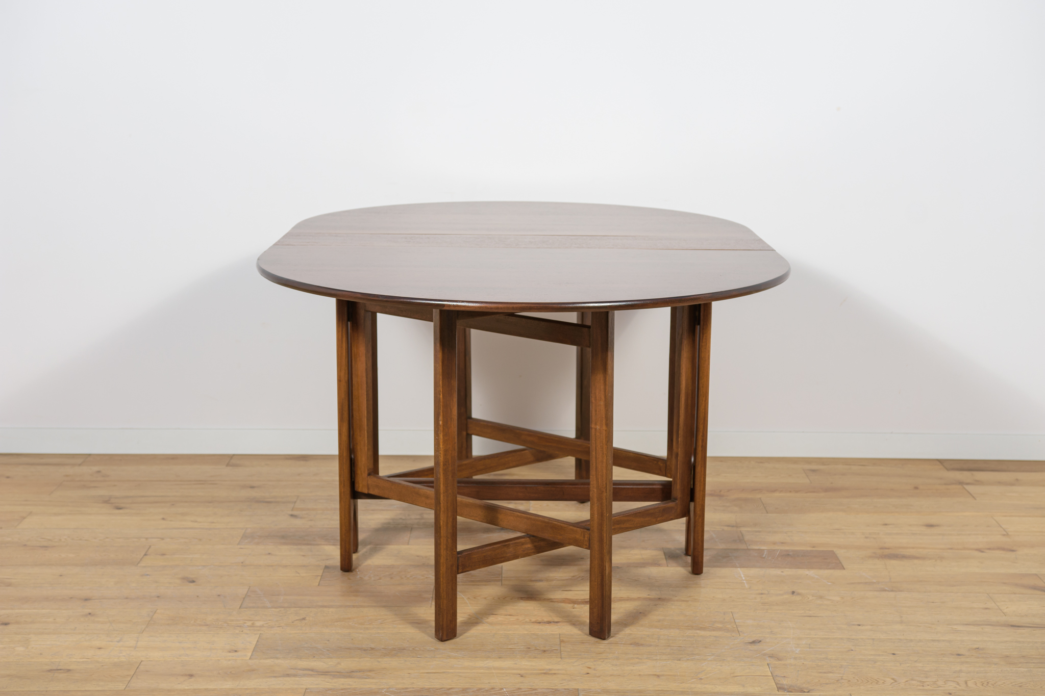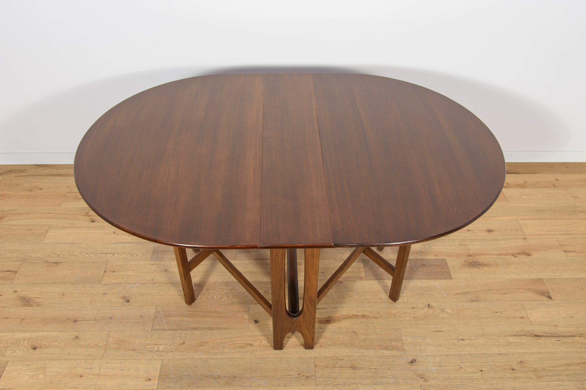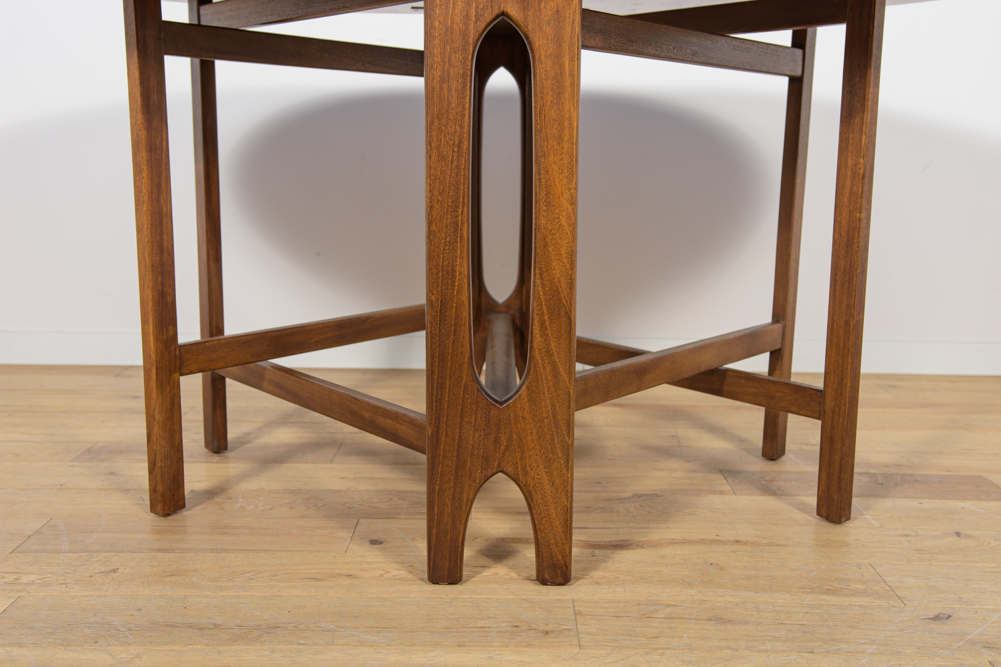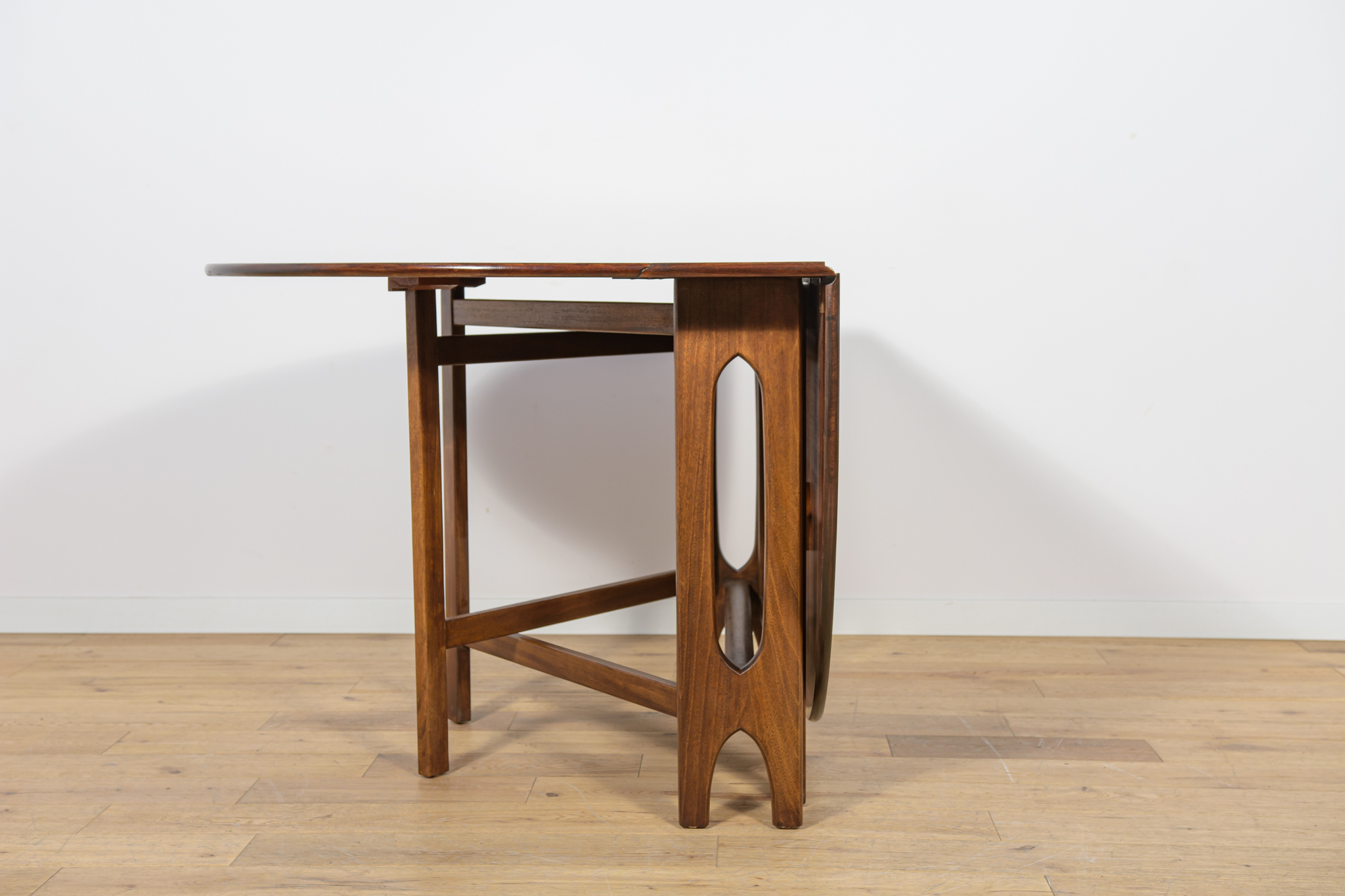 Rozkładany stół z drewna teak został wyprodukowany w latach 60. w brytyjskiej manufakturze Jentique. Stół o eleganckiej formie z wyprofilowanymi krawędziami. Mebel tekowy po profesjonalnej renowacji stolarskiej. Został oczyszczony ze starej powierzchni, barwiony bejcą palisandrową, wykończony mocnym półmatowym lakierem. Stół przed rozłożeniem zajmuje mało miejsca 26 cm ,po rozłożeniu dwóch dostawek jego długość zwiększa się aż do 154 cm
