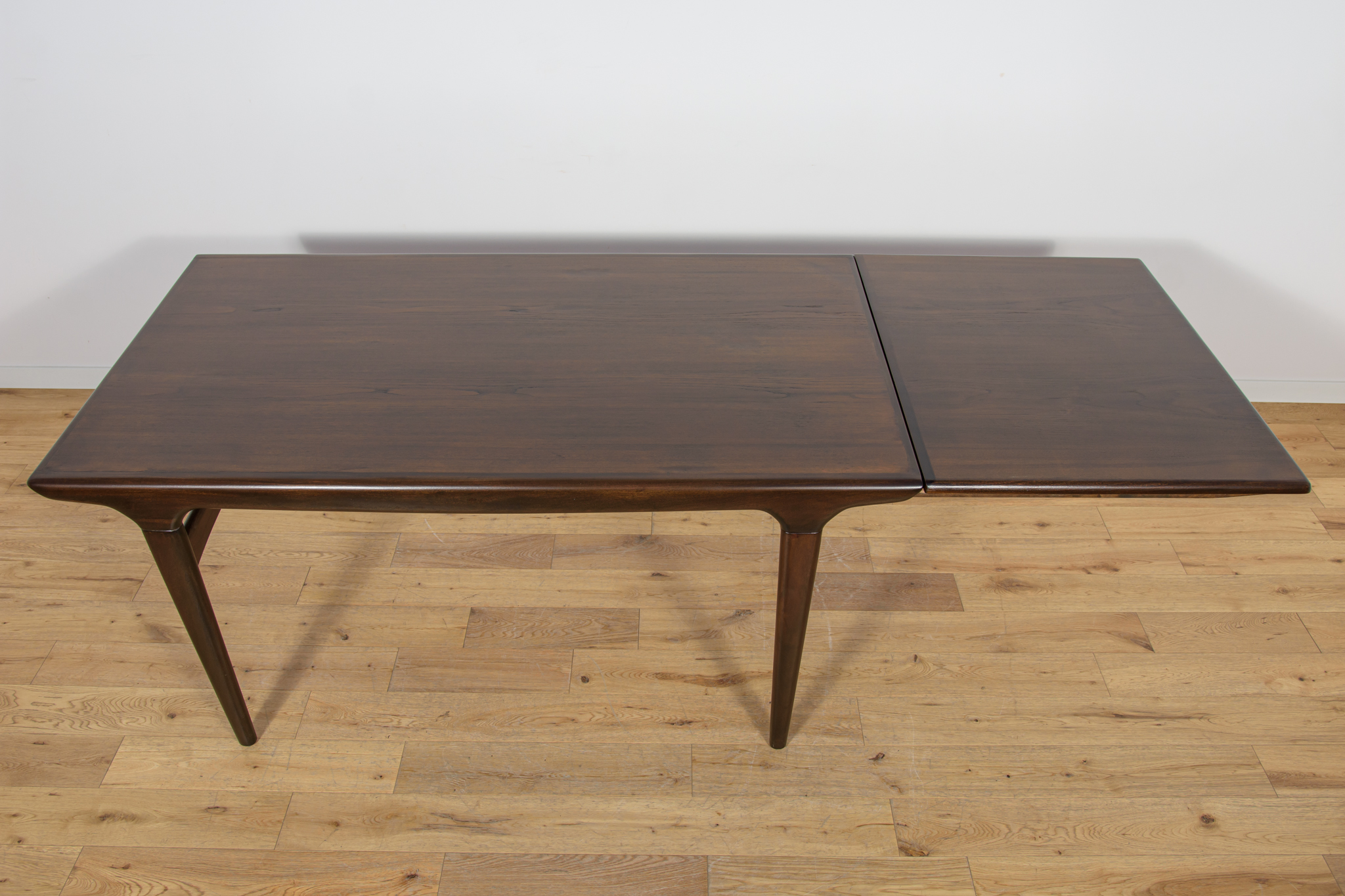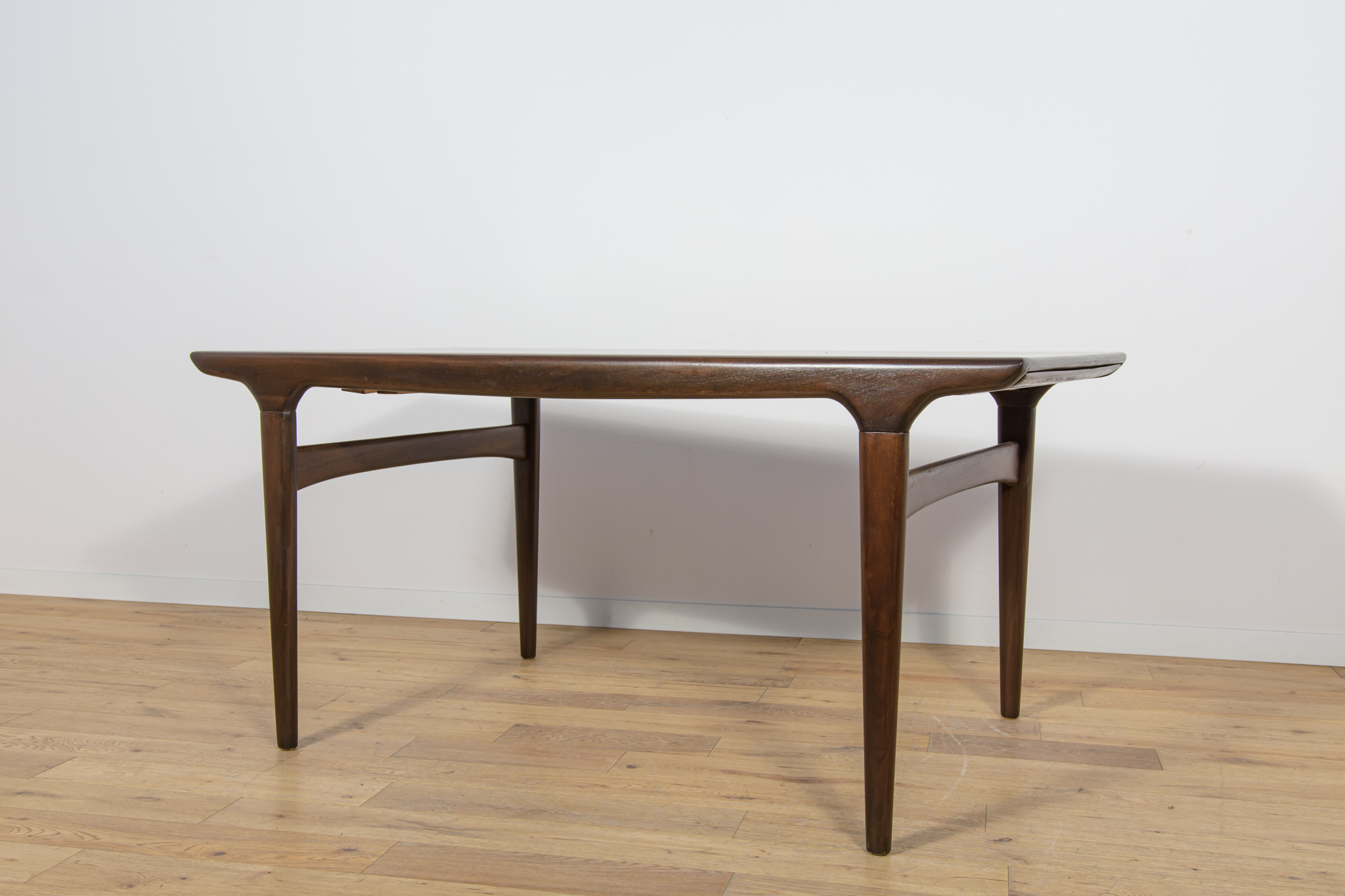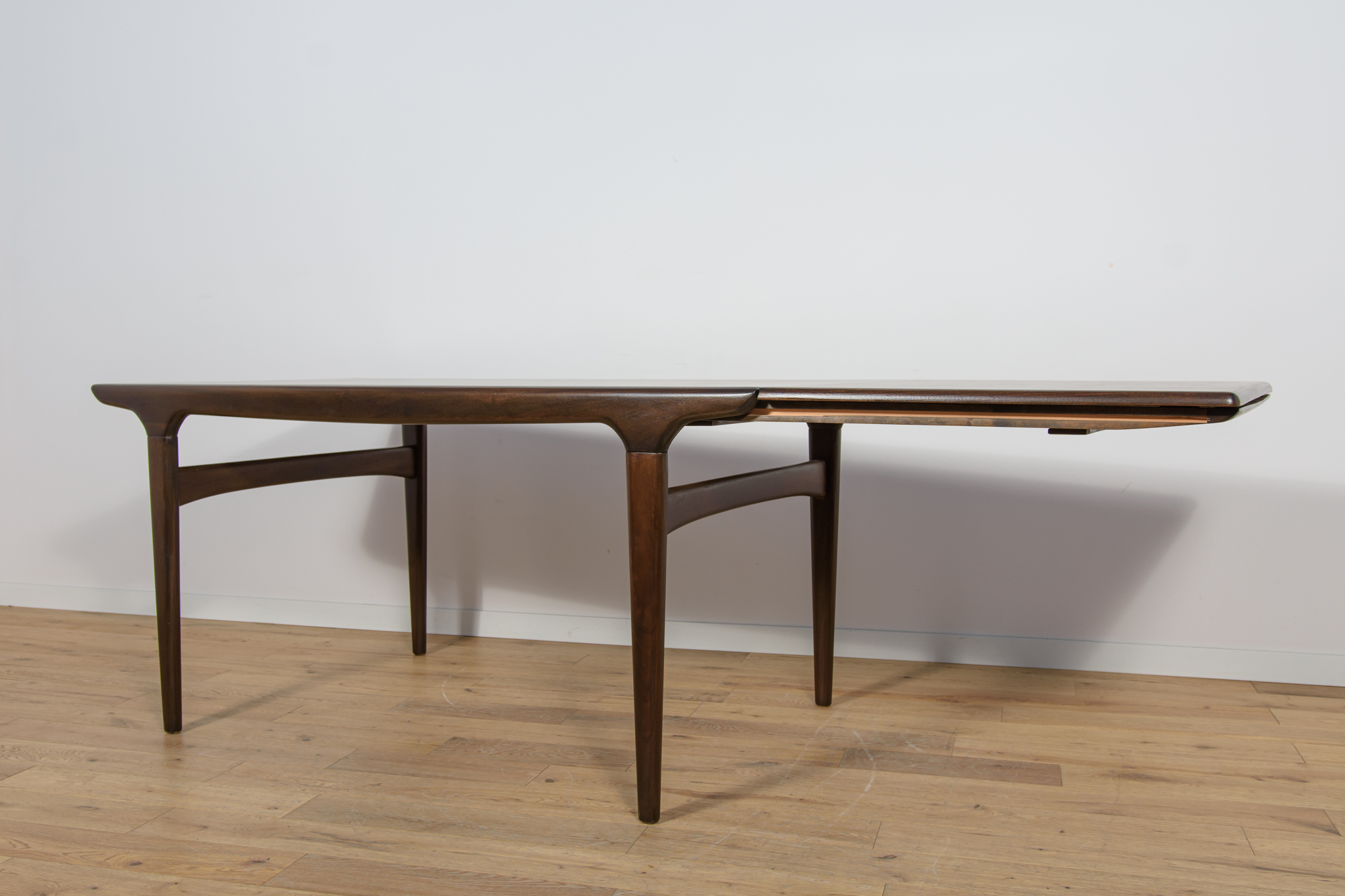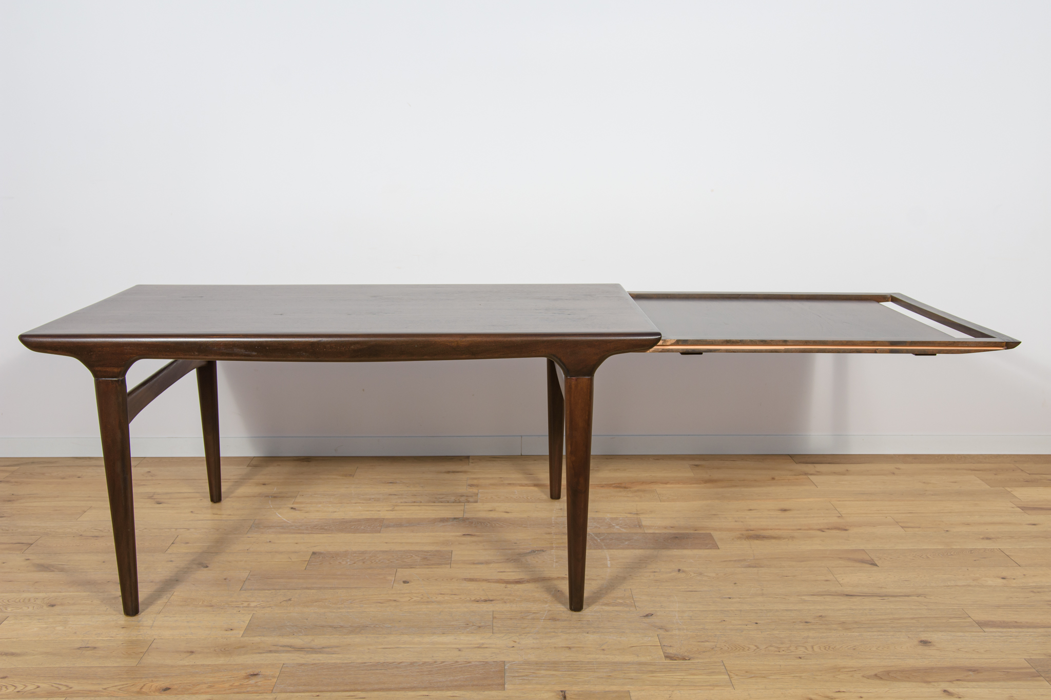 Rozkładany stół z drewna teakowego zaprojektowany w latach 60. przez Johannesa Andersena dla duńskiej manufaktury Uldum Mobelfabrik. Stół o lekkiej wysublimowanej formie, posiada rozszerzenia pozwalający rozszerzyć stół z 153 cm do 221 cm. Stół po kompleksowej renowacji stolarskiej oczyszczony ze starej powierzchni, barwiony bejcą palisandrową, wykończone mocnym półmatowym lakierem.