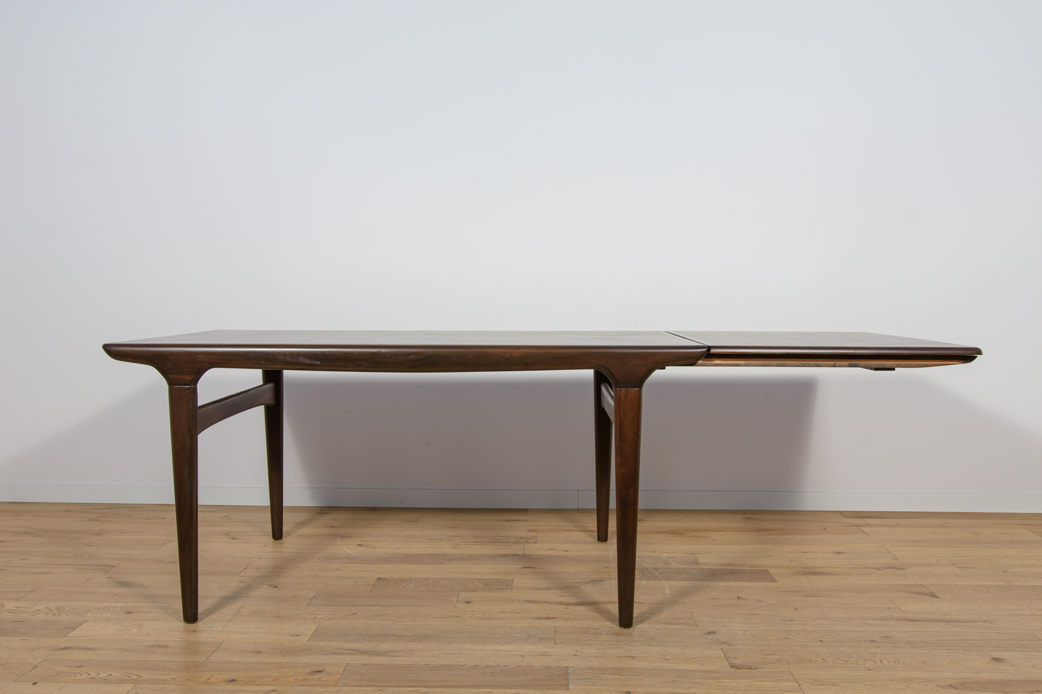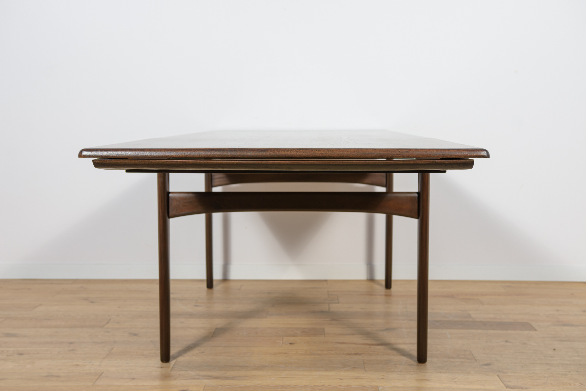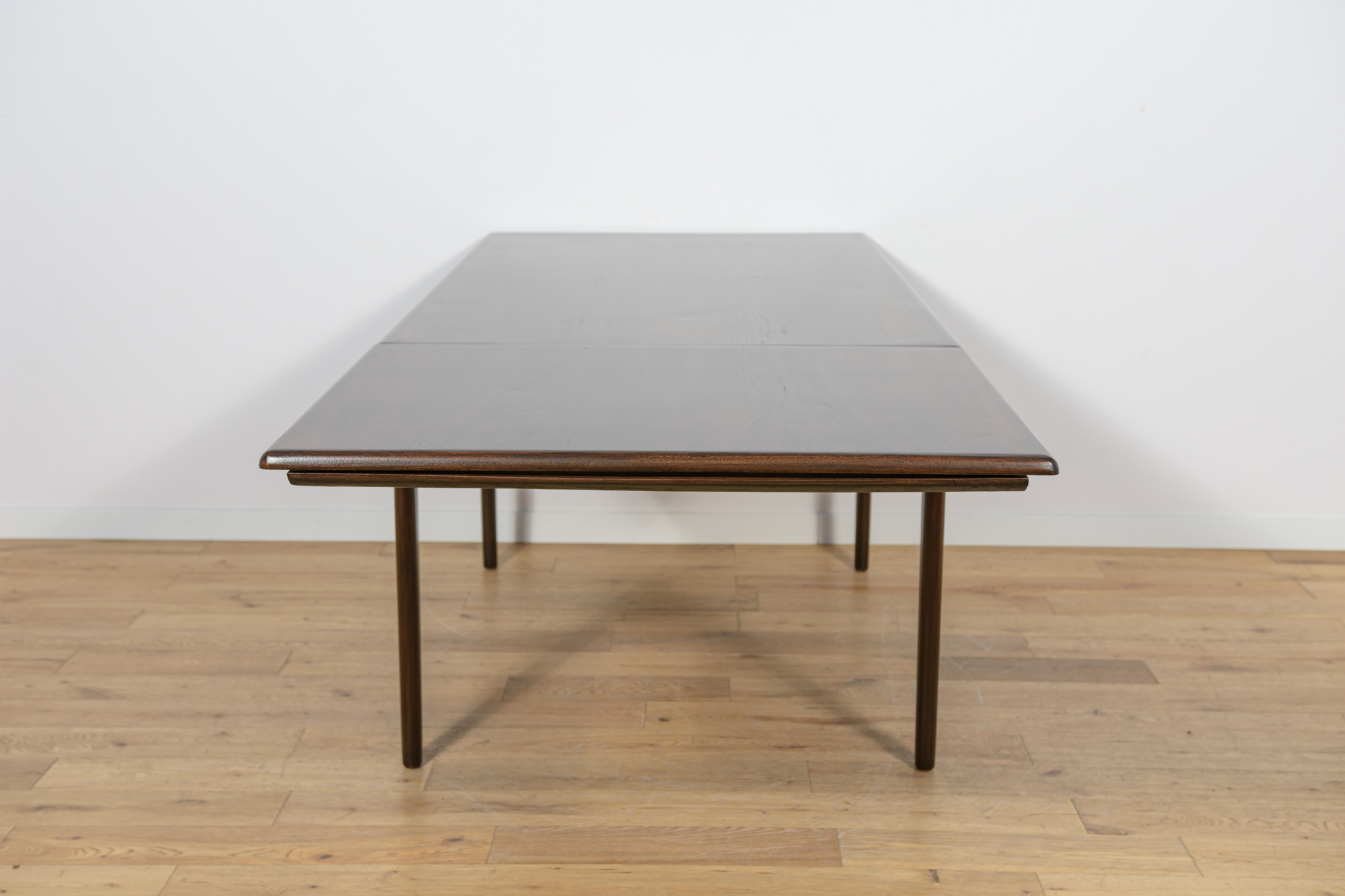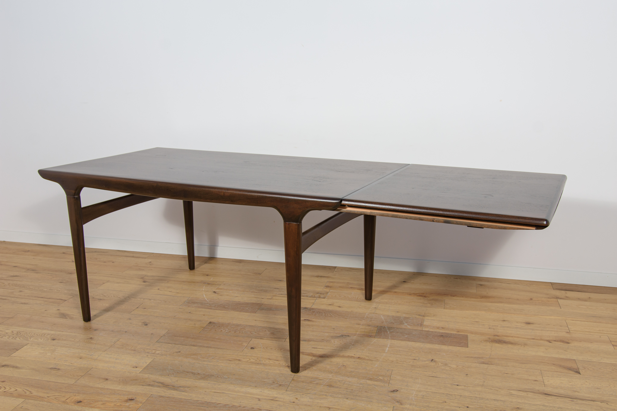 Rozkładany stół z drewna teakowego zaprojektowany w latach 60. przez Johannesa Andersena dla duńskiej manufaktury Uldum Mobelfabrik. Stół o lekkiej wysublimowanej formie, posiada rozszerzenia pozwalający rozszerzyć stół z 153 cm do 221 cm. Stół po kompleksowej renowacji stolarskiej oczyszczony ze starej powierzchni, barwiony bejcą palisandrową, wykończone mocnym półmatowym lakierem.