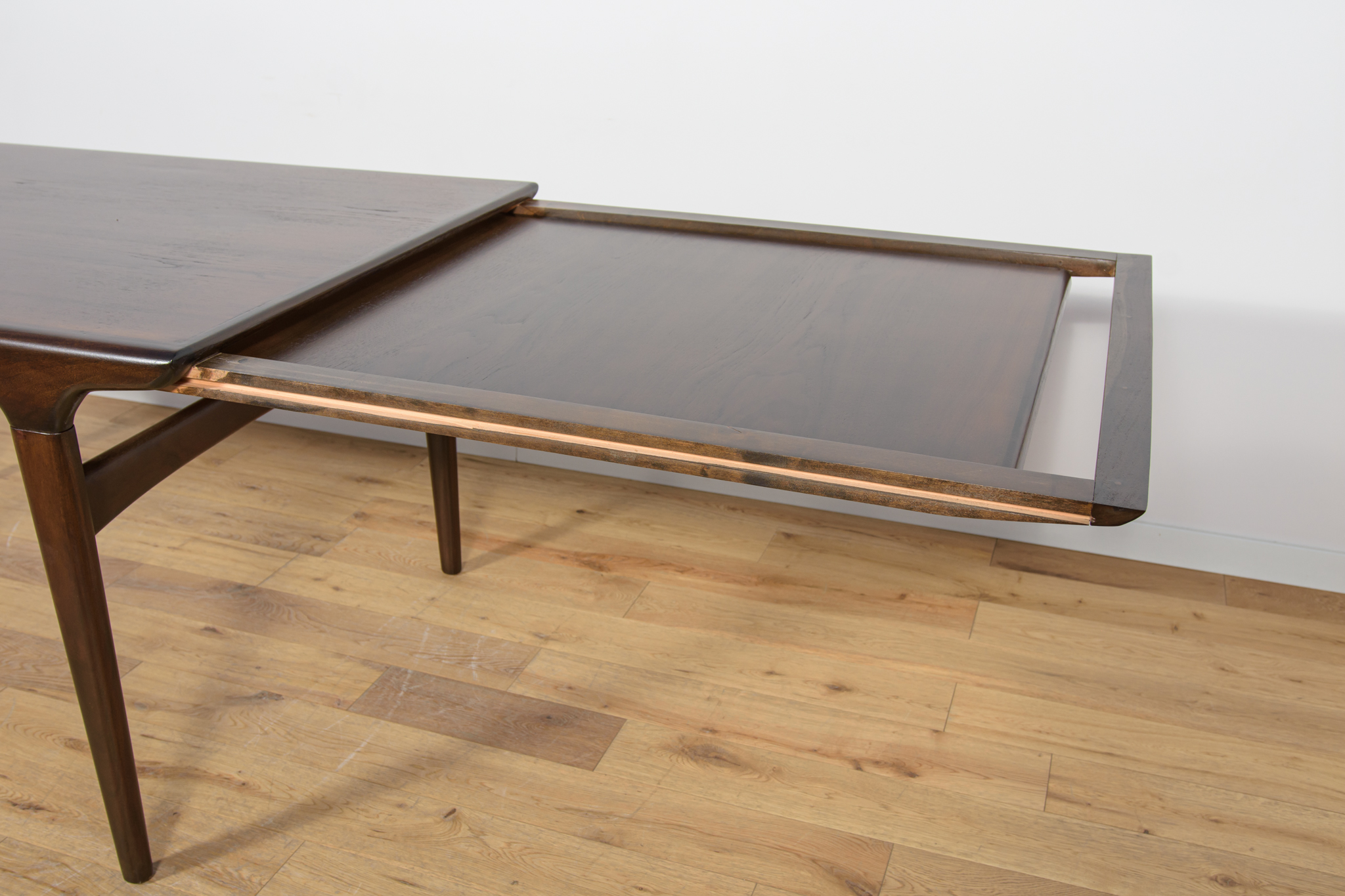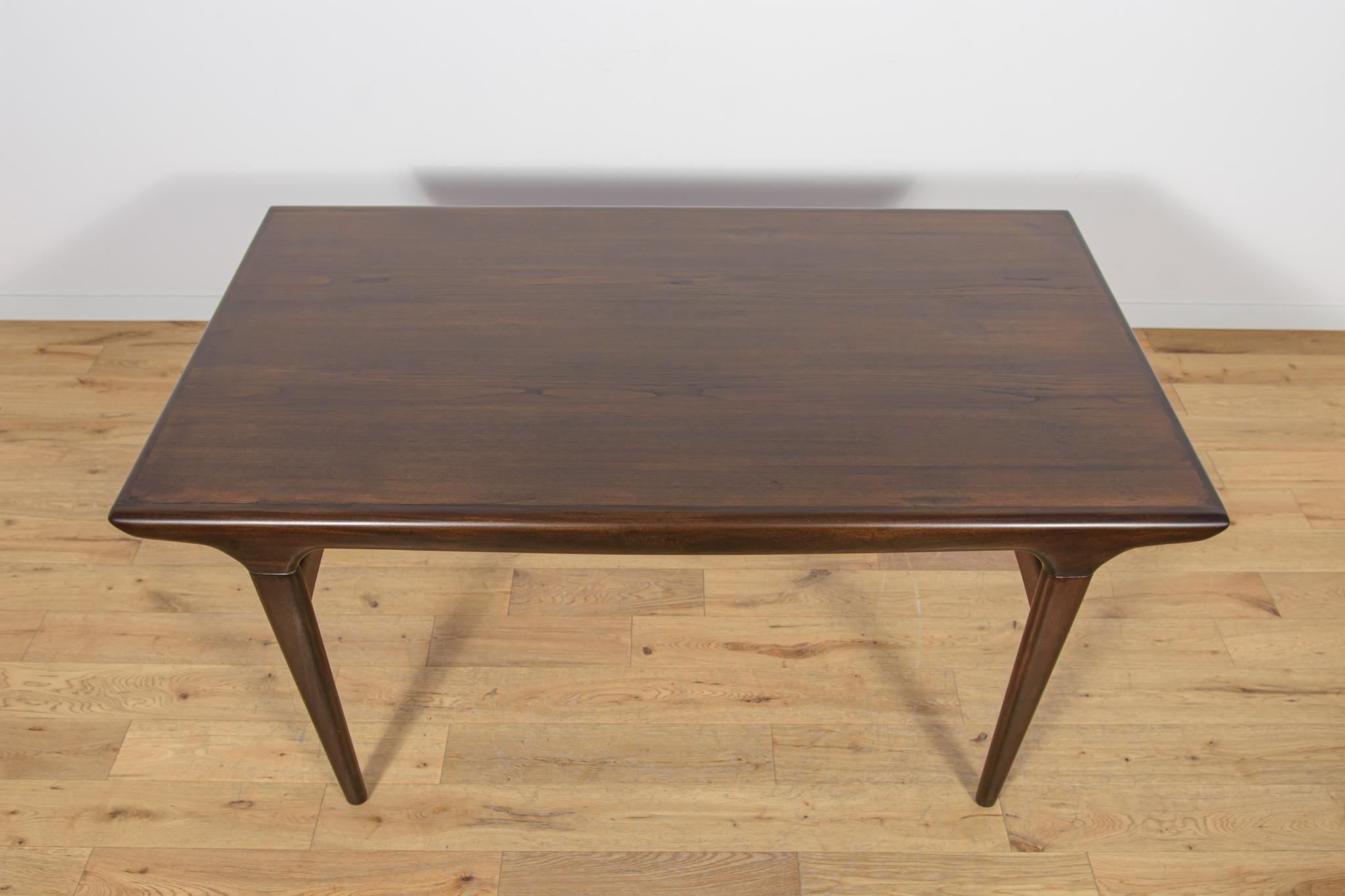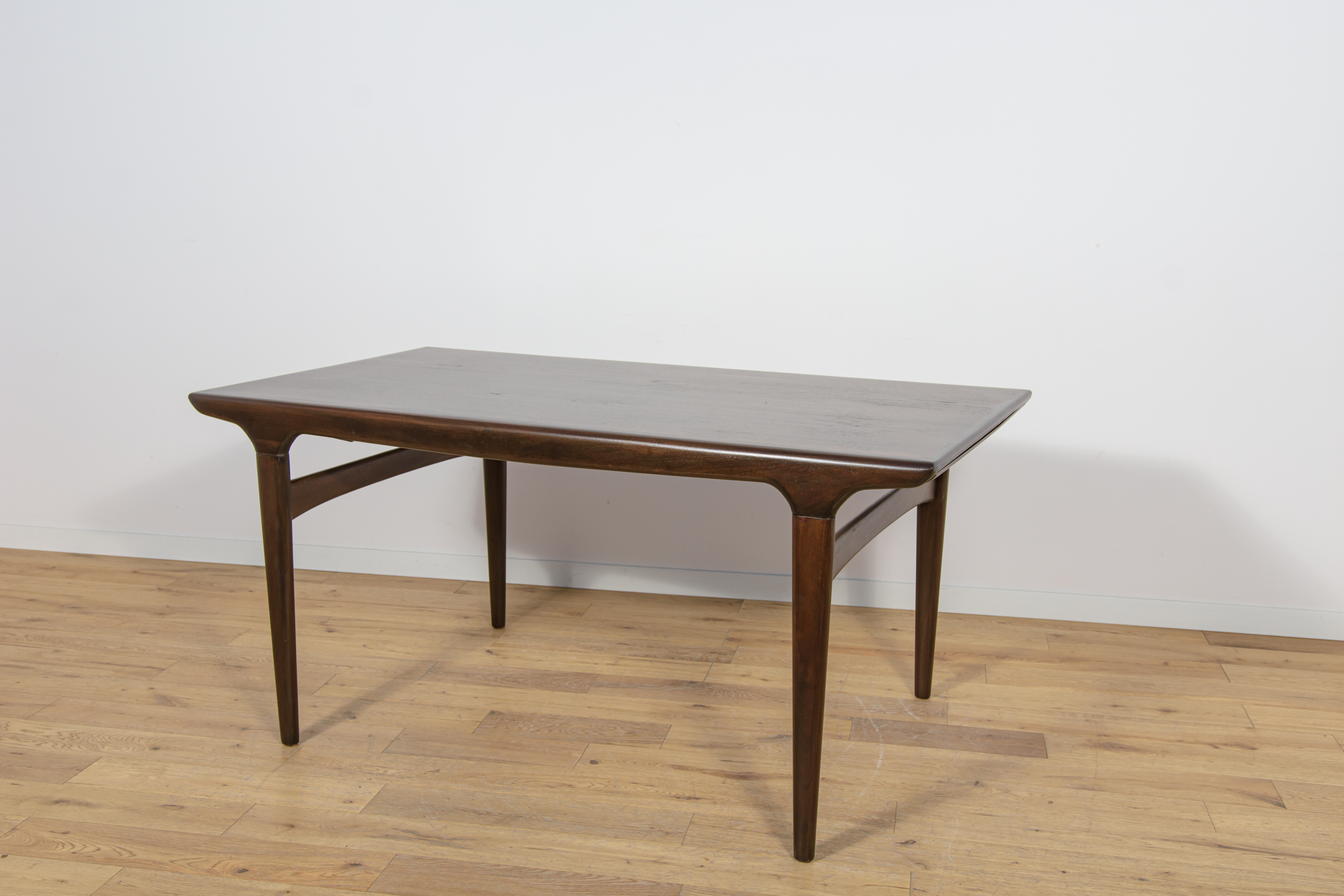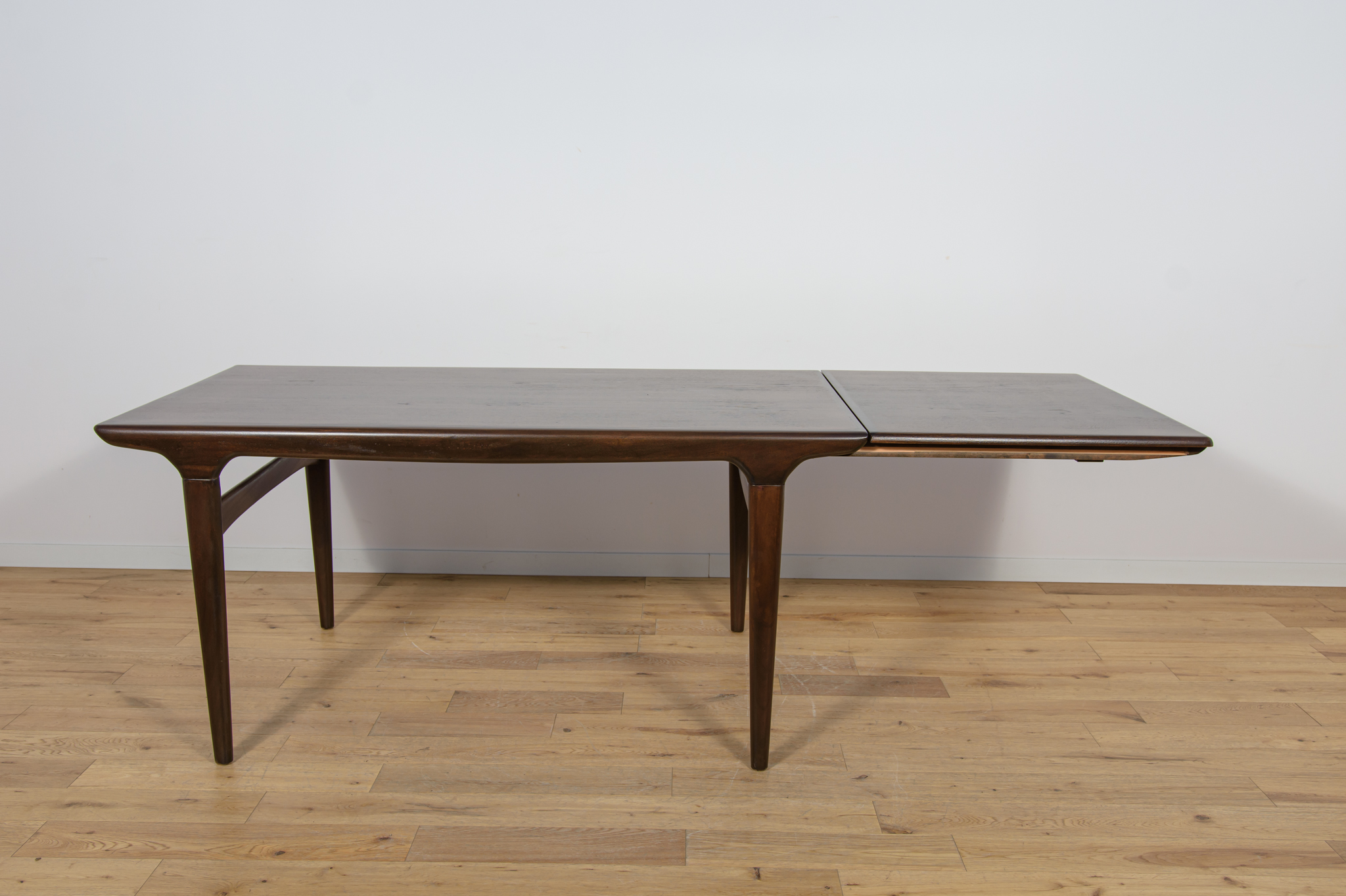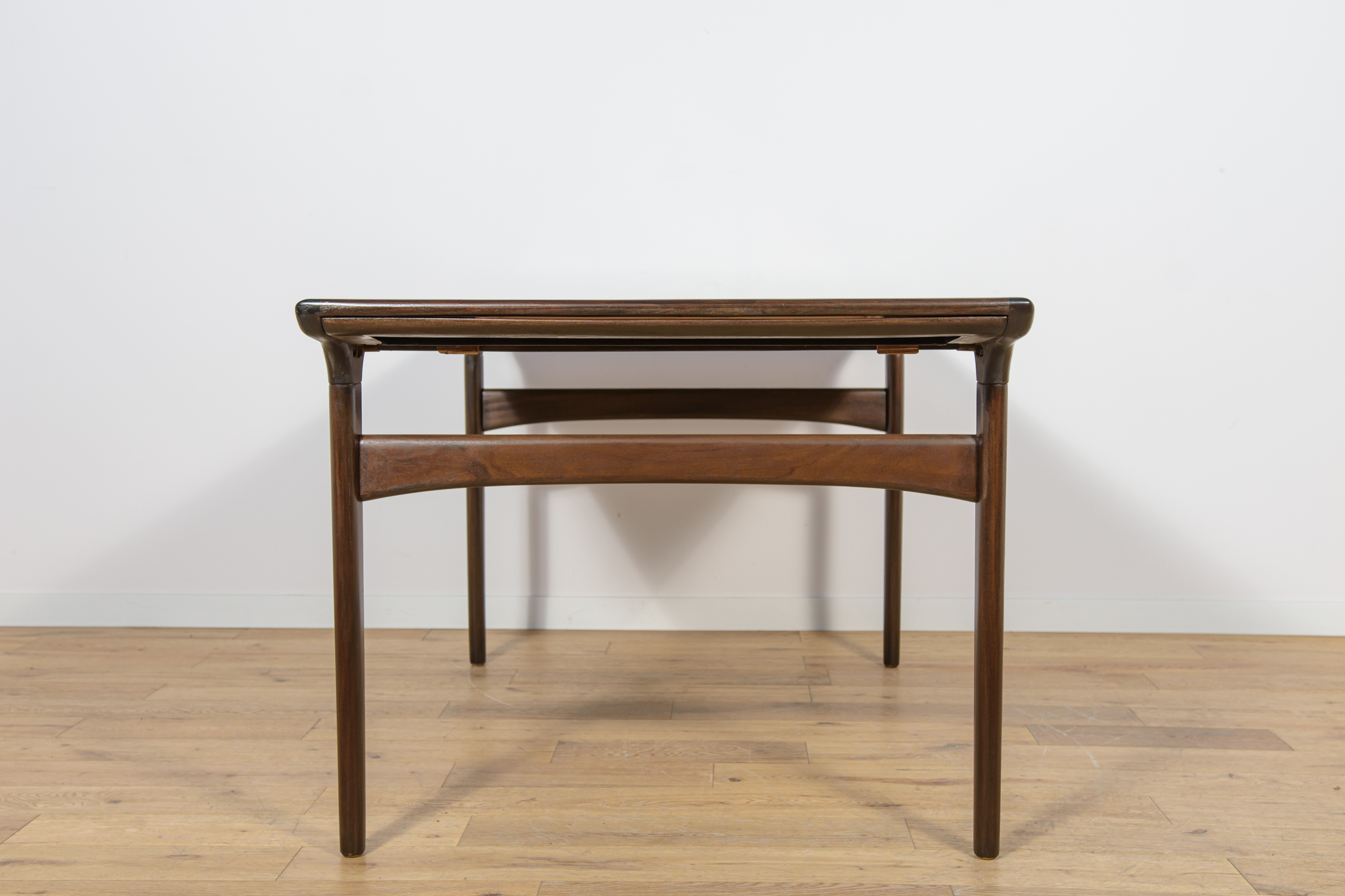 Rozkładany stół z drewna teakowego zaprojektowany w latach 60. przez Johannesa Andersena dla duńskiej manufaktury Uldum Mobelfabrik. Stół o lekkiej wysublimowanej formie, posiada rozszerzenia pozwalający rozszerzyć stół z 153 cm do 221 cm. Stół po kompleksowej renowacji stolarskiej oczyszczony ze starej powierzchni, barwiony bejcą palisandrową, wykończone mocnym półmatowym lakierem.