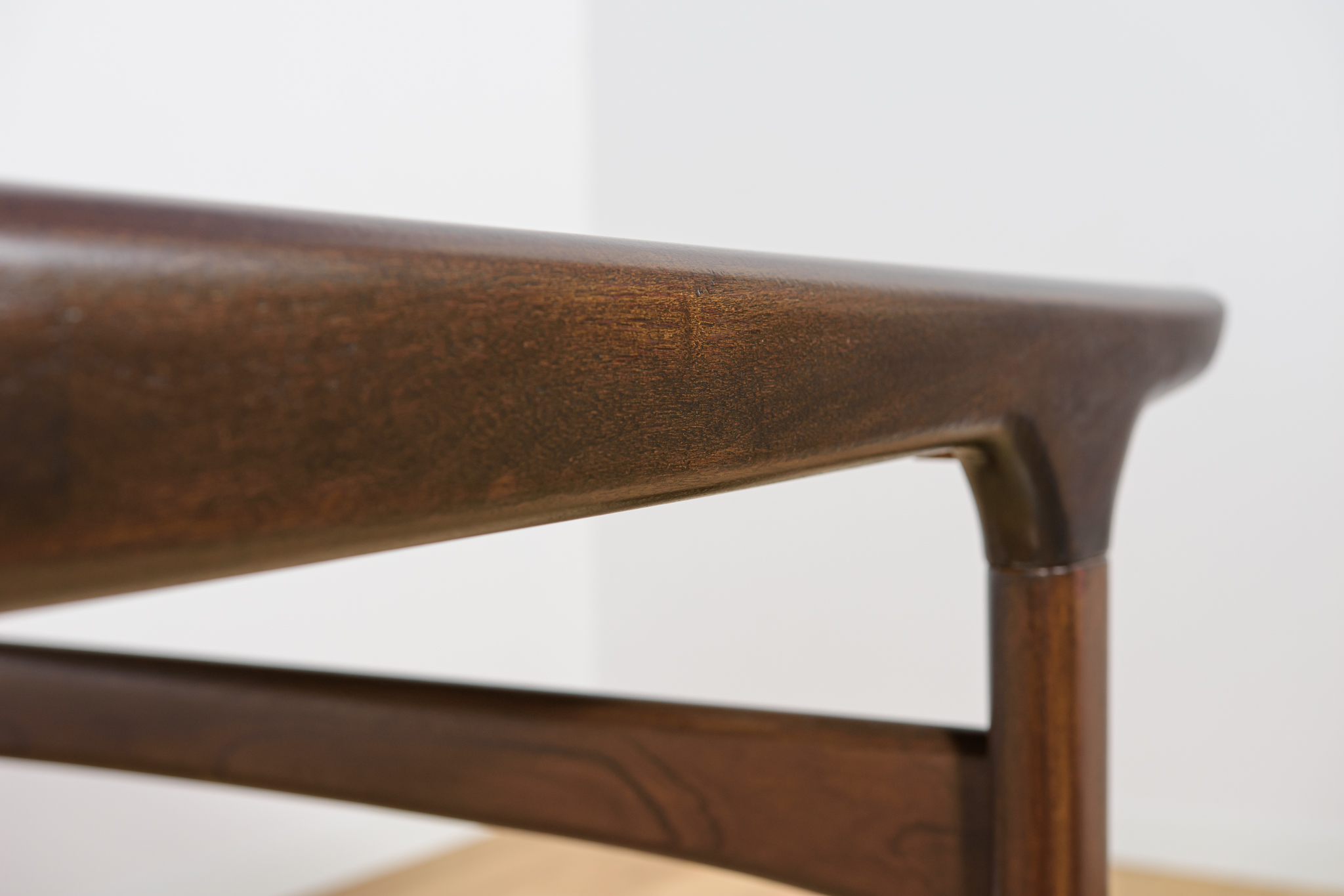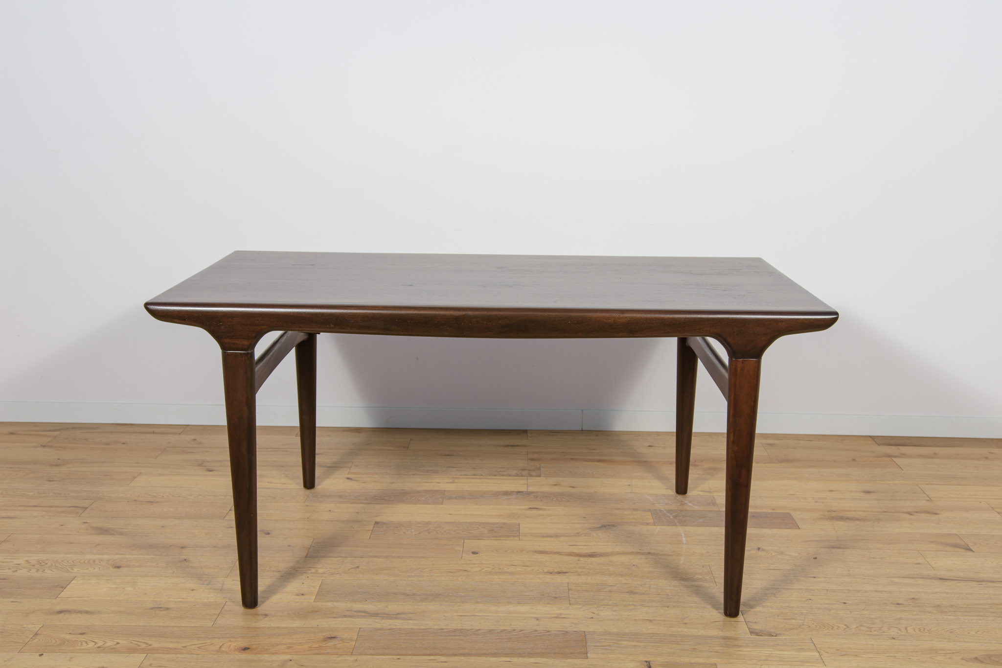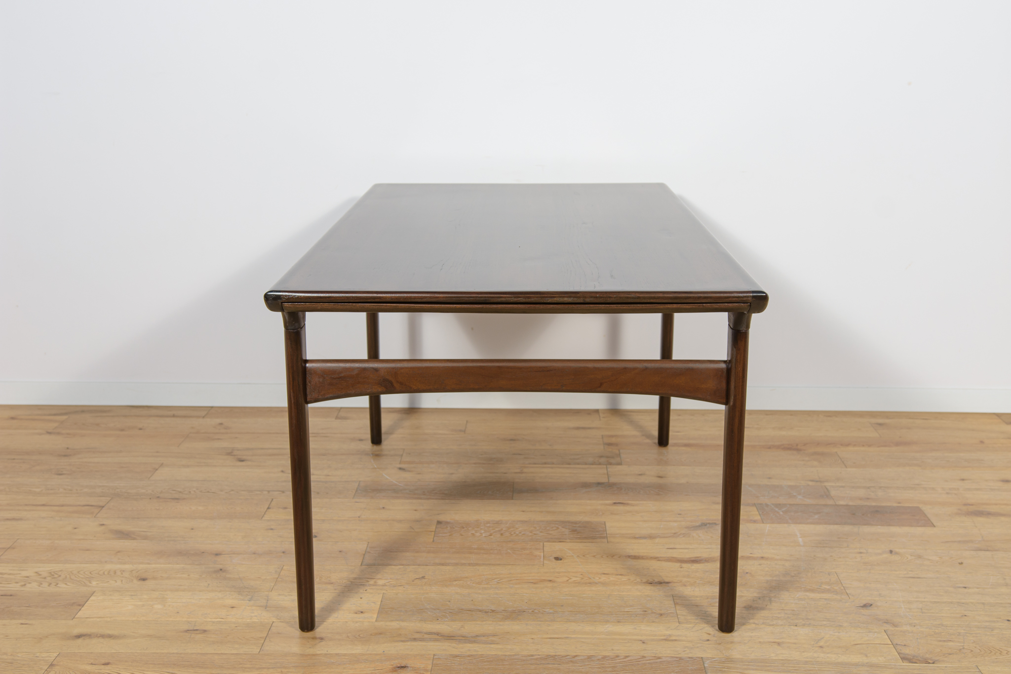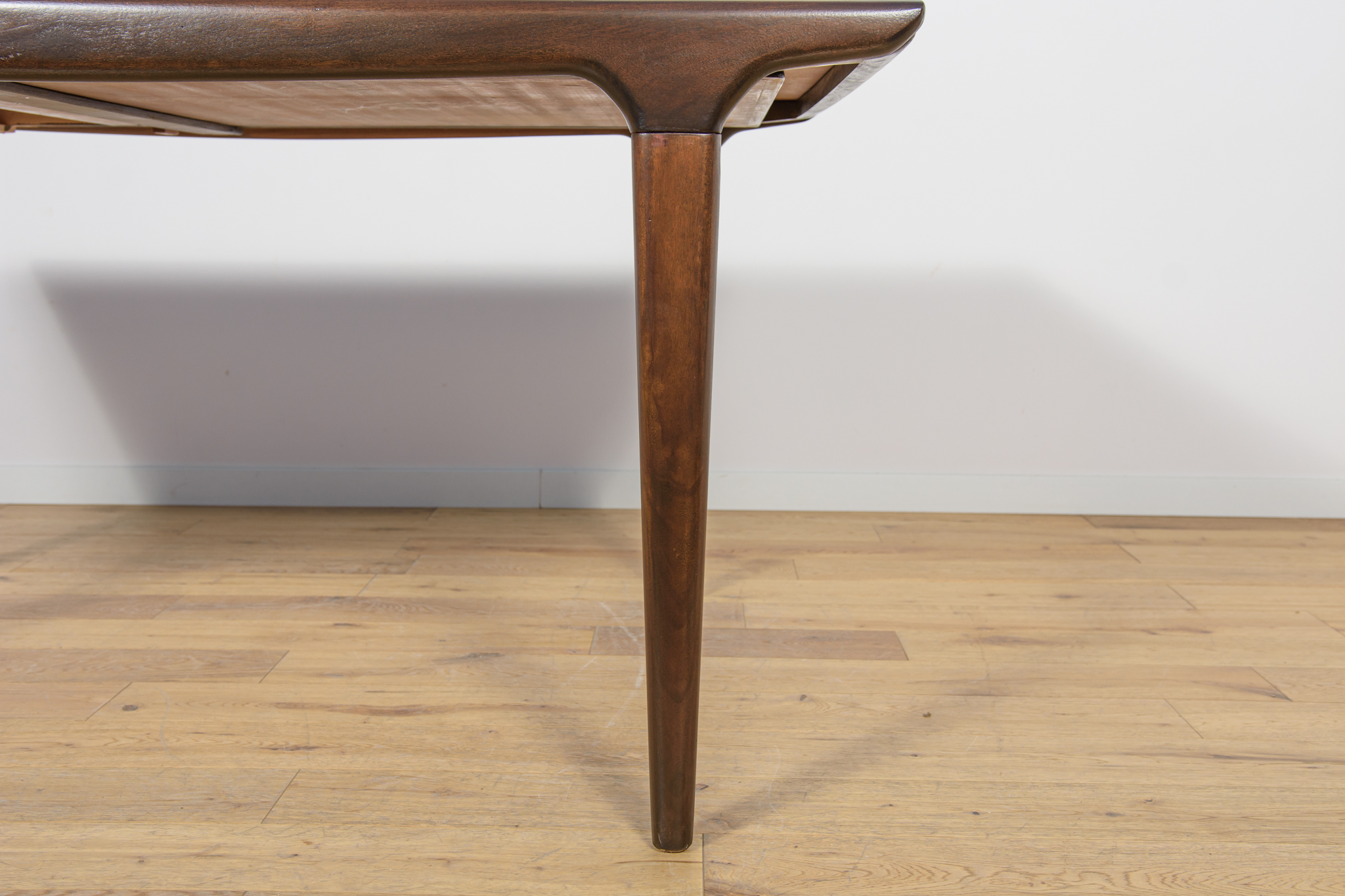 Rozkładany stół z drewna teakowego zaprojektowany w latach 60. przez Johannesa Andersena dla duńskiej manufaktury Uldum Mobelfabrik. Stół o lekkiej wysublimowanej formie, posiada rozszerzenia pozwalający rozszerzyć stół z 153 cm do 221 cm. Stół po kompleksowej renowacji stolarskiej oczyszczony ze starej powierzchni, barwiony bejcą palisandrową, wykończone mocnym półmatowym lakierem.