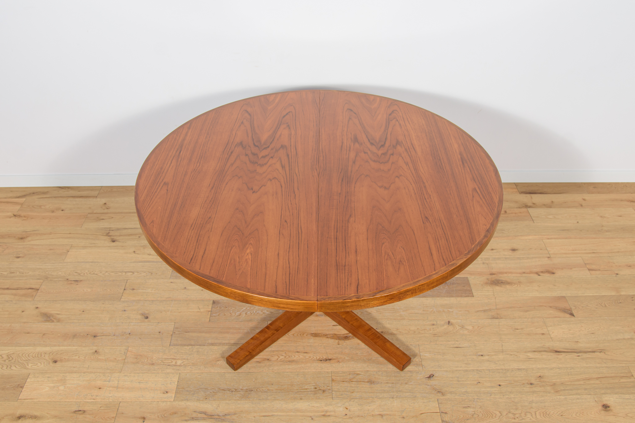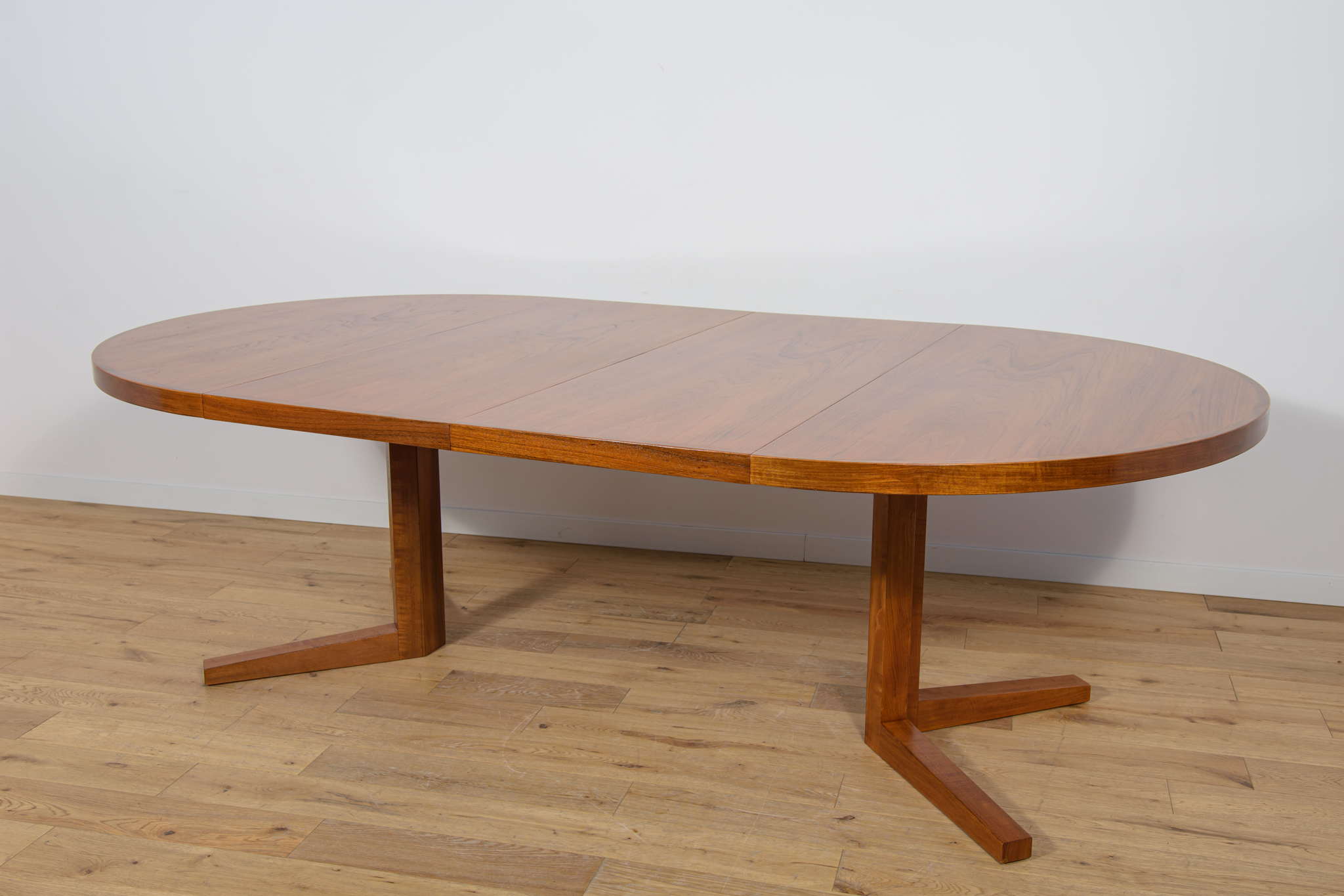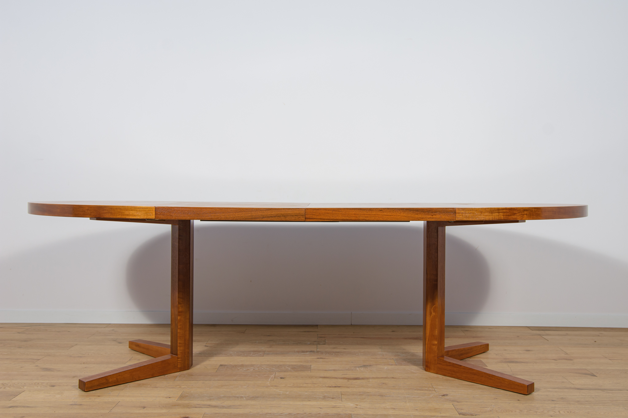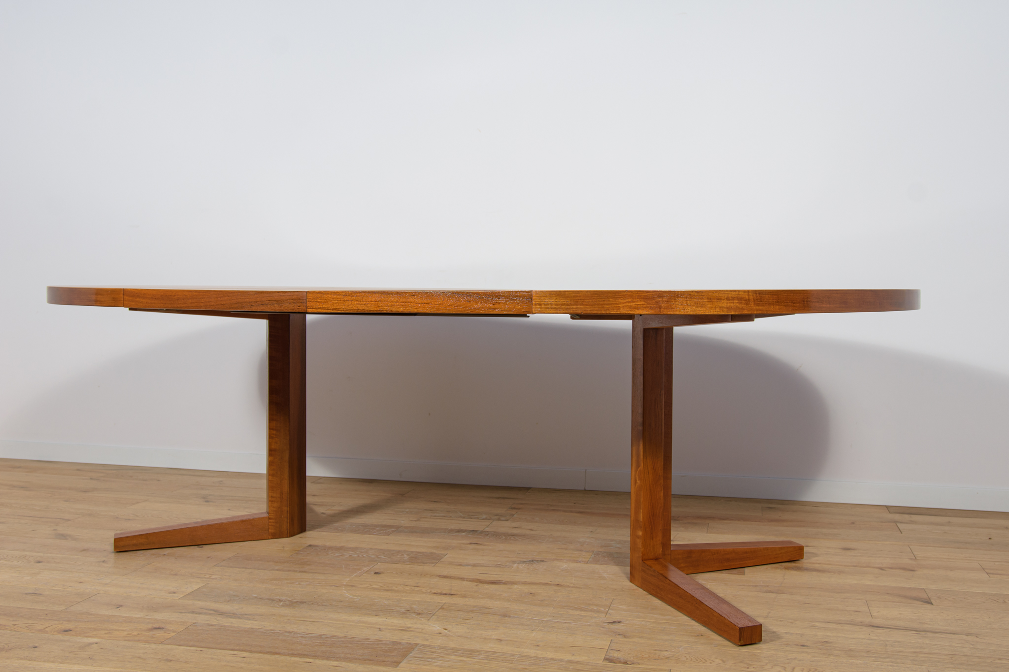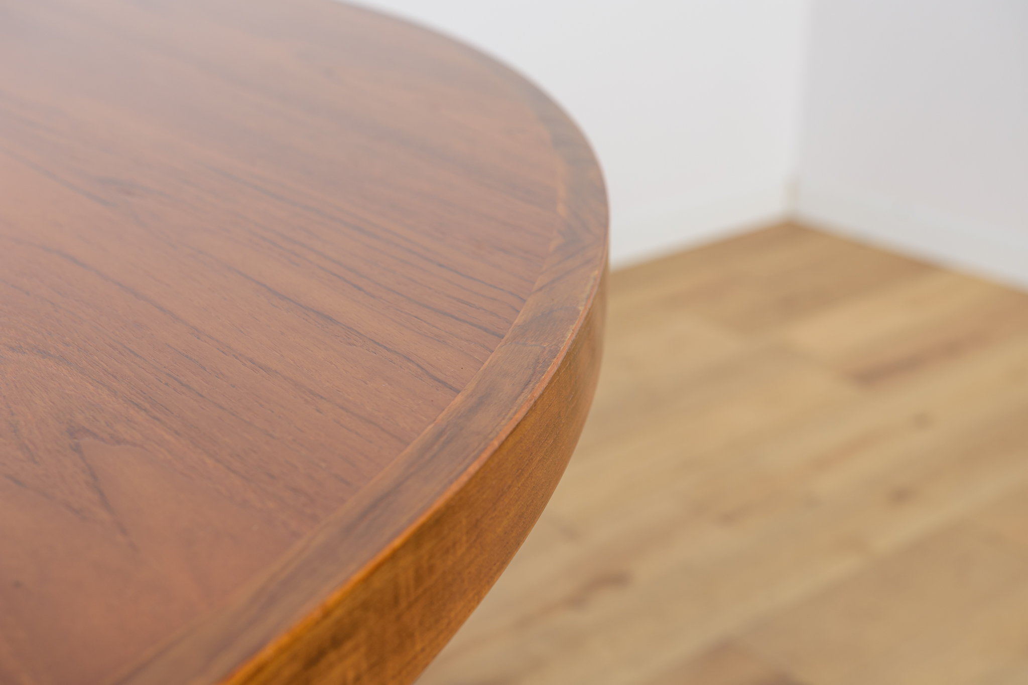 Stół z drewna teak zaprojektowany przez Johna Mortensena dla duńskiej manufaktury Heltborg Mobler w latach 60. Stół charakteryzuje się unikatowym rozwiązaniem podstawy blatu i wzmacnianymi obrzeżami. Długość blatu możliwa do zwiększenia dzięki dwóm przedłużeniom. Średnica początkowa wynosi 130 cm, możliwa do zwiększenia do 180 cm lub 230 cm. Stół jest po renowacji stolarskiej. Oczyszczony ze starej powłoki, wykończony wysokogatunkowym olejem duńskim.