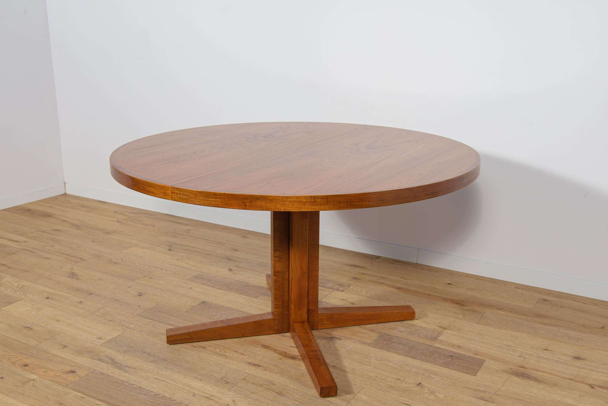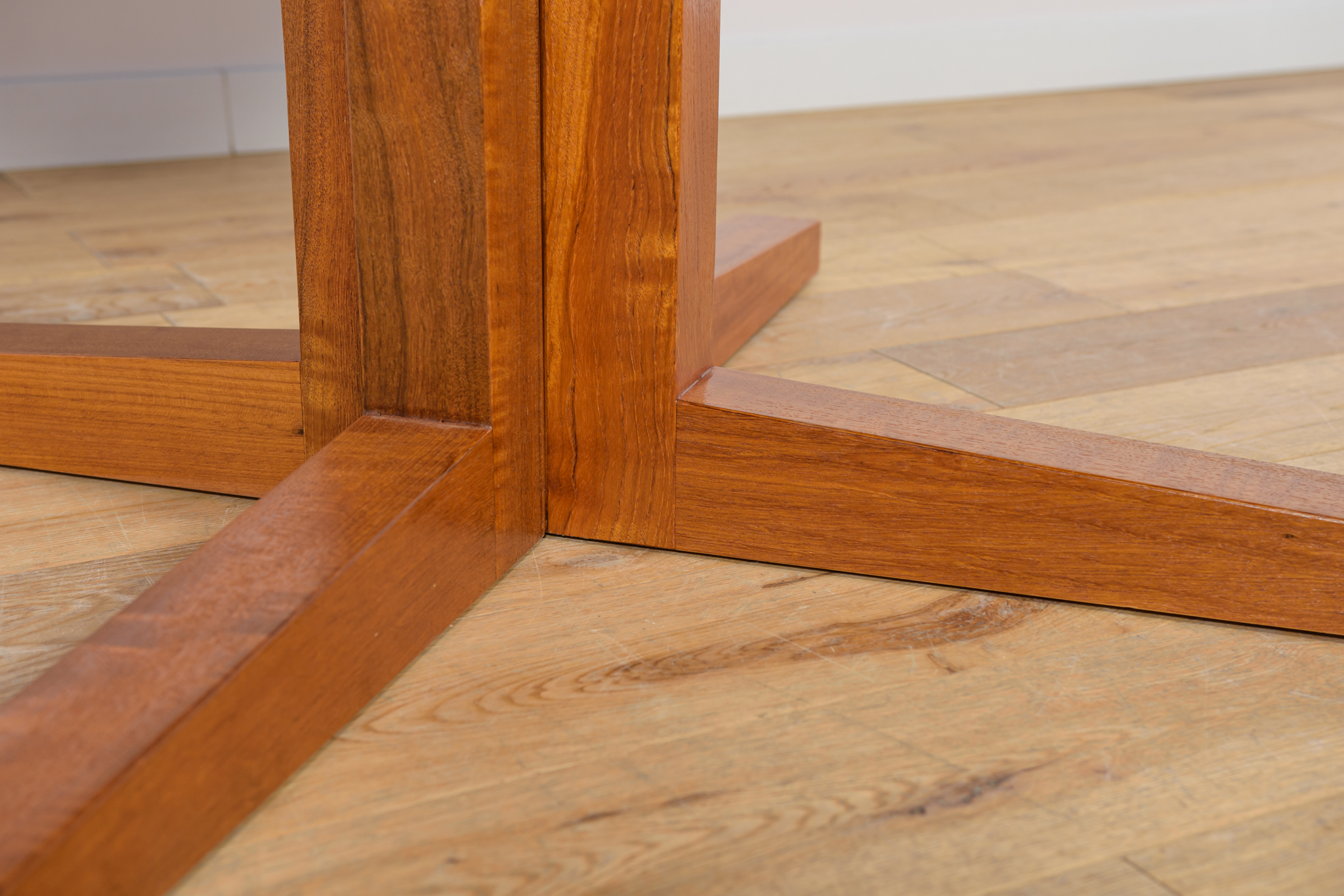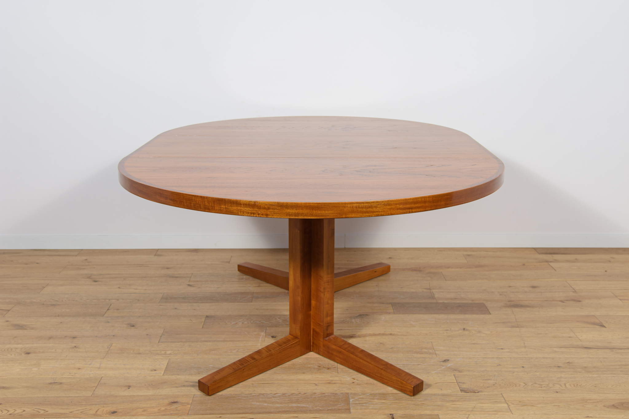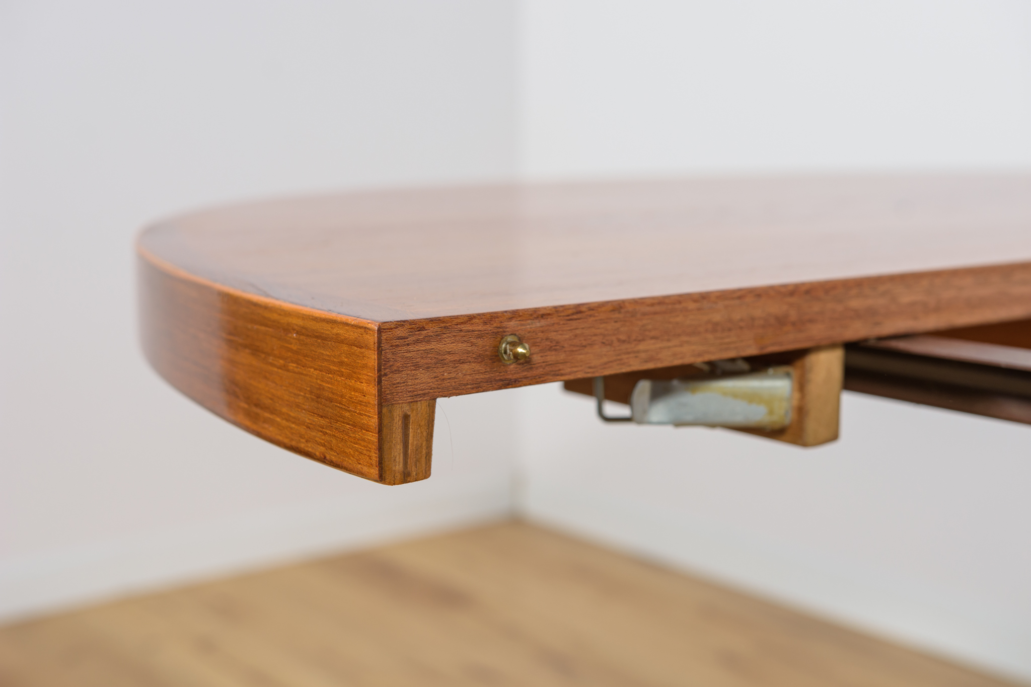 Stół z drewna teak zaprojektowany przez Johna Mortensena dla duńskiej manufaktury Heltborg Mobler w latach 60. Stół charakteryzuje się unikatowym rozwiązaniem podstawy blatu i wzmacnianymi obrzeżami. Długość blatu możliwa do zwiększenia dzięki dwóm przedłużeniom. Średnica początkowa wynosi 130 cm, możliwa do zwiększenia do 180 cm lub 230 cm. Stół jest po renowacji stolarskiej. Oczyszczony ze starej powłoki, wykończony wysokogatunkowym olejem duńskim.