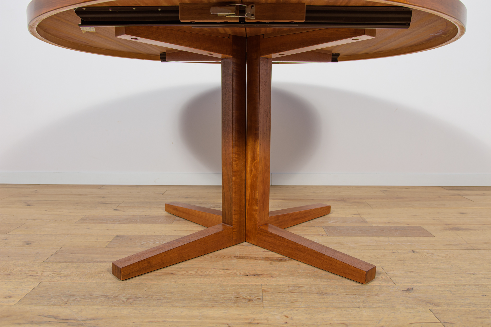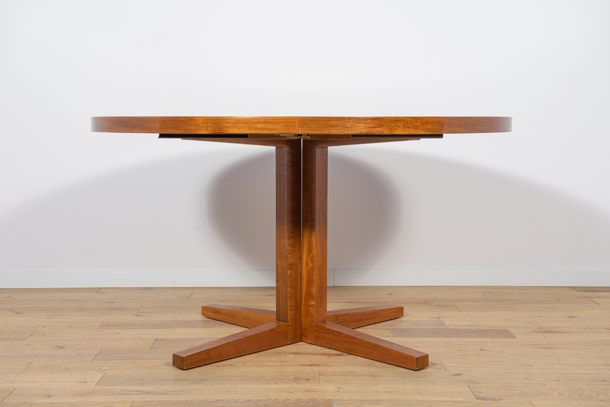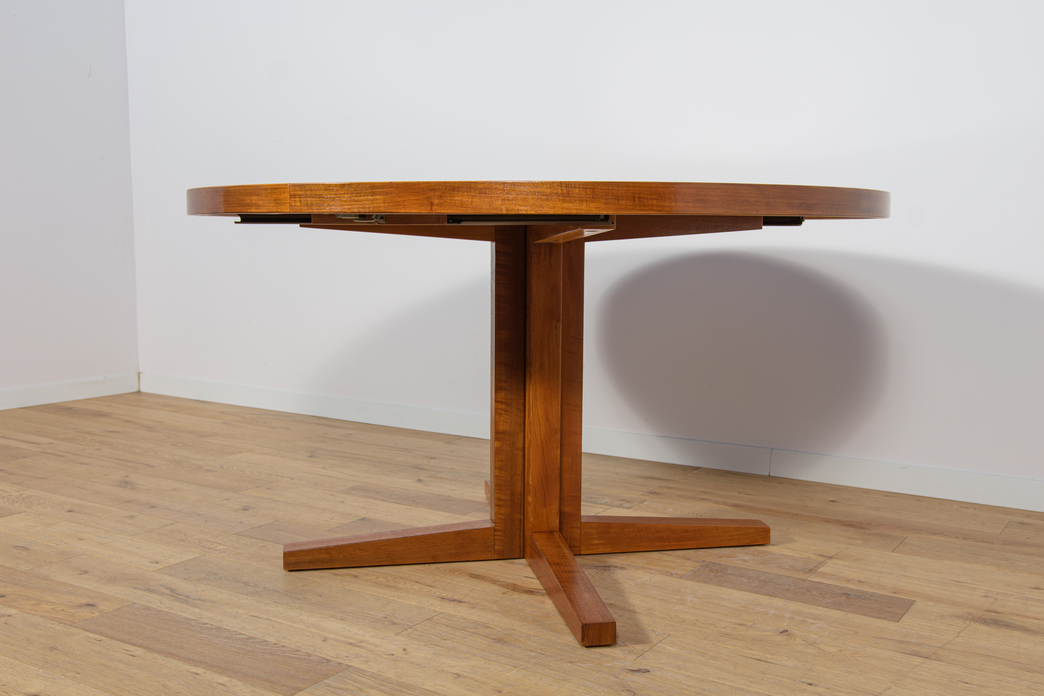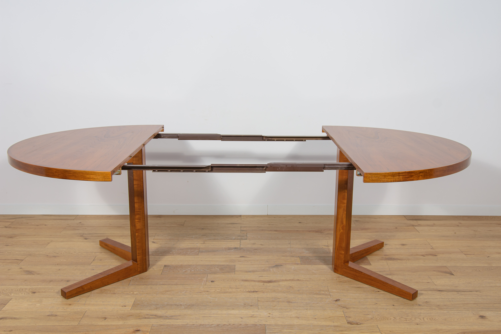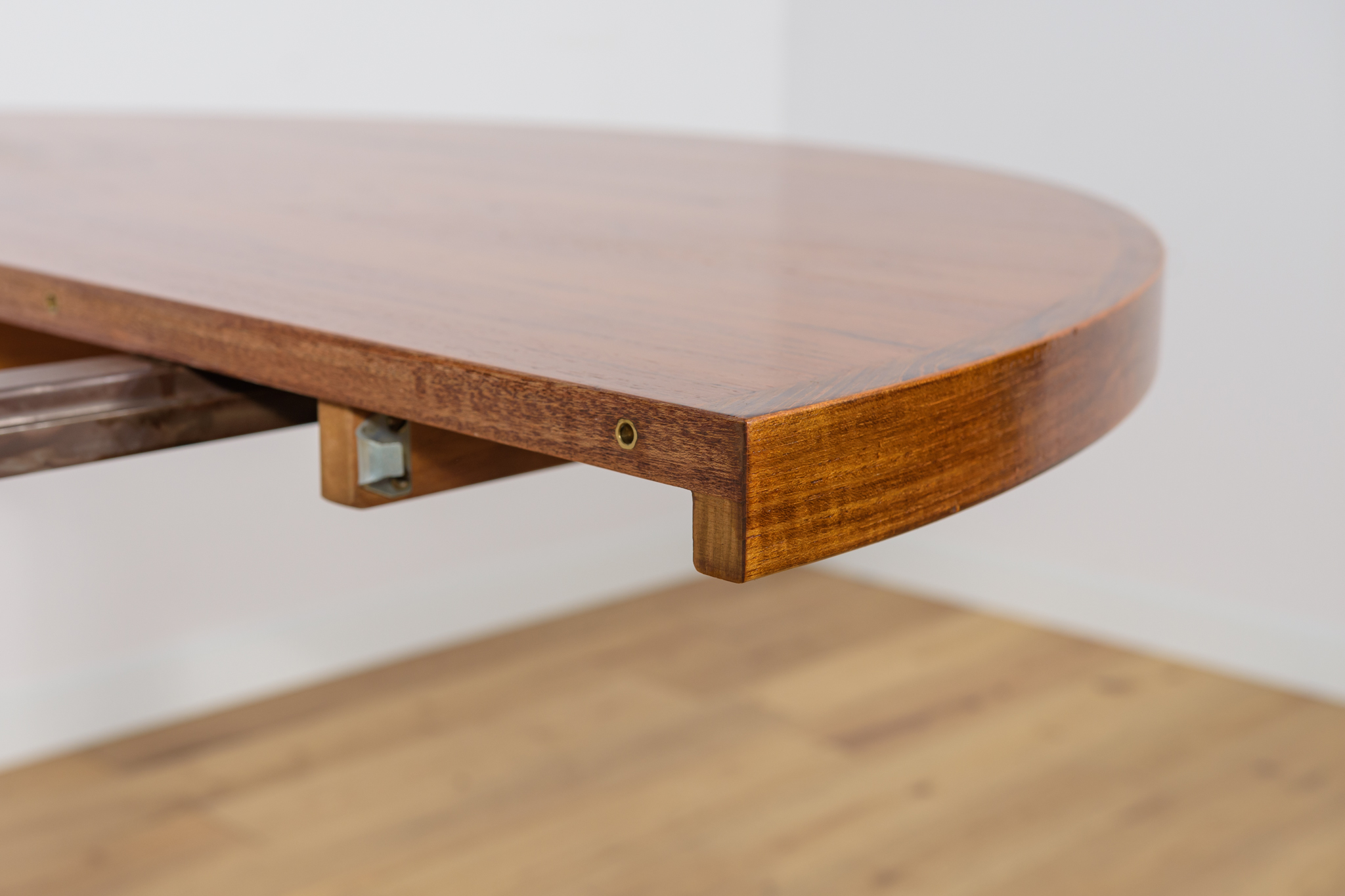 Stół z drewna teak zaprojektowany przez Johna Mortensena dla duńskiej manufaktury Heltborg Mobler w latach 60. Stół charakteryzuje się unikatowym rozwiązaniem podstawy blatu i wzmacnianymi obrzeżami. Długość blatu możliwa do zwiększenia dzięki dwóm przedłużeniom. Średnica początkowa wynosi 130 cm, możliwa do zwiększenia do 180 cm lub 230 cm. Stół jest po renowacji stolarskiej. Oczyszczony ze starej powłoki, wykończony wysokogatunkowym olejem duńskim.