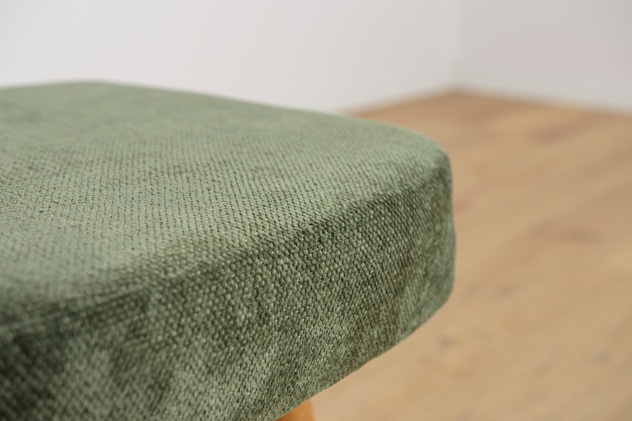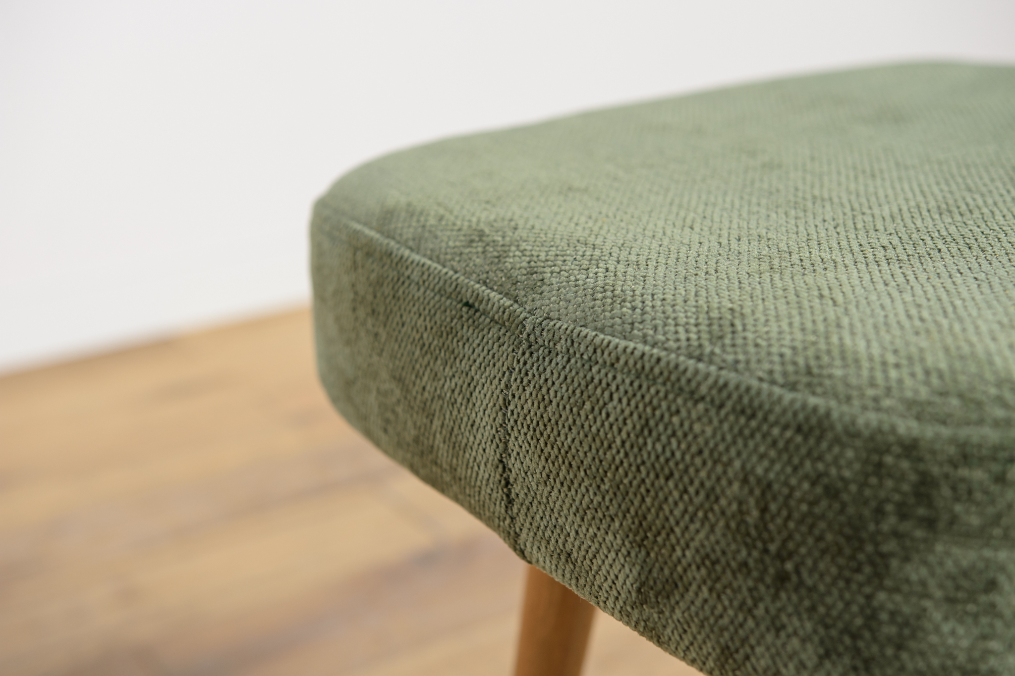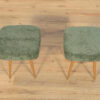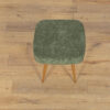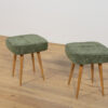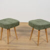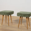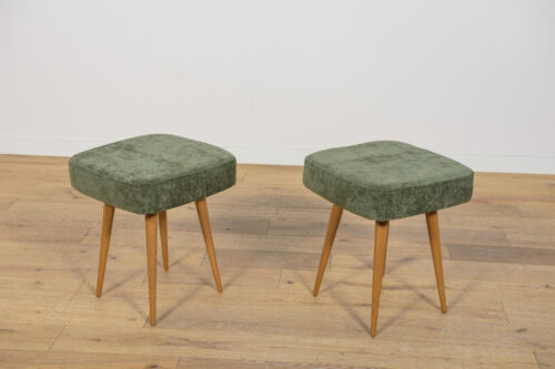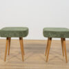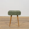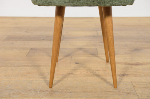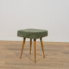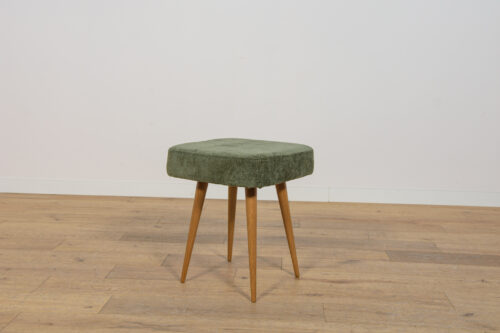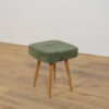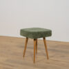 Stołek ,taboret wyprodukowany w Polsce w latach 70 – tych ubiegłego wieku. Nogi z drewna bukowego zostały oczyszczona ze starej powierzchni, barwione bejcę dębową, wykończone lakierem. Wnętrza tapicerskie zostały wymienione, obite wysokogatunkową tkaniną w kolorze zielonym.
