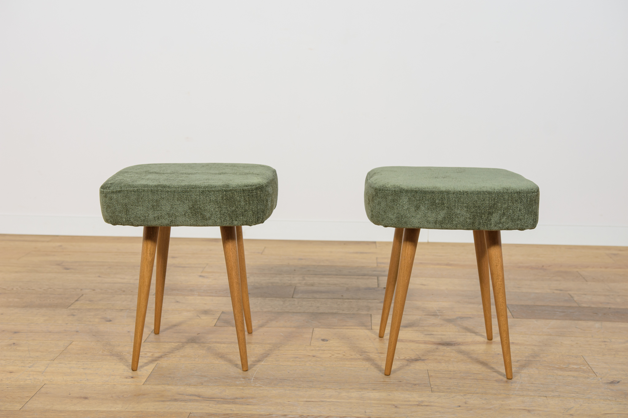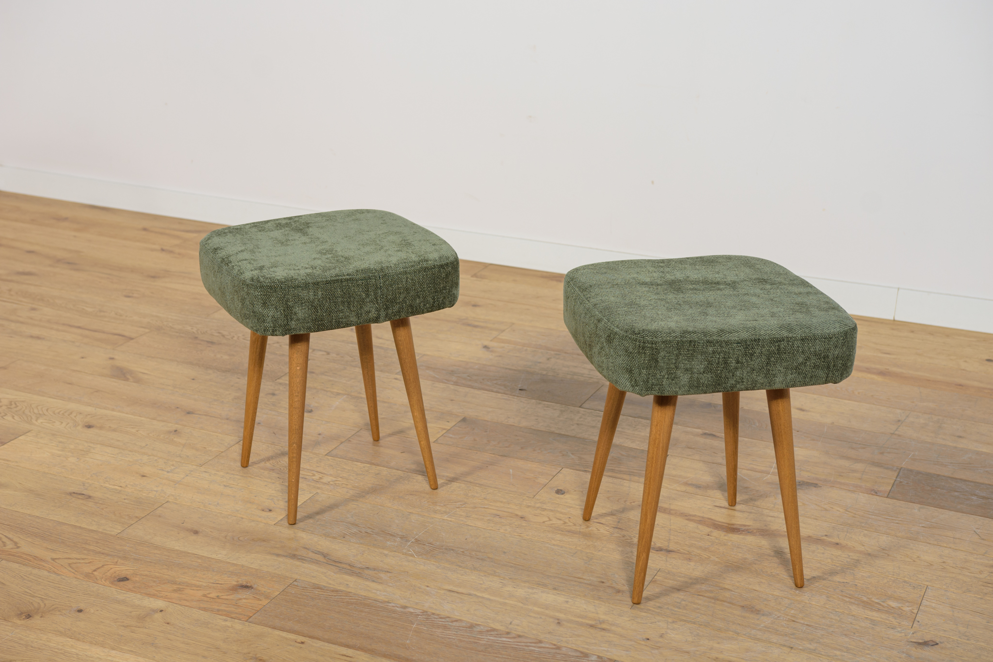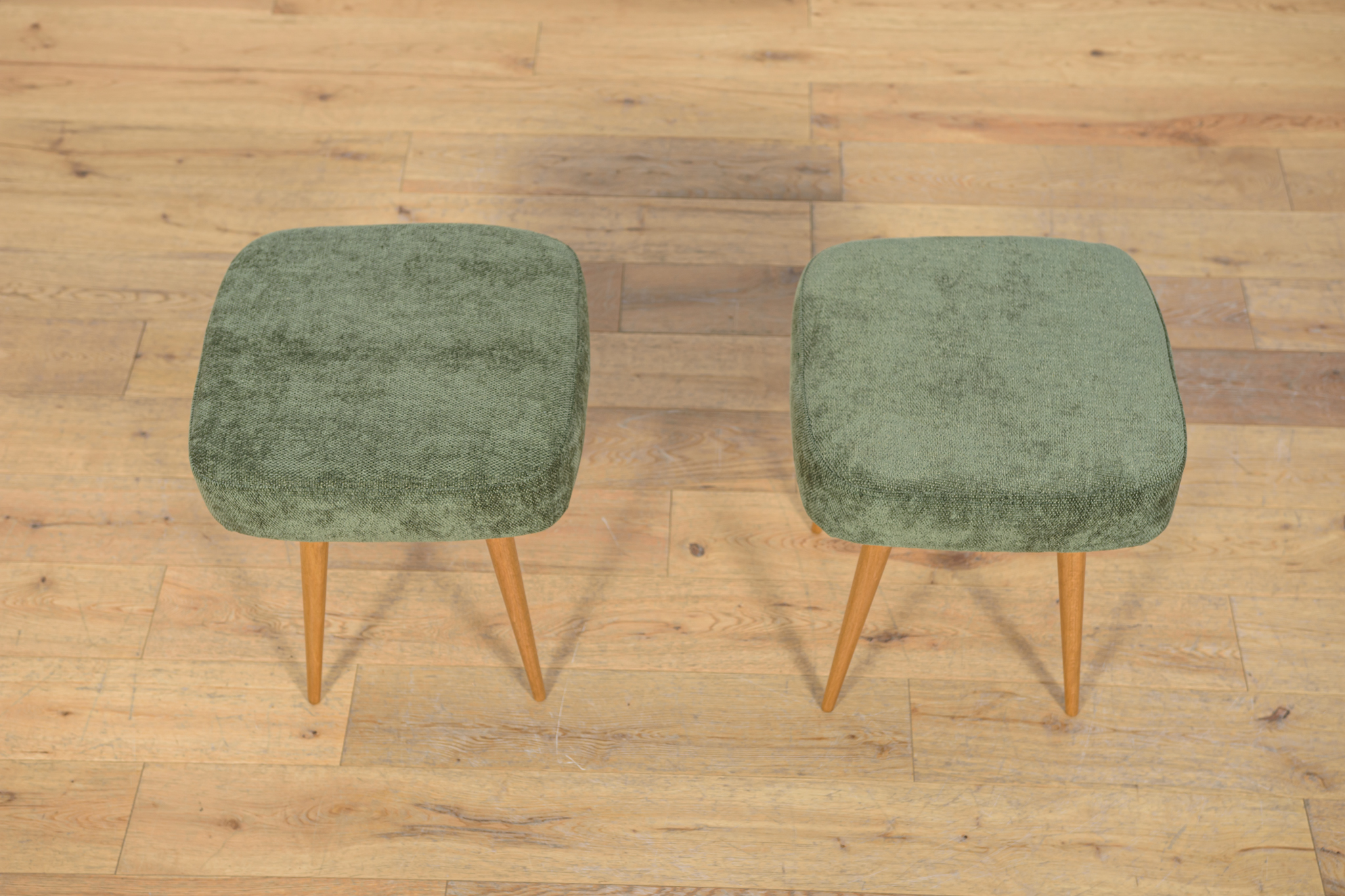 Stołek ,taboret wyprodukowany w Polsce w latach 70 – tych ubiegłego wieku. Nogi z drewna bukowego zostały oczyszczona ze starej powierzchni, barwione bejcę dębową, wykończone lakierem. Wnętrza tapicerskie zostały wymienione, obite wysokogatunkową tkaniną w kolorze zielonym.