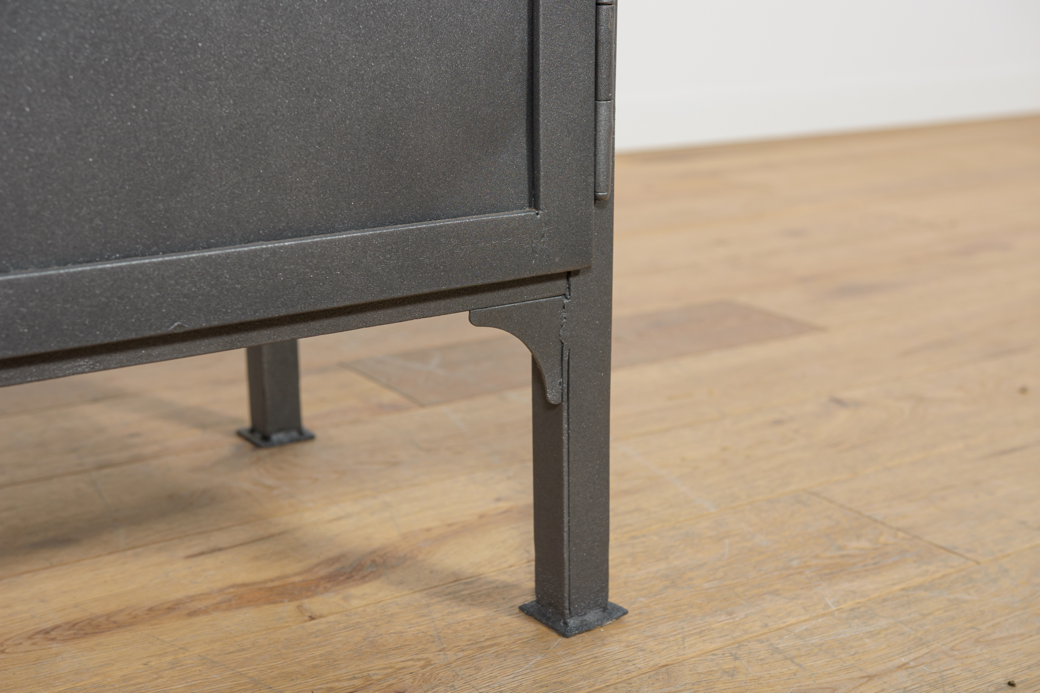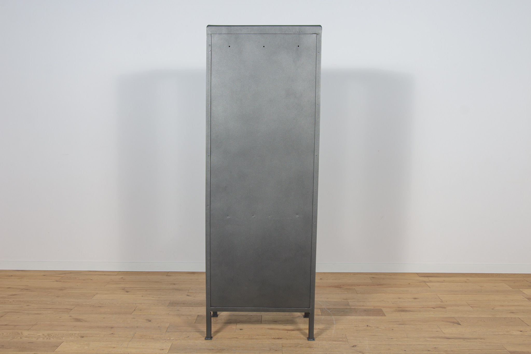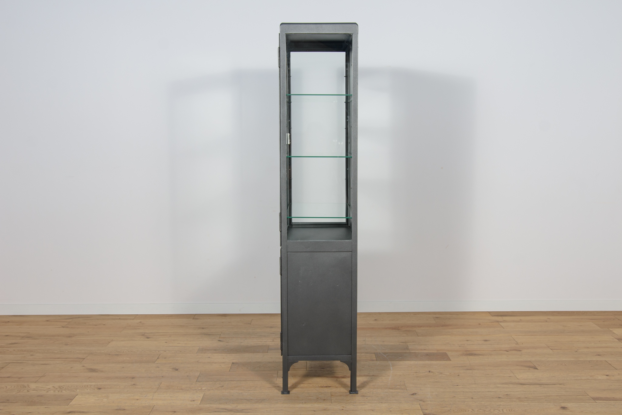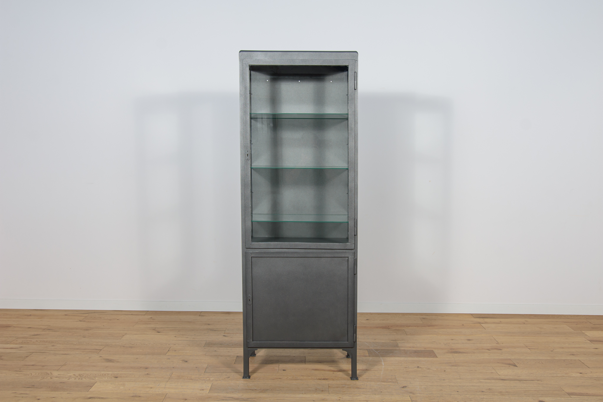 Szafa medyczna z lat 50. po renowacji. W górnej części znajdują się otwarte szklane półki, w dolnej części znajduje się zamknięta szafka z trzema pólkami. Oczyszczona z starej powierzchni, pomalowana proszkowo w kolorze stalowym. Szyby zostały wymienione na nowe.