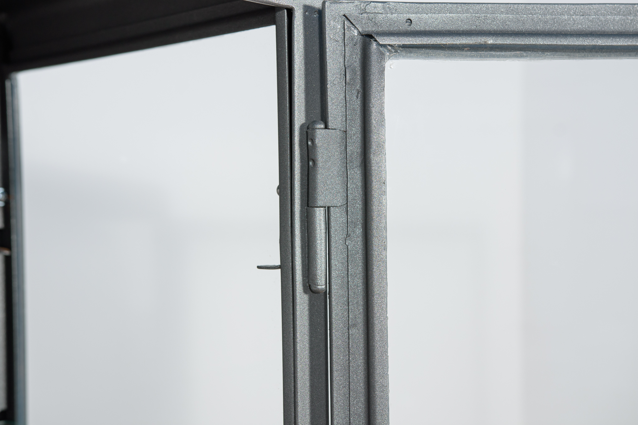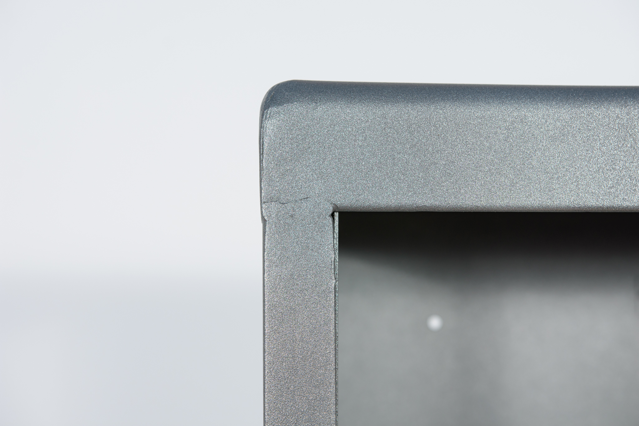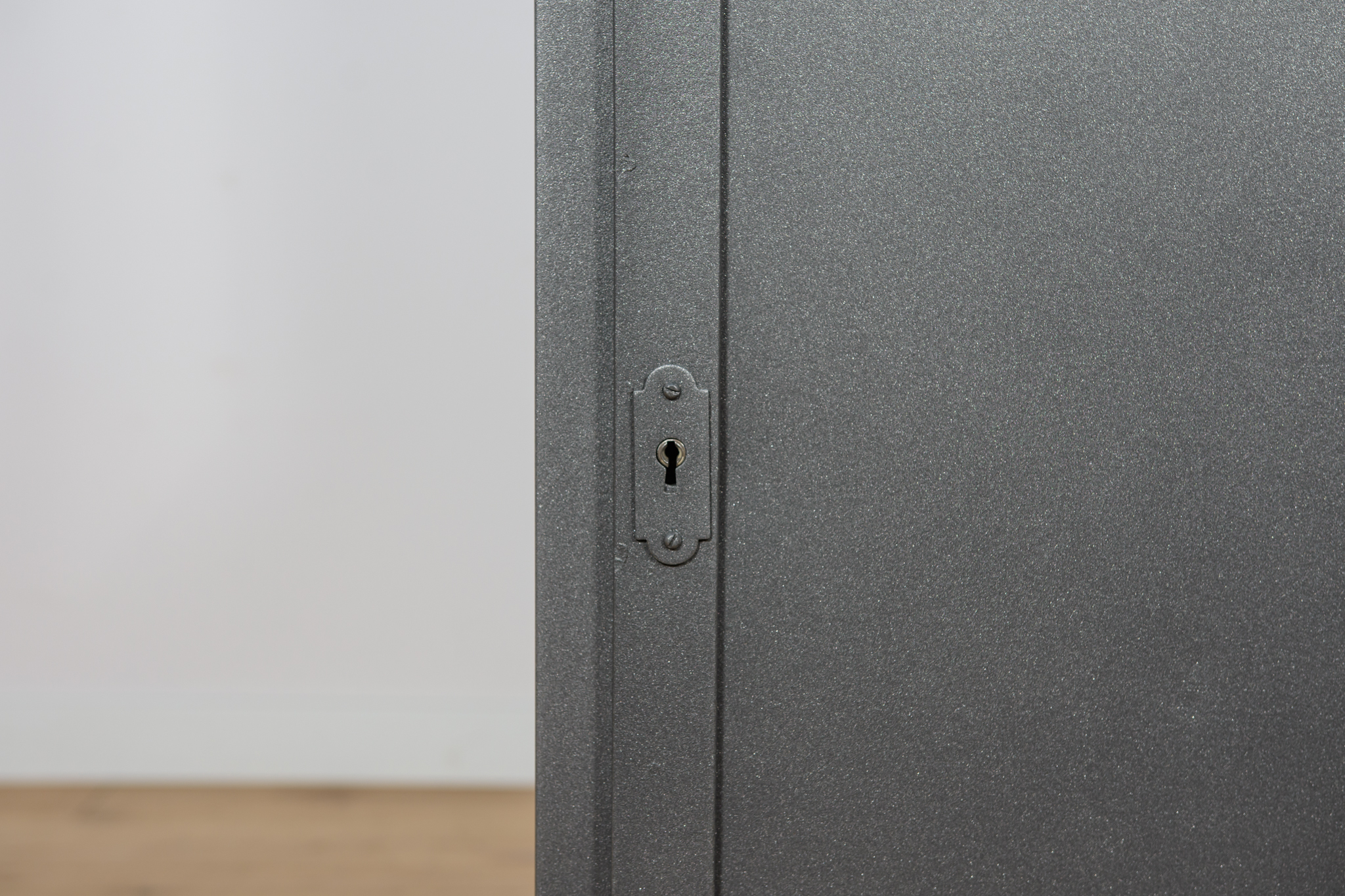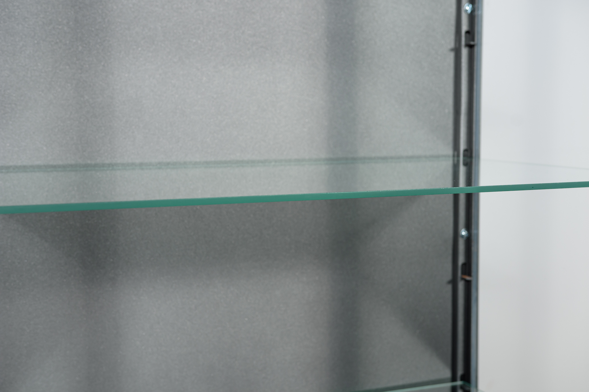 Szafa medyczna z lat 50. po renowacji. W górnej części znajdują się otwarte szklane półki, w dolnej części znajduje się zamknięta szafka z trzema pólkami. Oczyszczona z starej powierzchni, pomalowana proszkowo w kolorze stalowym. Szyby zostały wymienione na nowe.